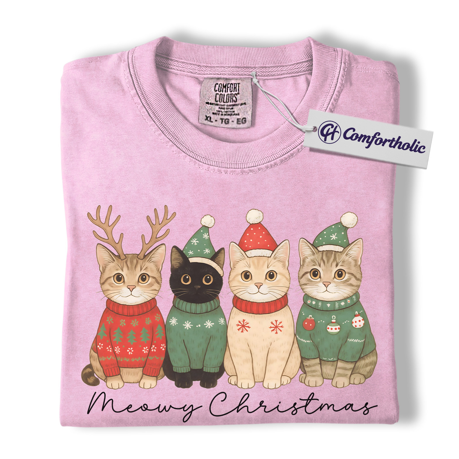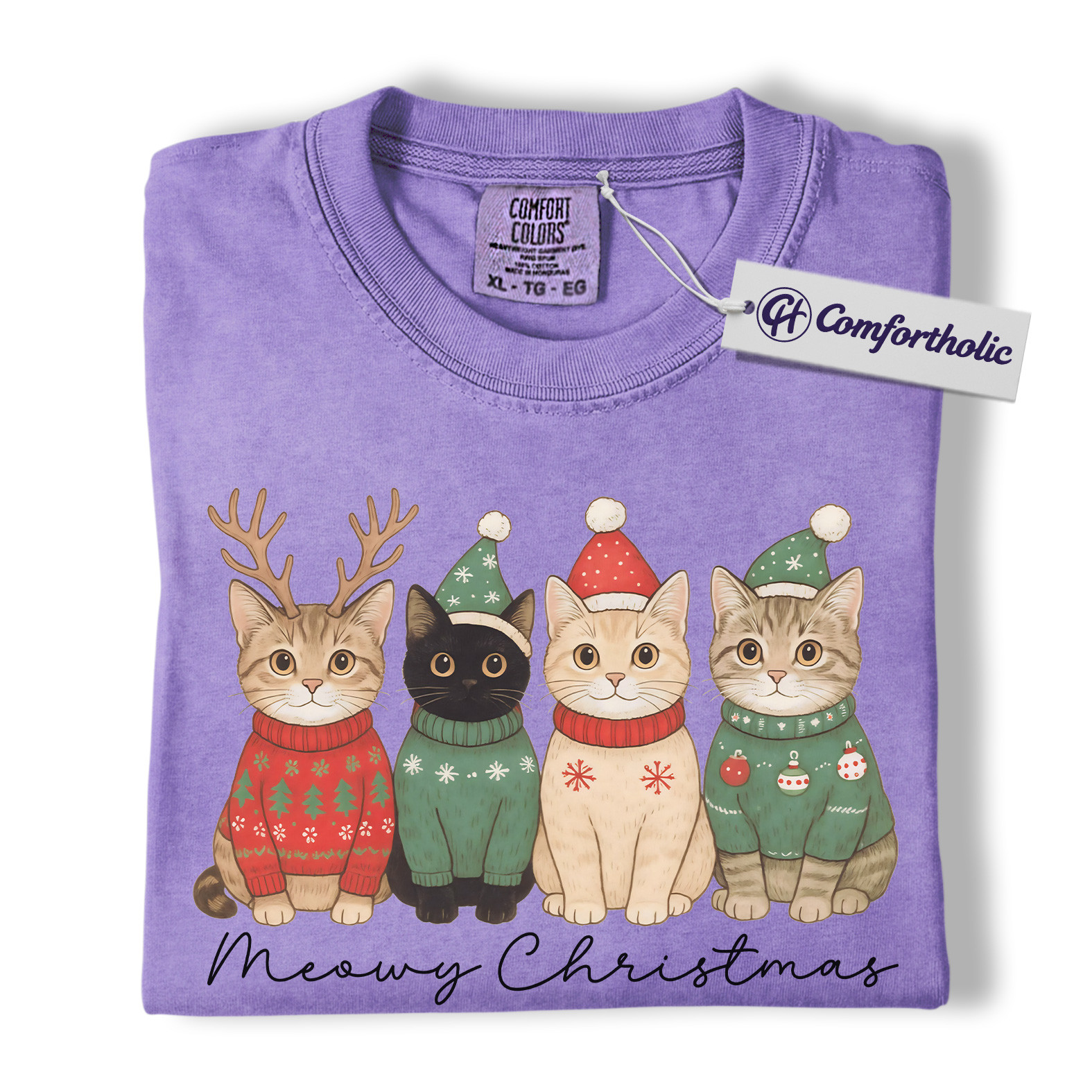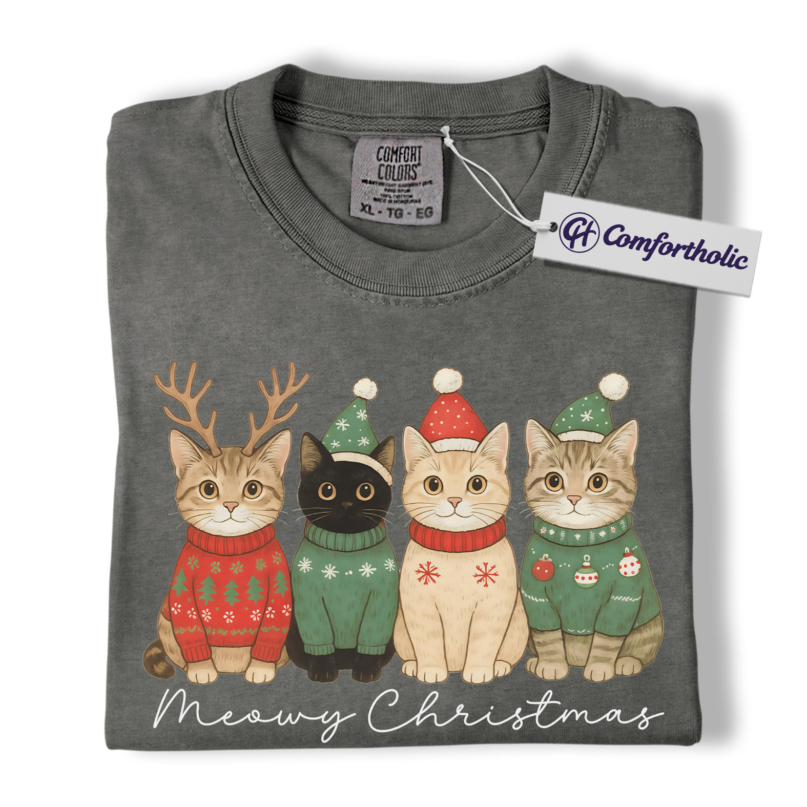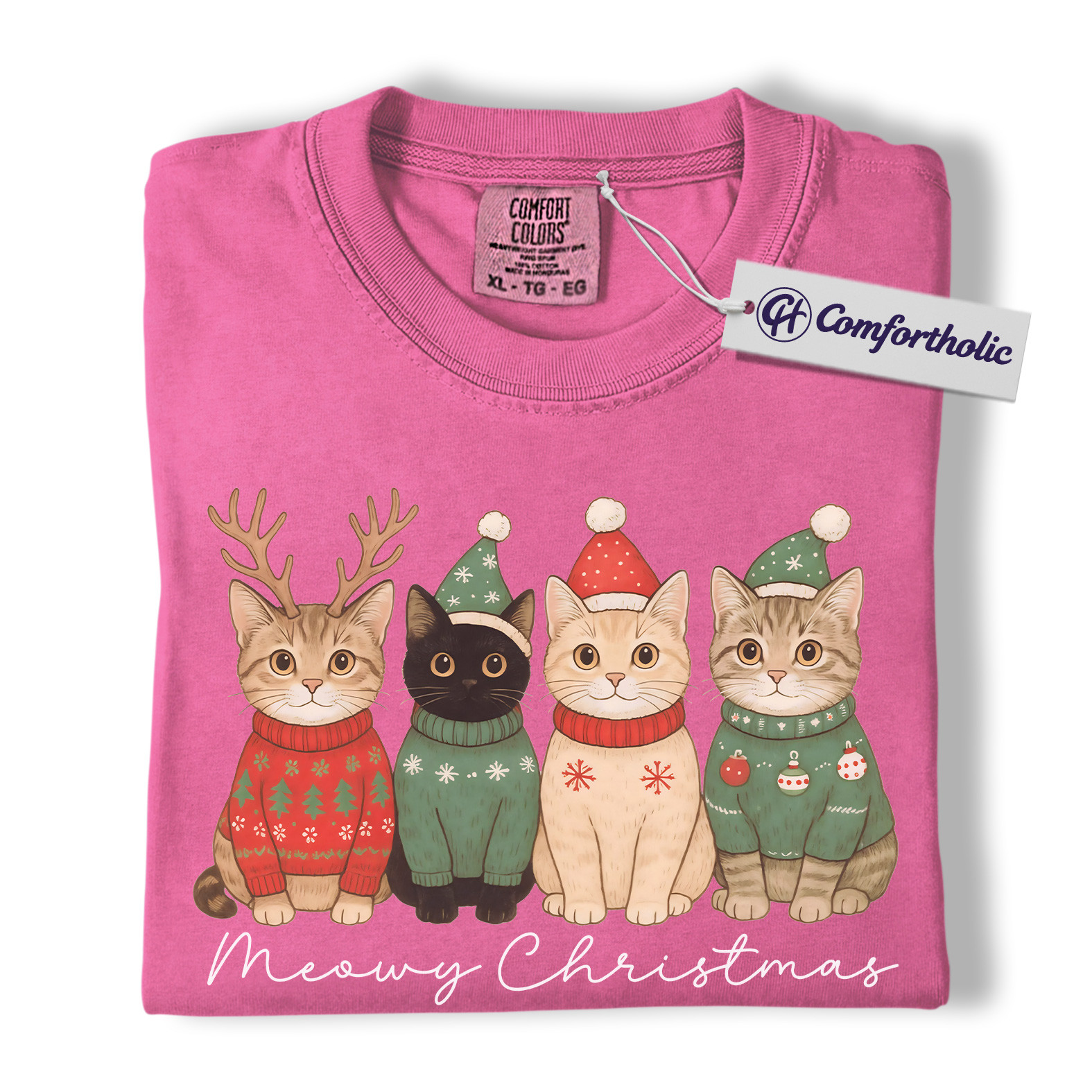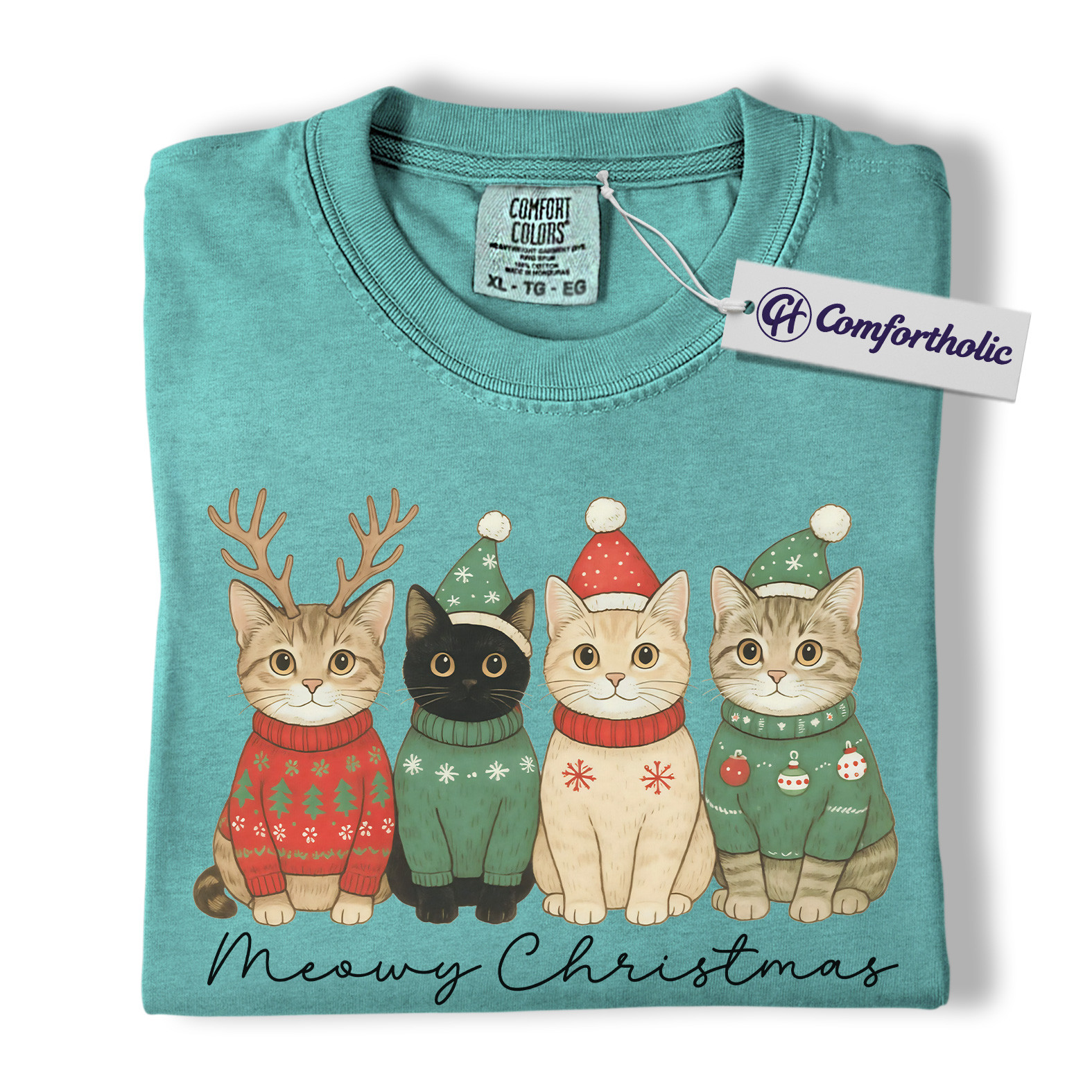 Meowy Christmas Cat Shirt, Cute Holiday Kitten T-Shirt, Funny Cat Lover Christmas Graphic Tee, Festive Pet Gift for Cat Moms, Comfort Colors Shirt