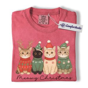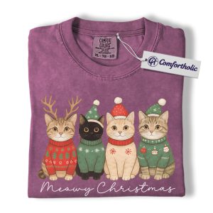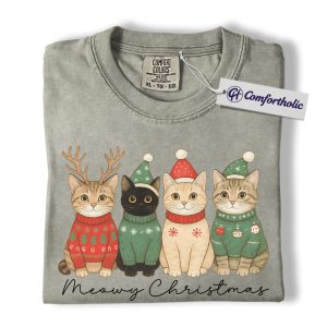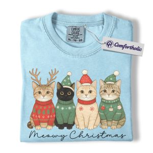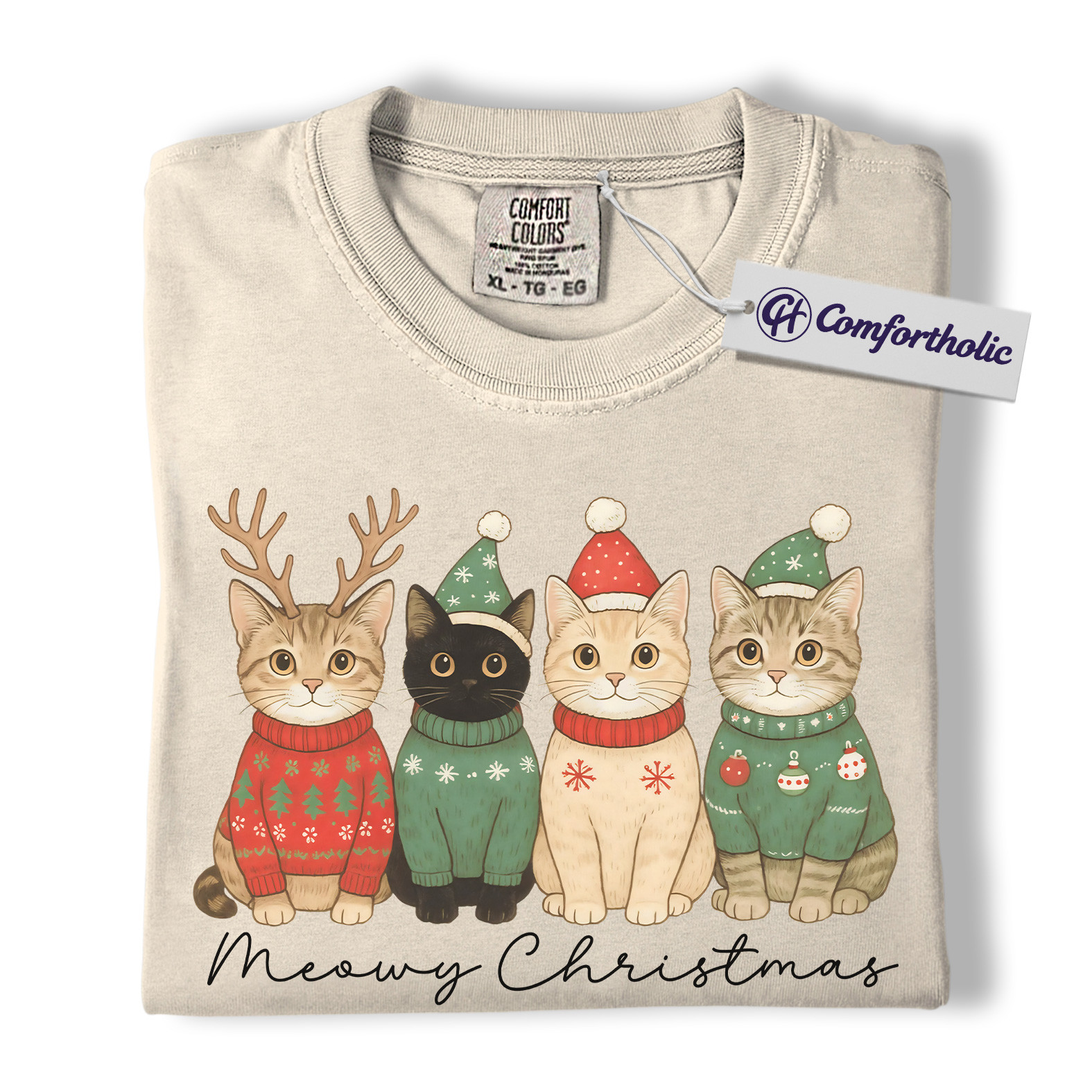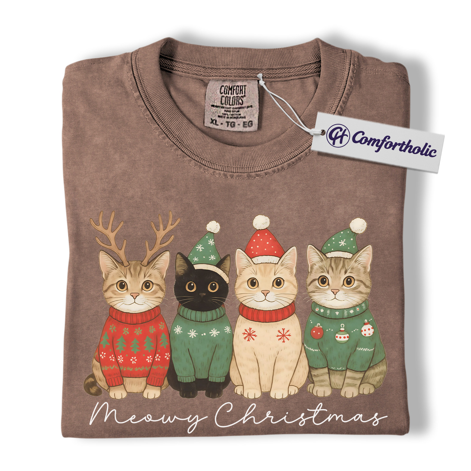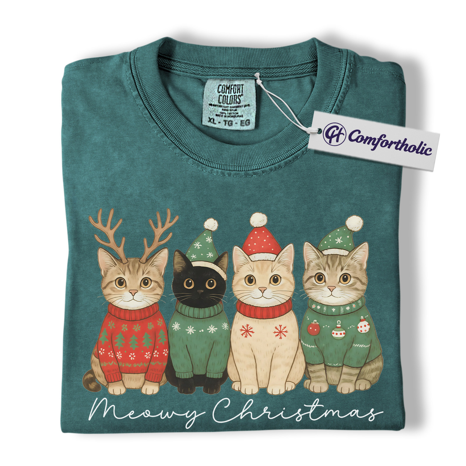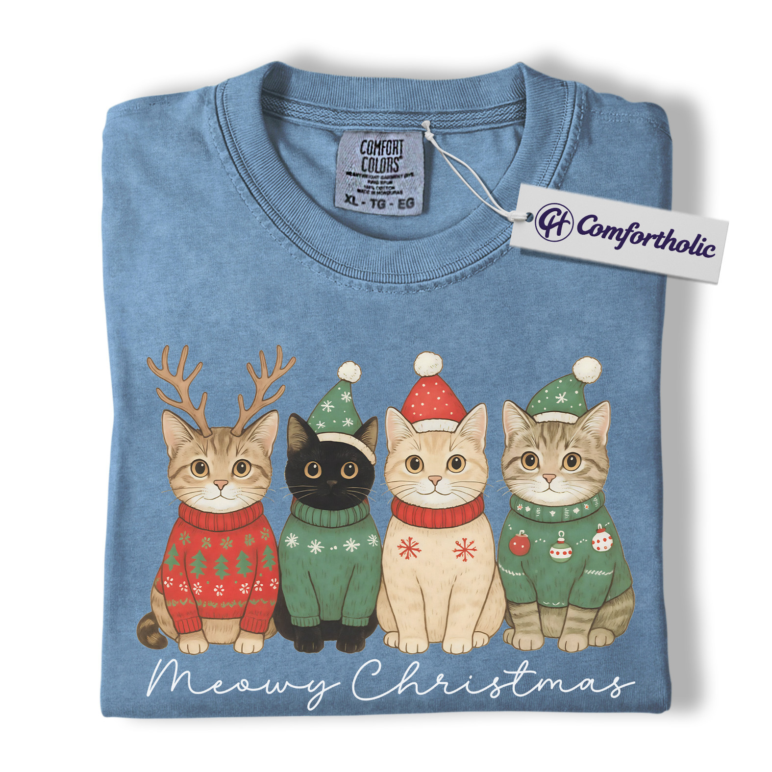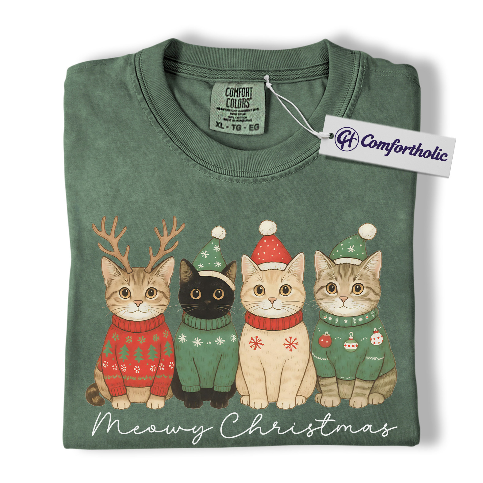 Meowy Christmas Cat Shirt, Cute Holiday Kitten T-Shirt, Funny Cat Lover Christmas Graphic Tee, Festive Pet Gift for Cat Moms, Comfort Colors Shirt
