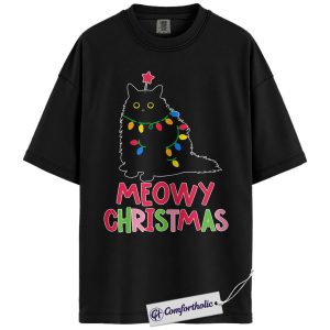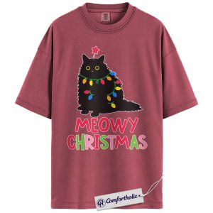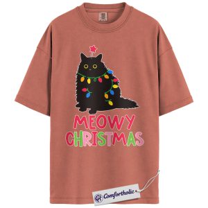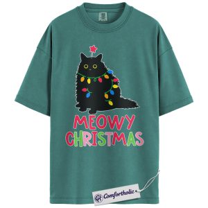 Meowy Christmas Cat Shirt, Funny Black Cat Holiday T-Shirt, Cute Pet Lover Graphic Tee, Gift for Cat Moms and Animal Lovers, Christmas Comfort Colors Shirt