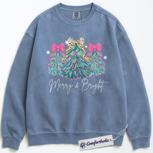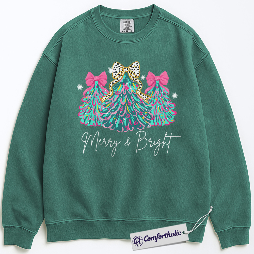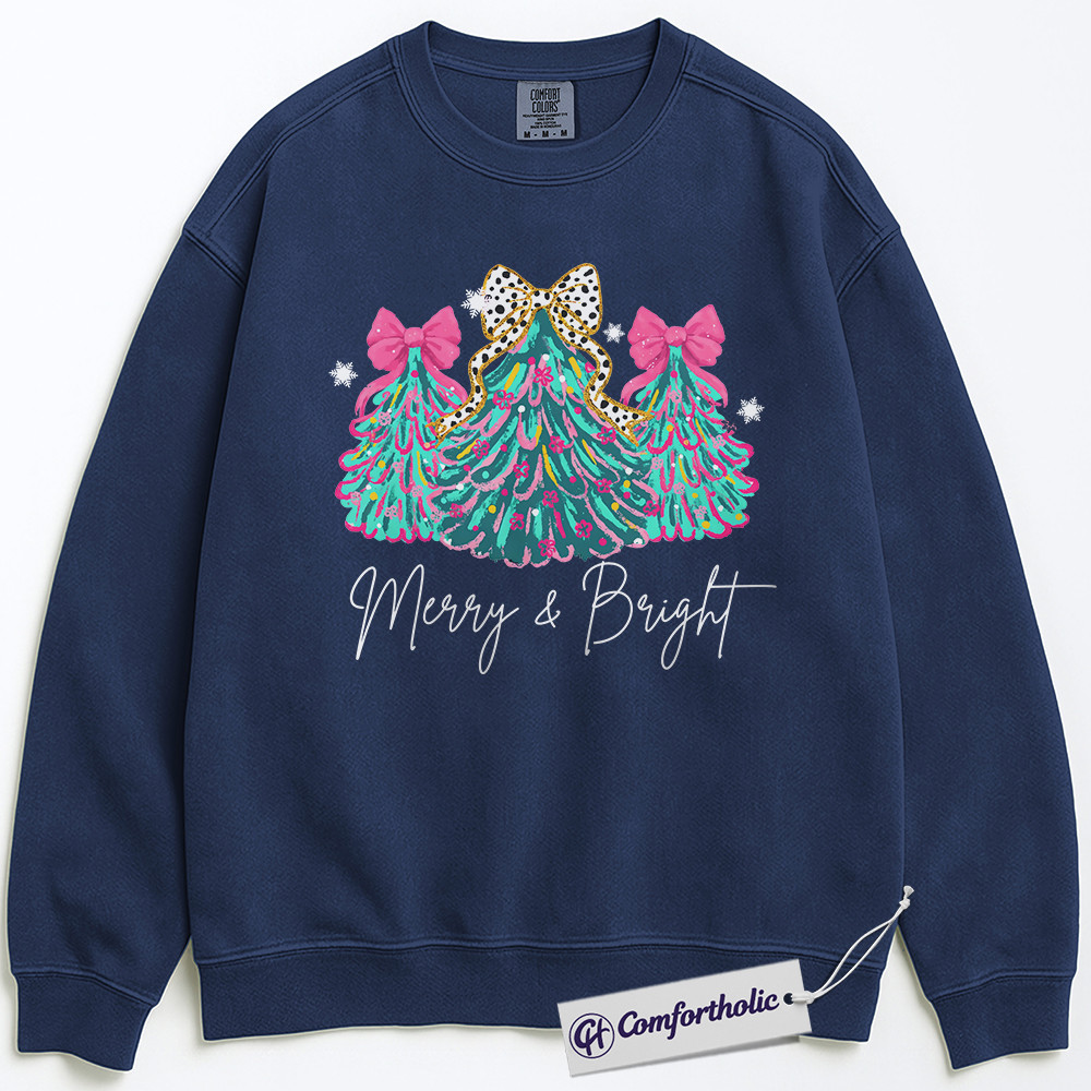 Merry and Bright Christmas Sweatshirt, Pink Bow Christmas Tree Sweatshirt, Cute Holiday Graphic Pullover, Festive Winter Outfit for Women, Christmas Comfort Colors Sweatshirt