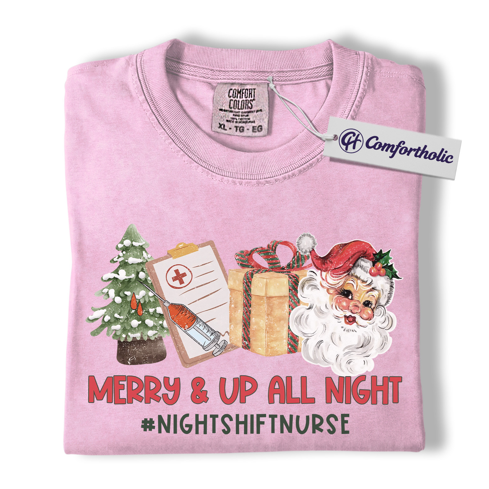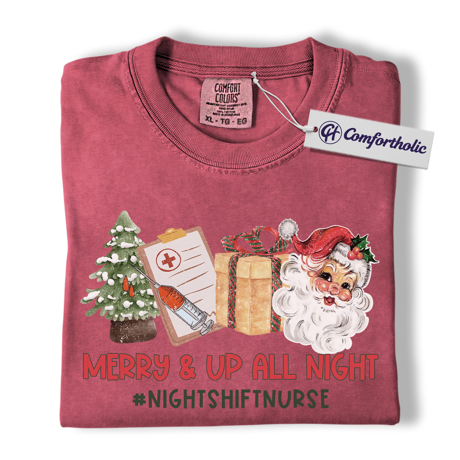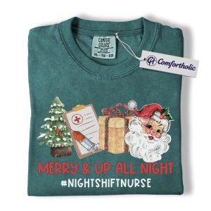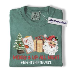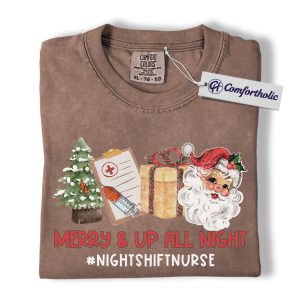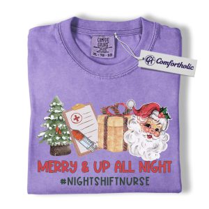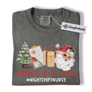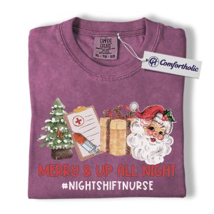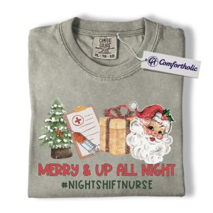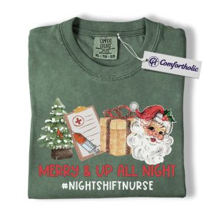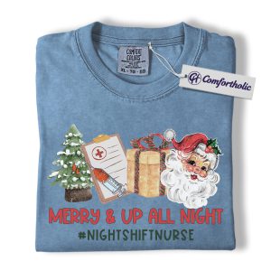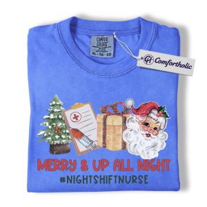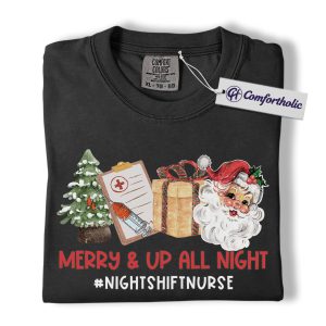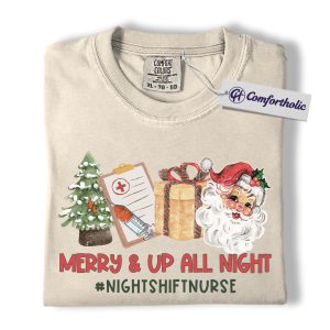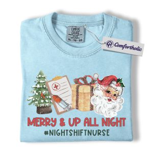 Merry and Up All Night Nurse Shirt, Funny Christmas Medical Worker T-Shirt, Night Shift RN Holiday Tee, Santa Nursing Gift, Christmas Comfort Colors Shirt
