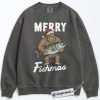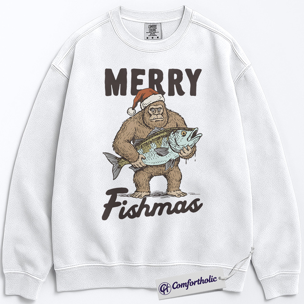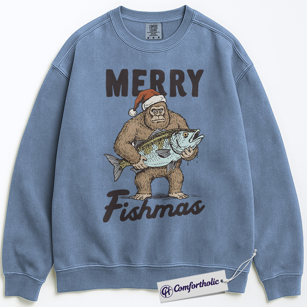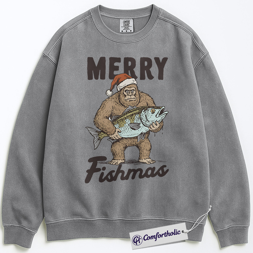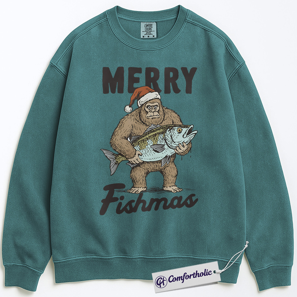 Merry Fishmas Sweatshirt, Funny Bigfoot Fishing Christmas Pullover, Fisherman Holiday Graphic Sweatshirt, Outdoor Humor Gift for Men, Christmas Comfort Colors Sweatshirt