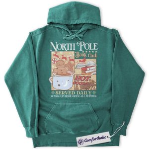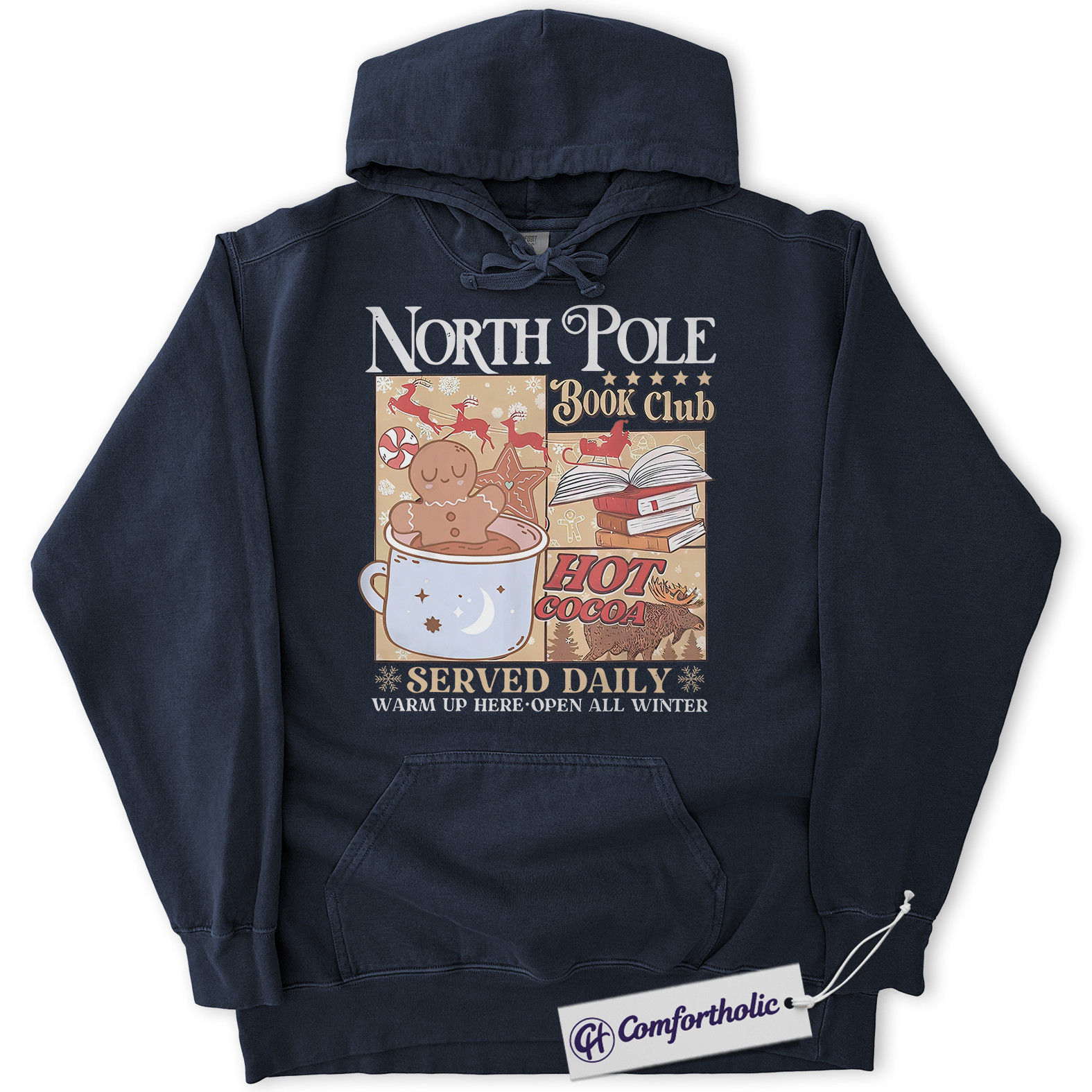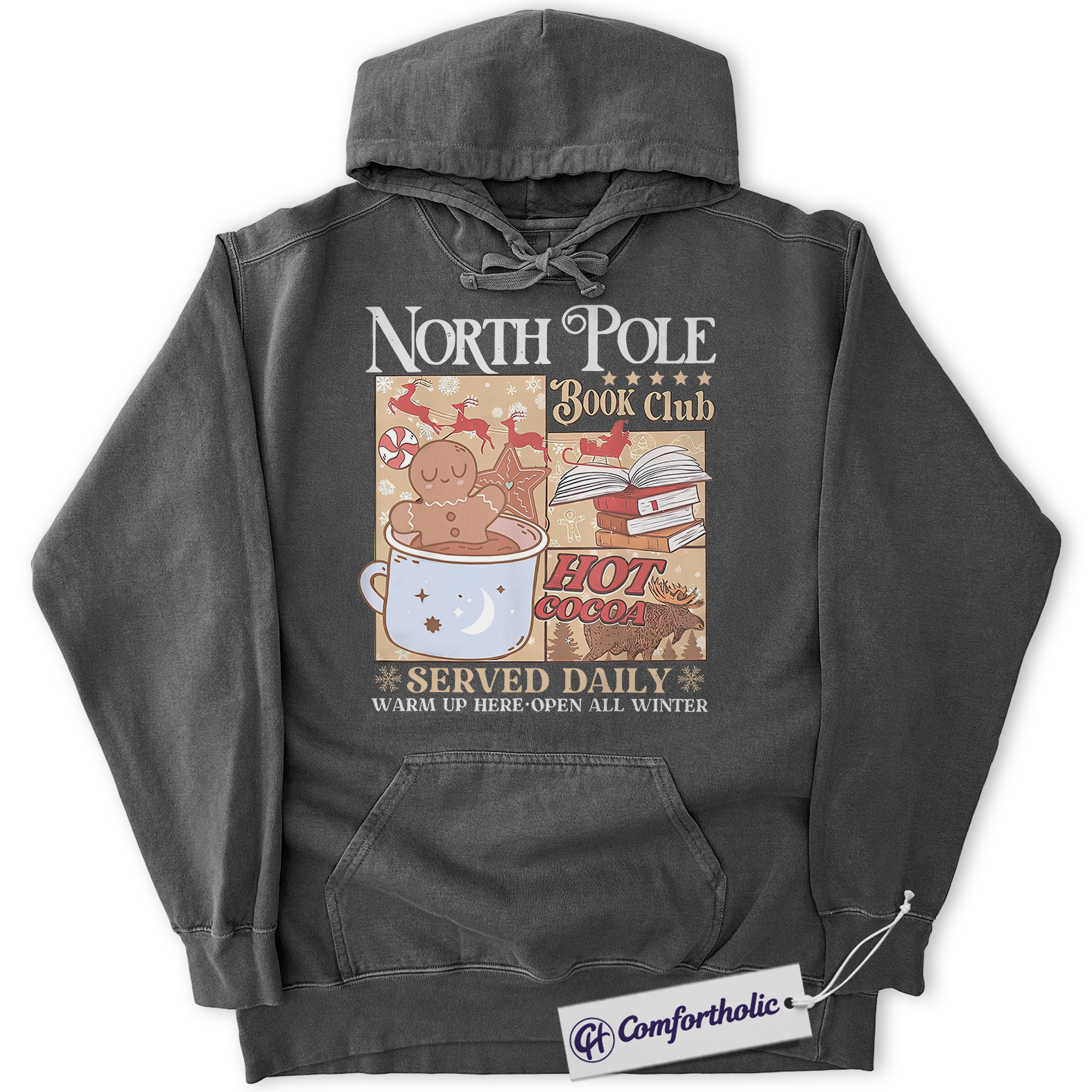 North Pole Book Club Hoodie, Cozy Christmas Reader Hoodie, Hot Cocoa Gingerbread Graphic Pullover, Holiday Gift for Book Lovers, Christmas Comfort Colors Hoodie