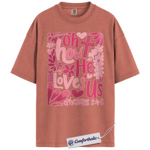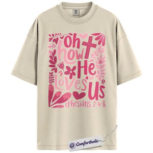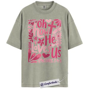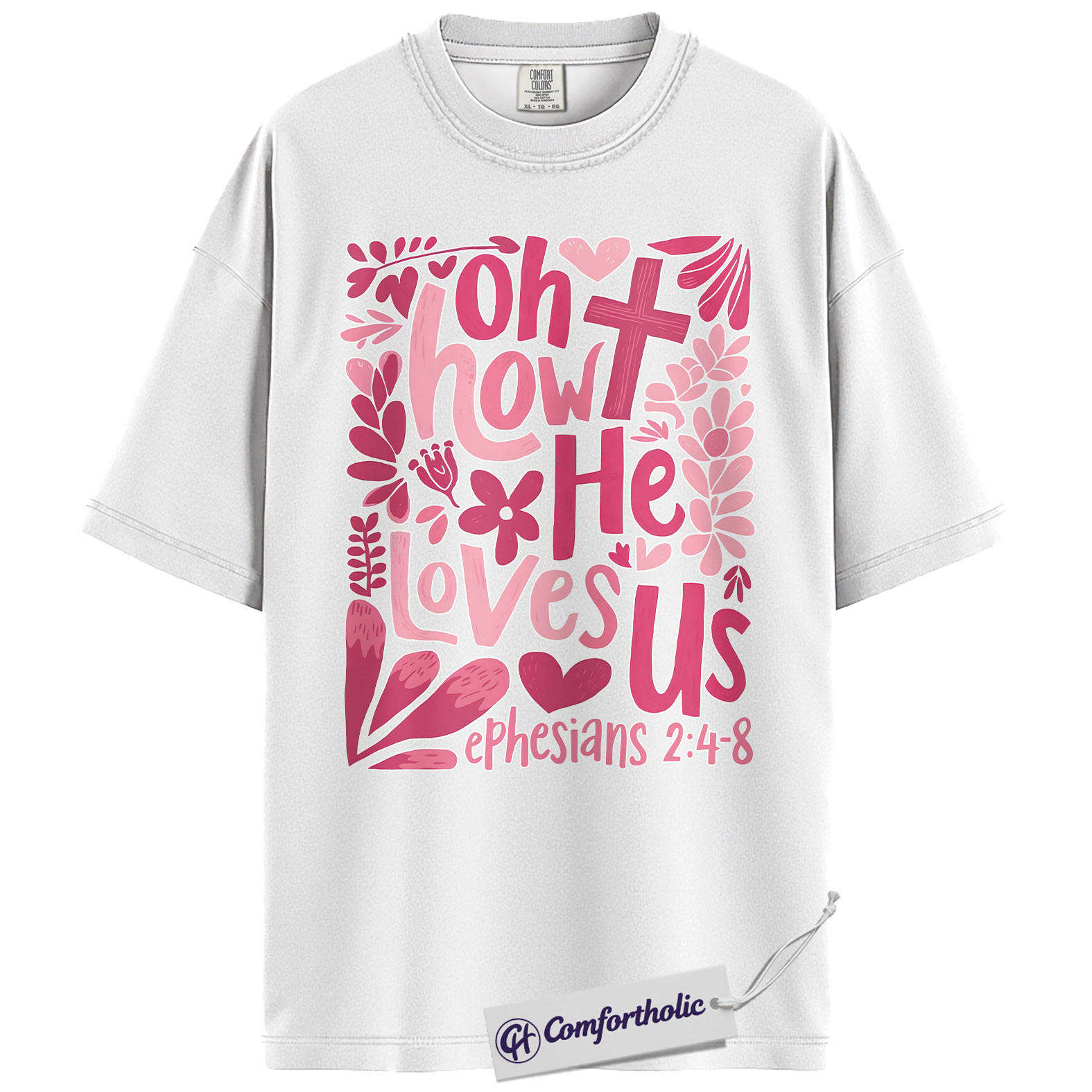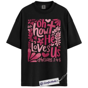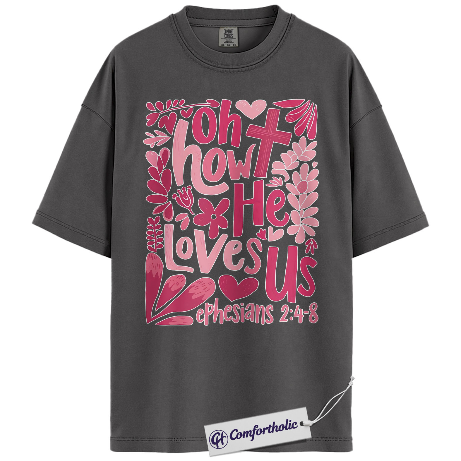 Oh How He Loves Us Shirt, Floral Christian Cross Graphic Tee, Ephesians 2:4-8 Bible Verse T-Shirt, Valentine’s Day Gift for Christian Women, Comfort Colors Shirt