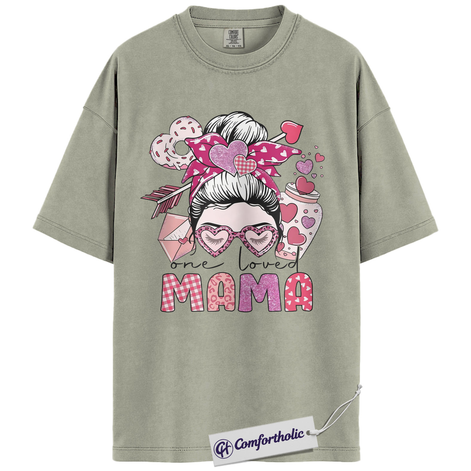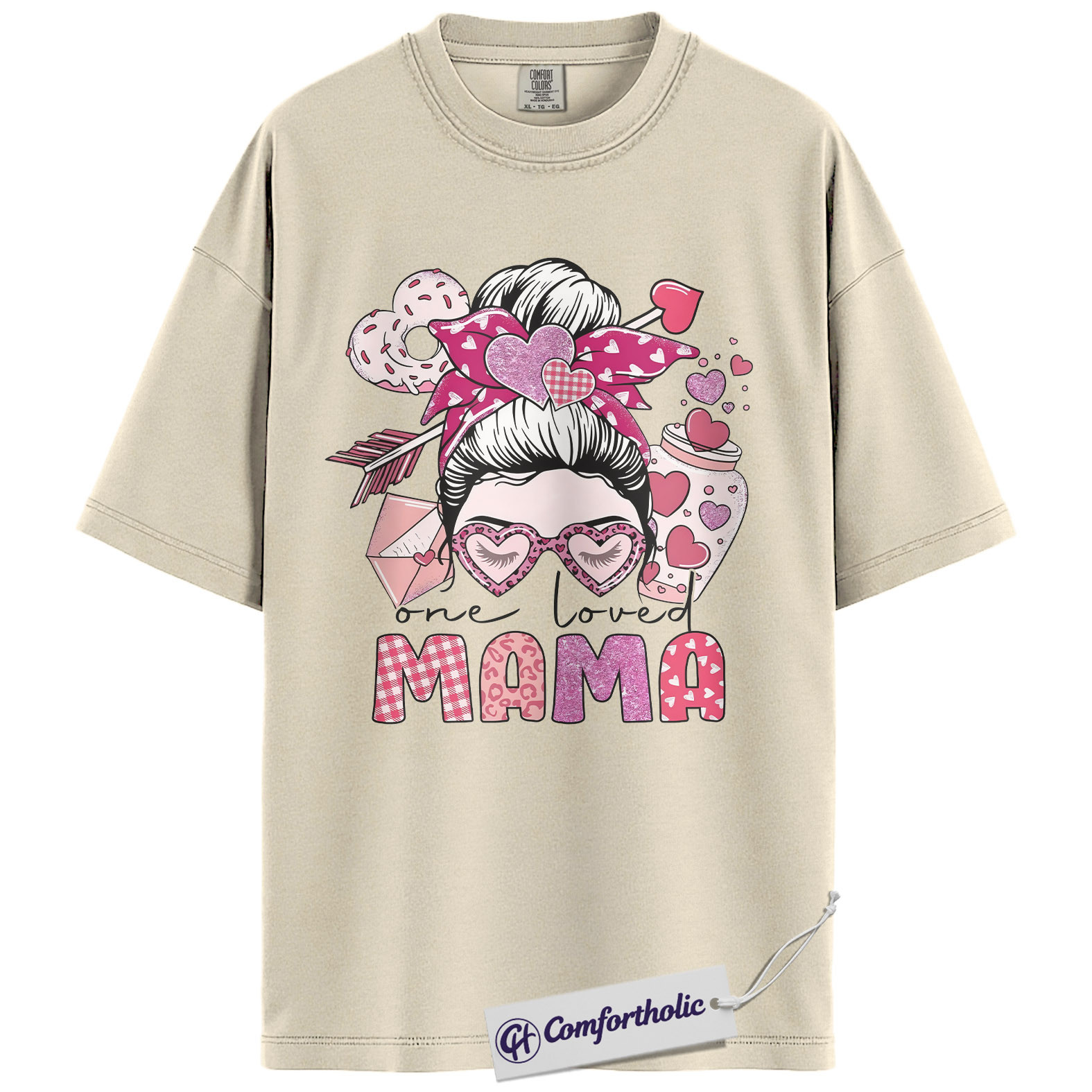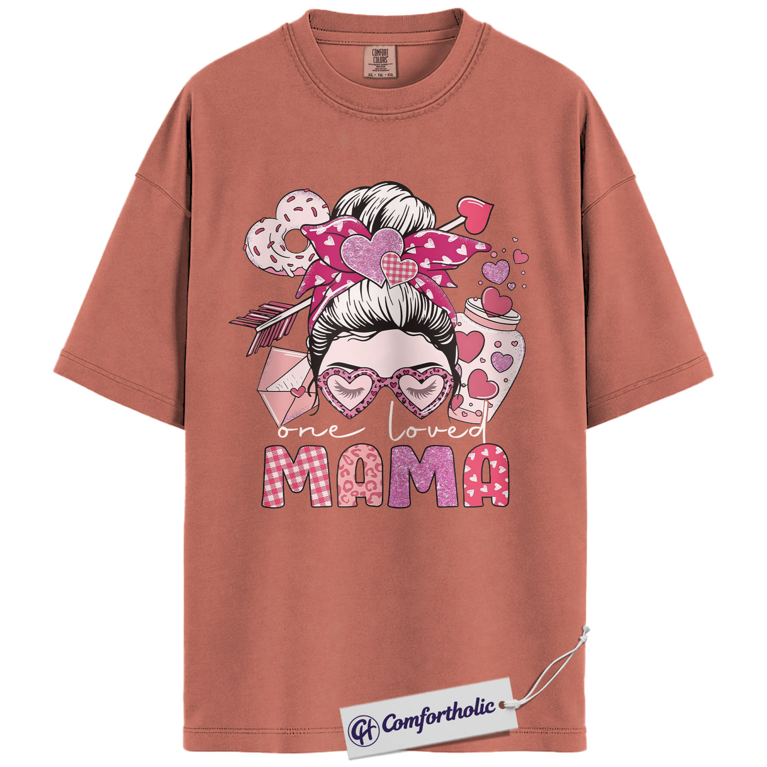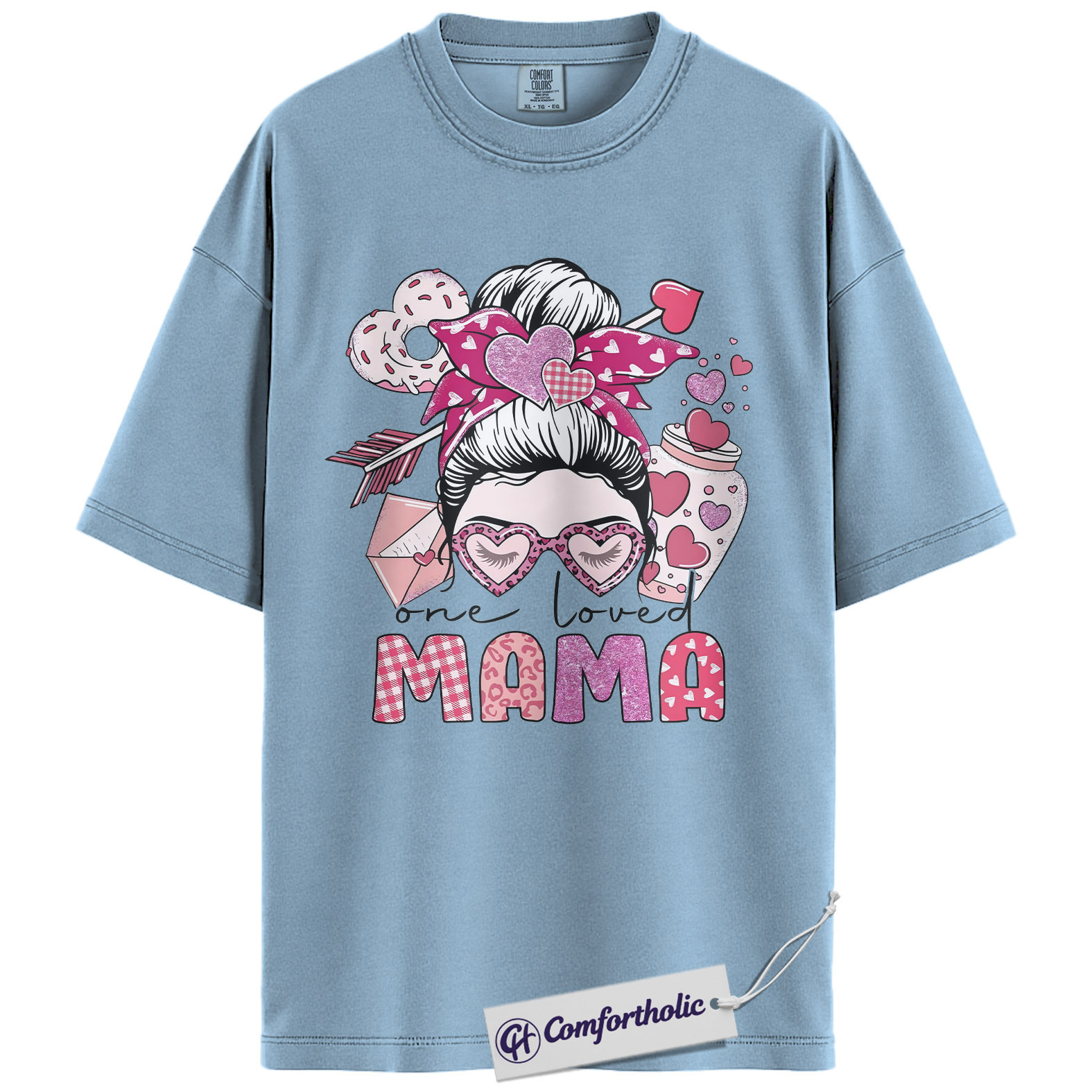 One Loved Mama Shirt, Cute Valentine Mom Graphic Tee, Pink Heart Bow Mama T-Shirt, Valentine’s Day Gift for Moms, Comfort Colors Shirt
