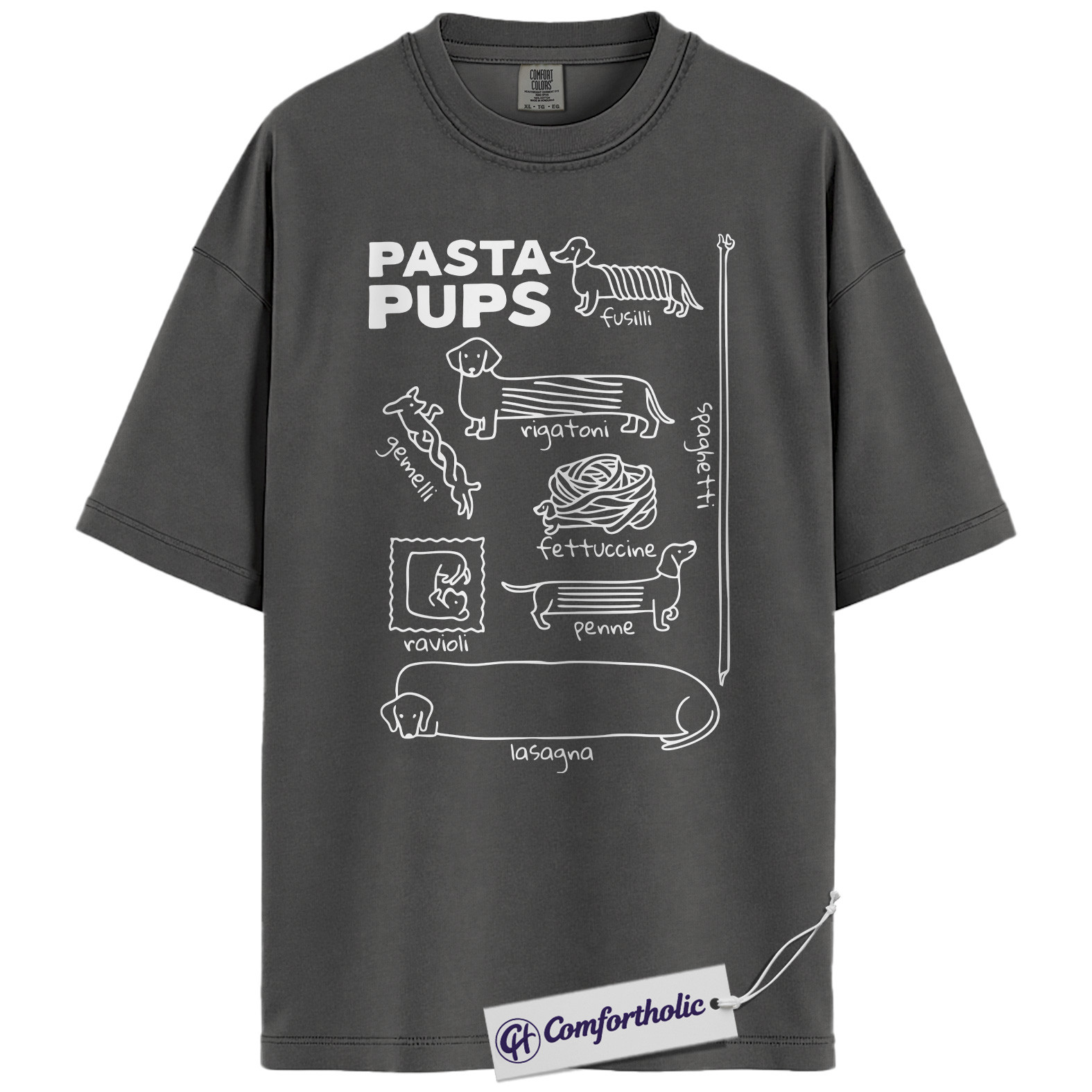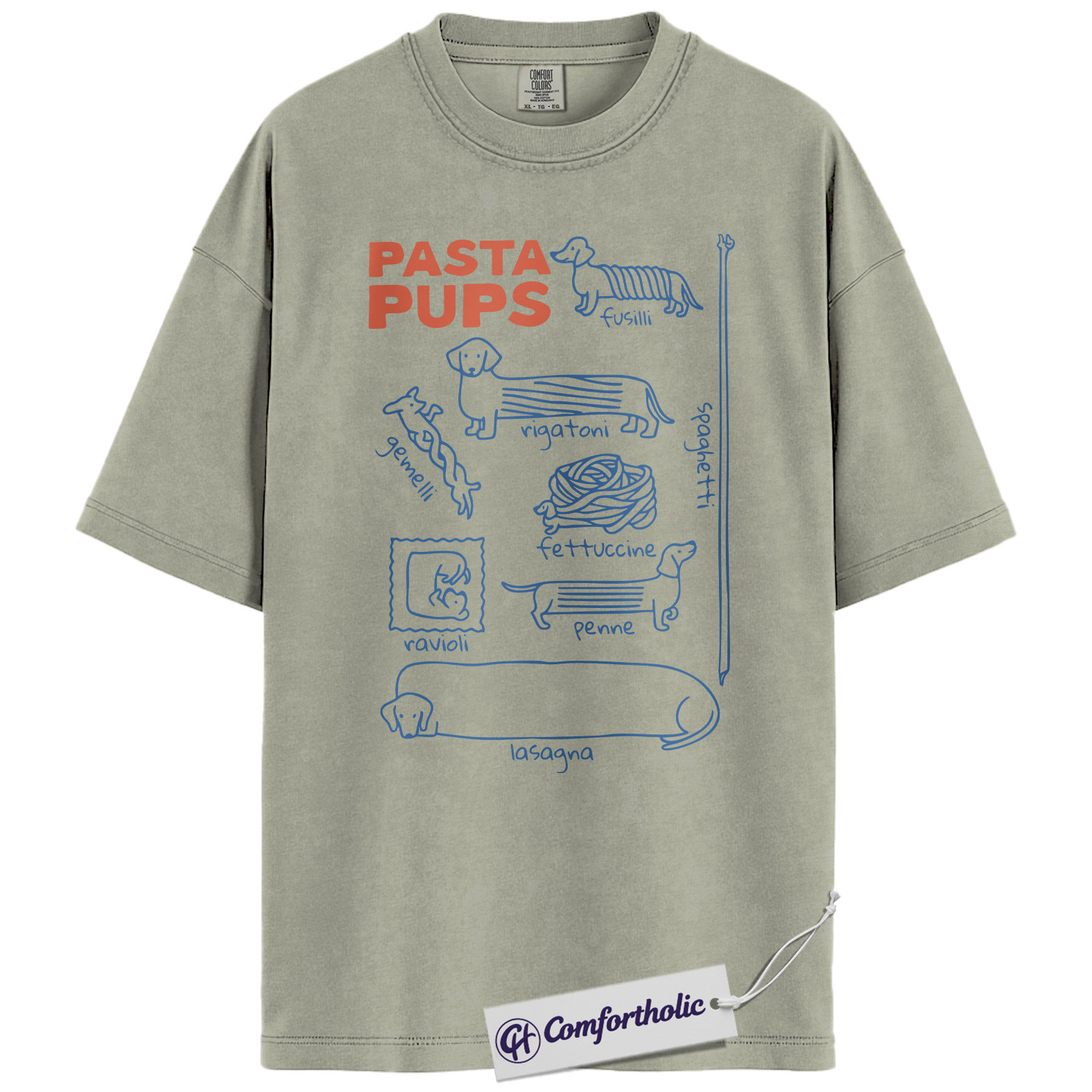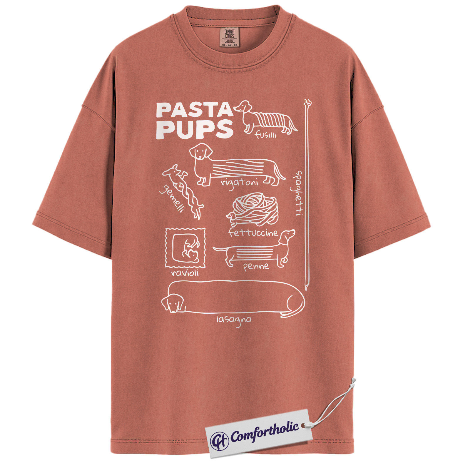 Pasta Pups Shirt, Funny Dachshund Dog Food Pun Graphic T-Shirt, Cute Pet Lover Tee, Gift for Dog Moms and Dachshund Owners, Comfort Colors Shirt