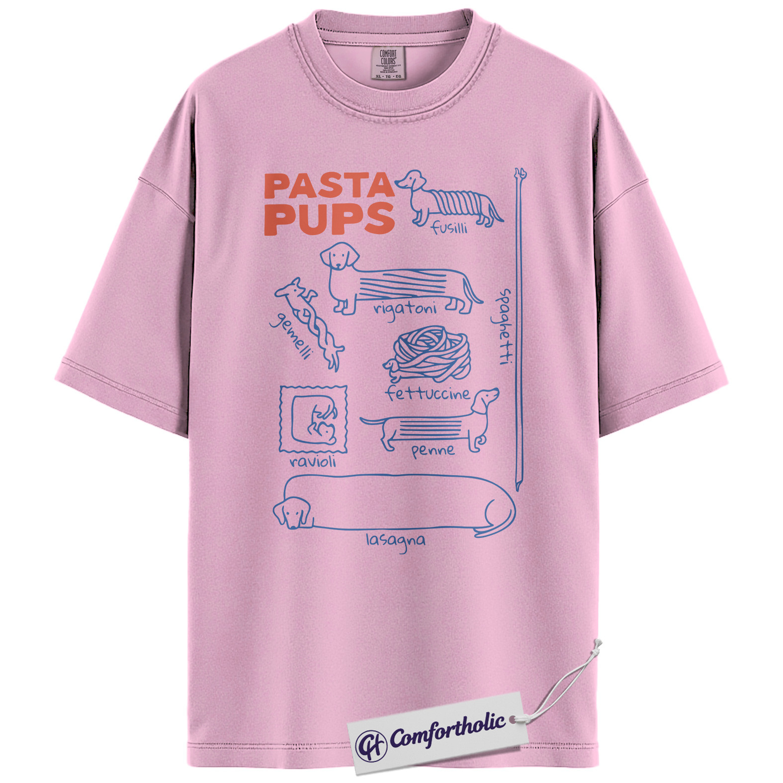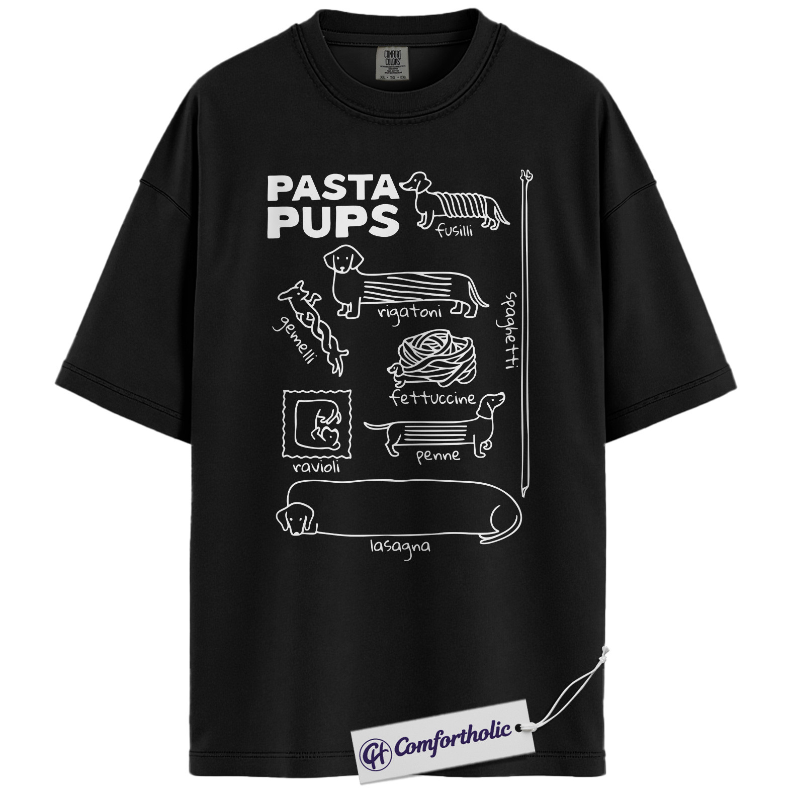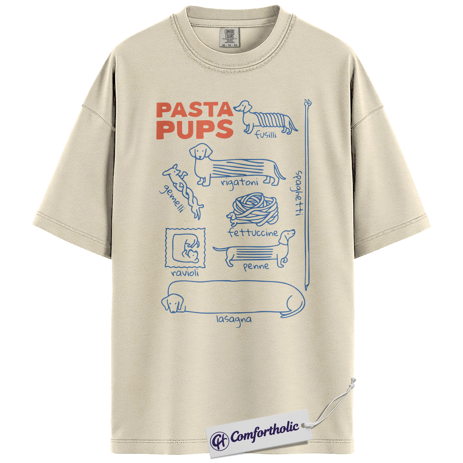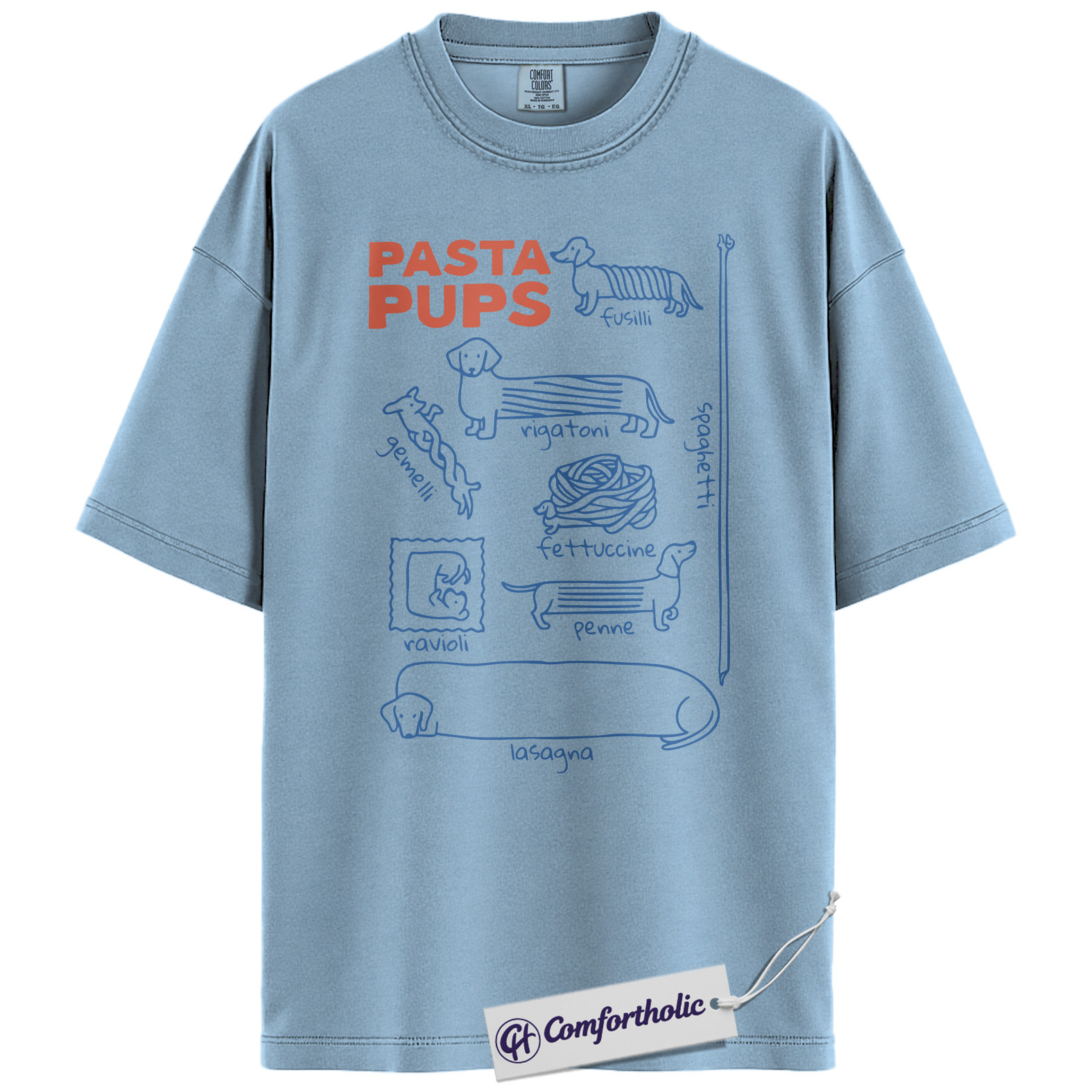 Pasta Pups Shirt, Funny Dachshund Dog Food Pun Graphic T-Shirt, Cute Pet Lover Tee, Gift for Dog Moms and Dachshund Owners, Comfort Colors Shirt