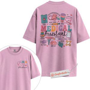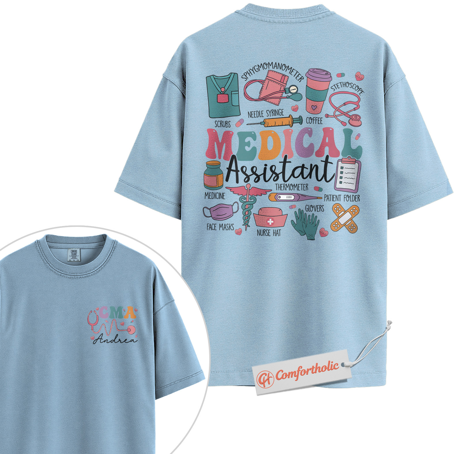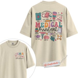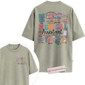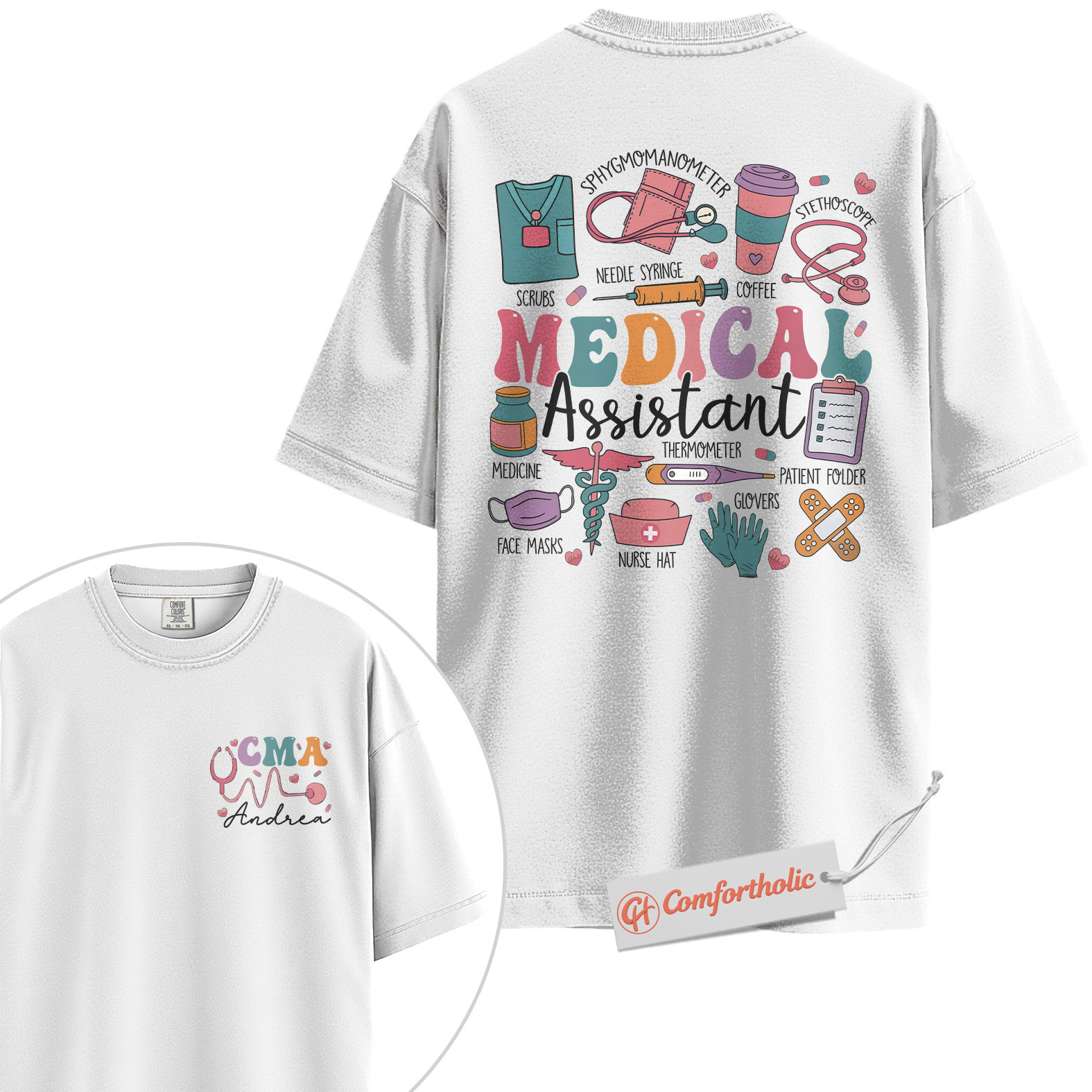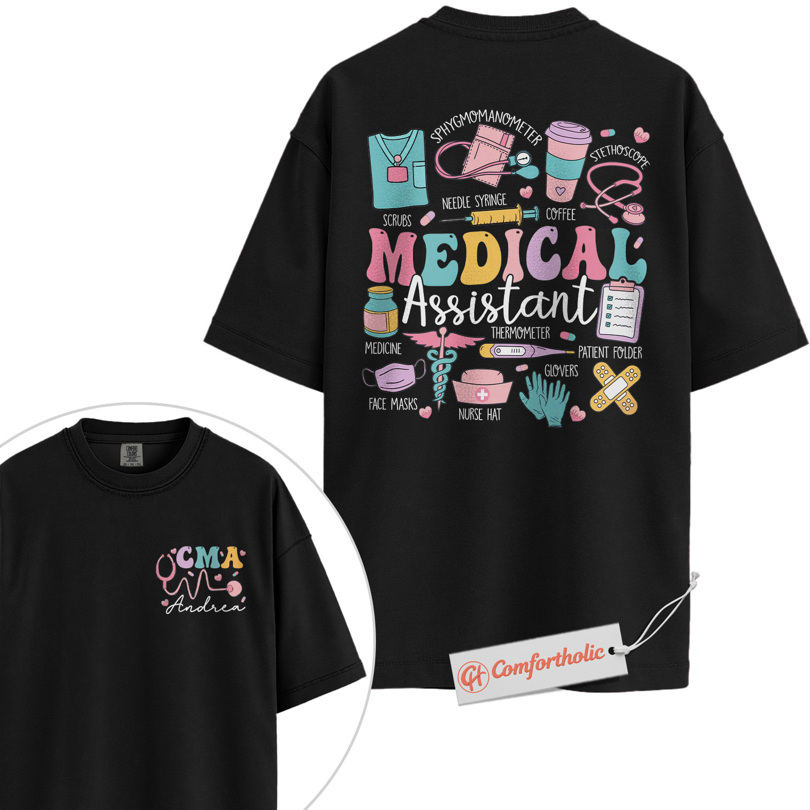 Personalized CMA Shirt, Custom Medical Assistant T-Shirt, Colorful Medical Tools Graphic Tee, Cute Gift for Healthcare Workers, Medical Staff Comfort Colors Shirt 2-Sided