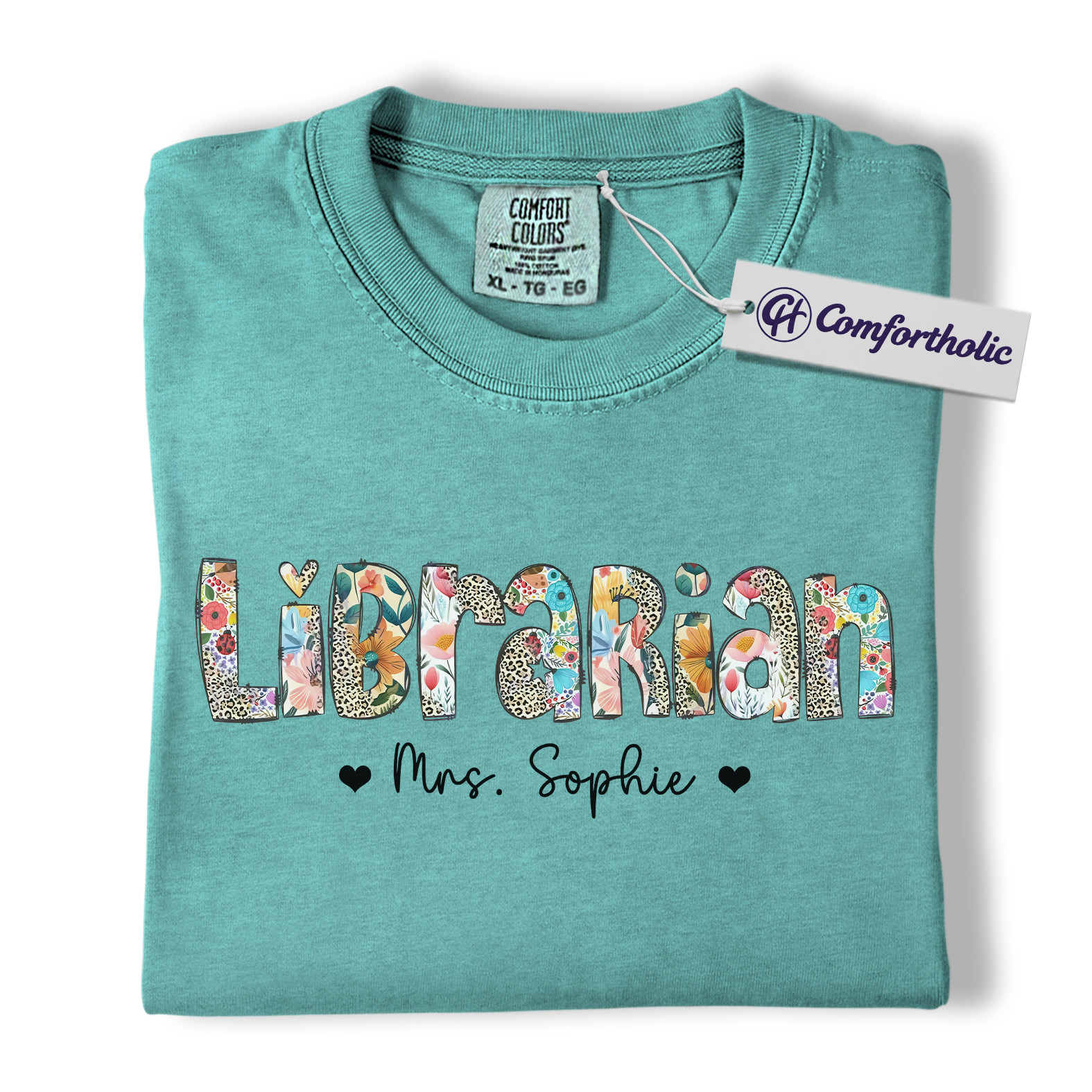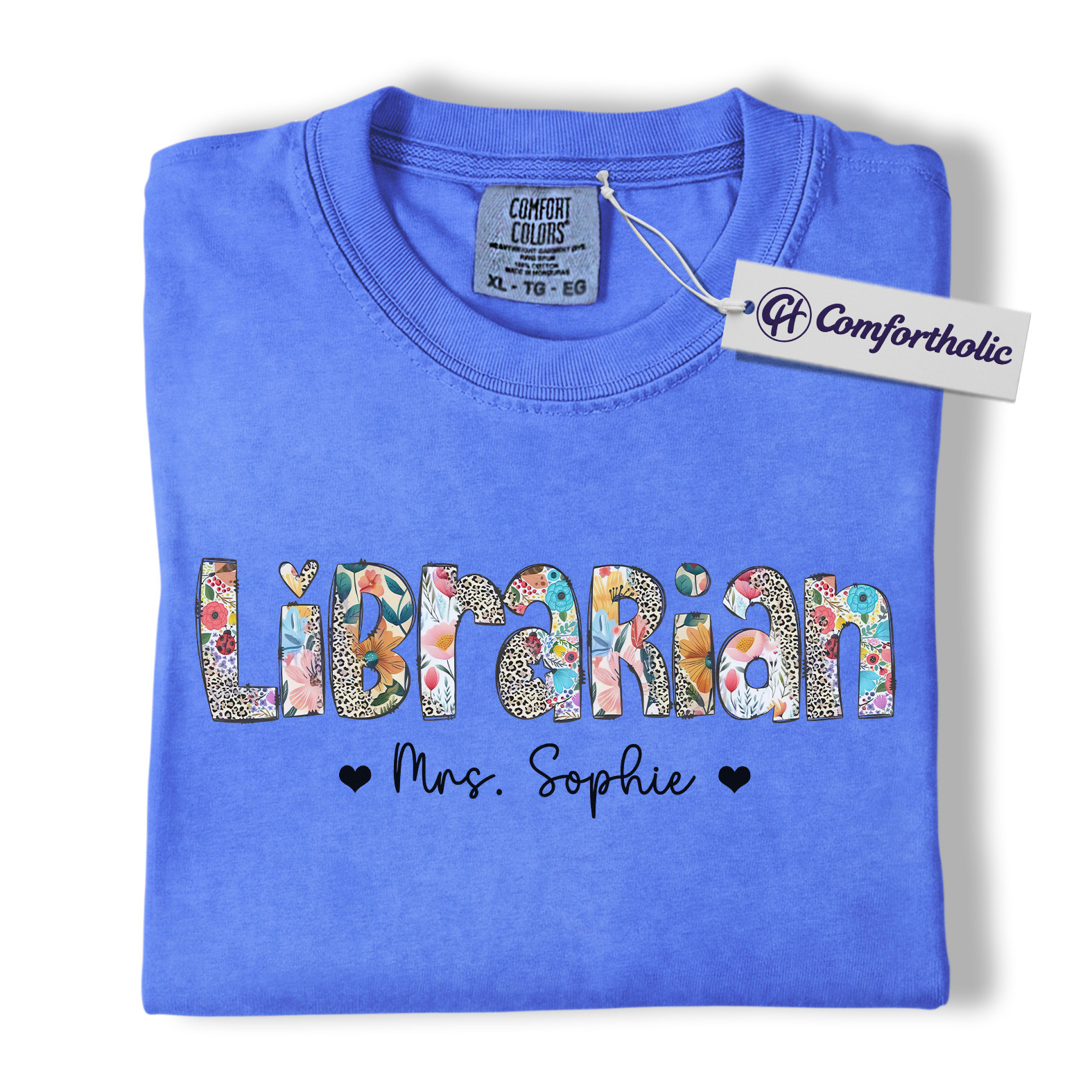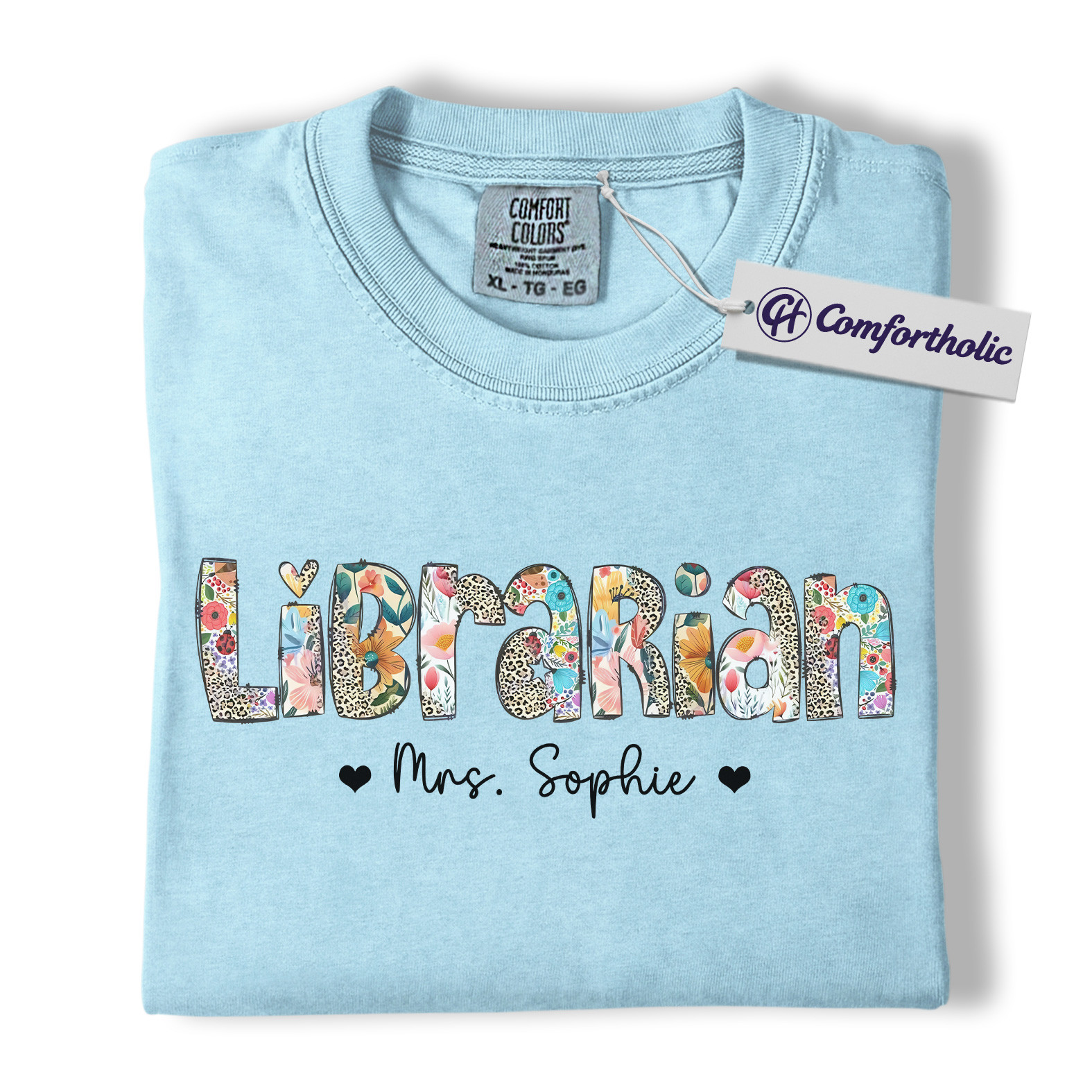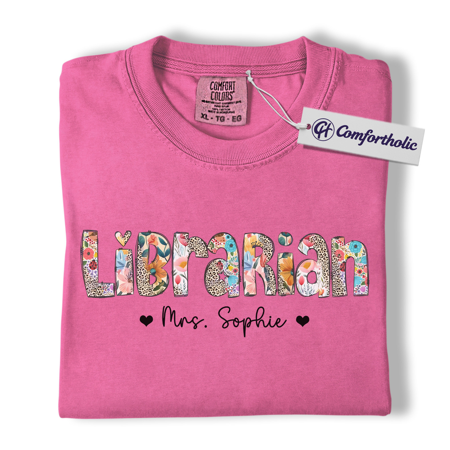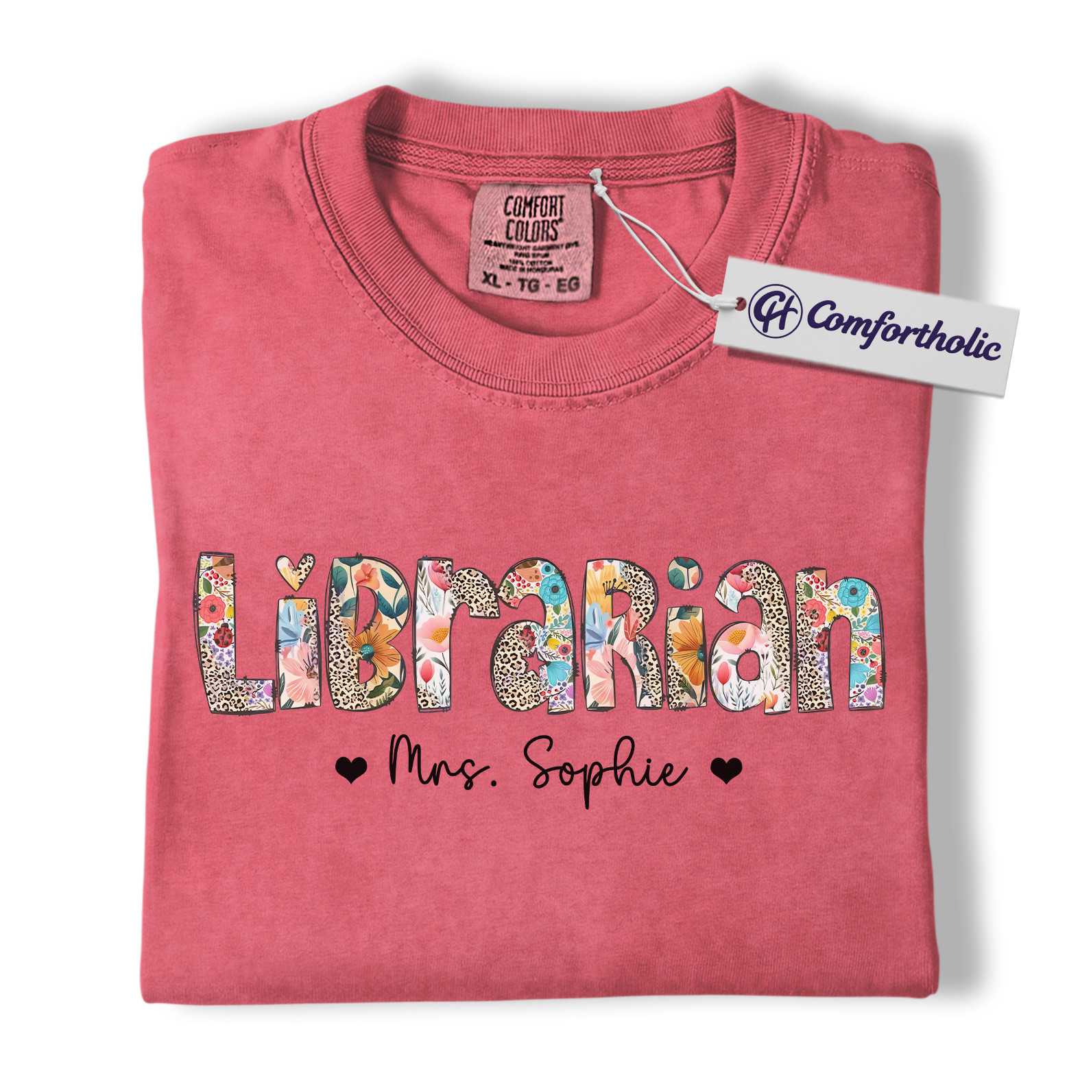 Personalized Librarian Shirt, Custom Name Teacher T-Shirt, Floral Leopard Print Graphic Tee, Cute Library Staff Gift, Comfort Colors Shirt