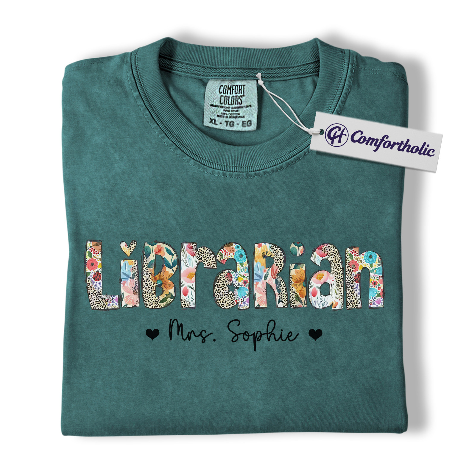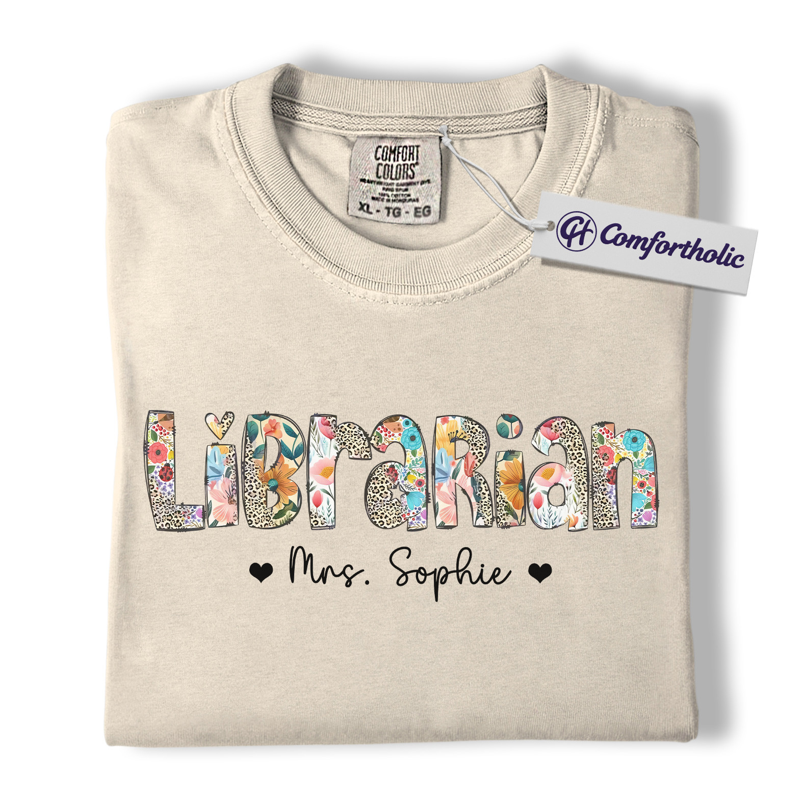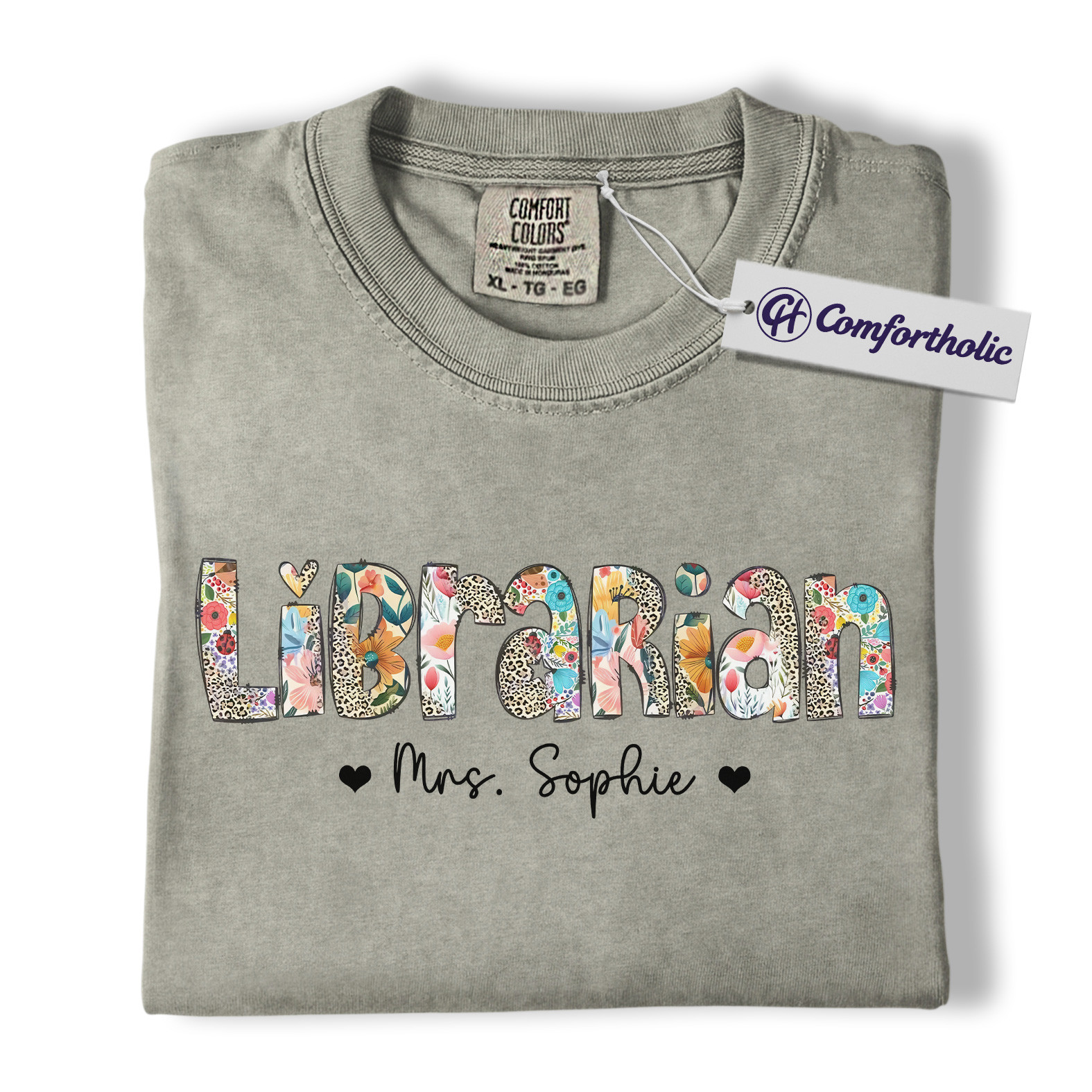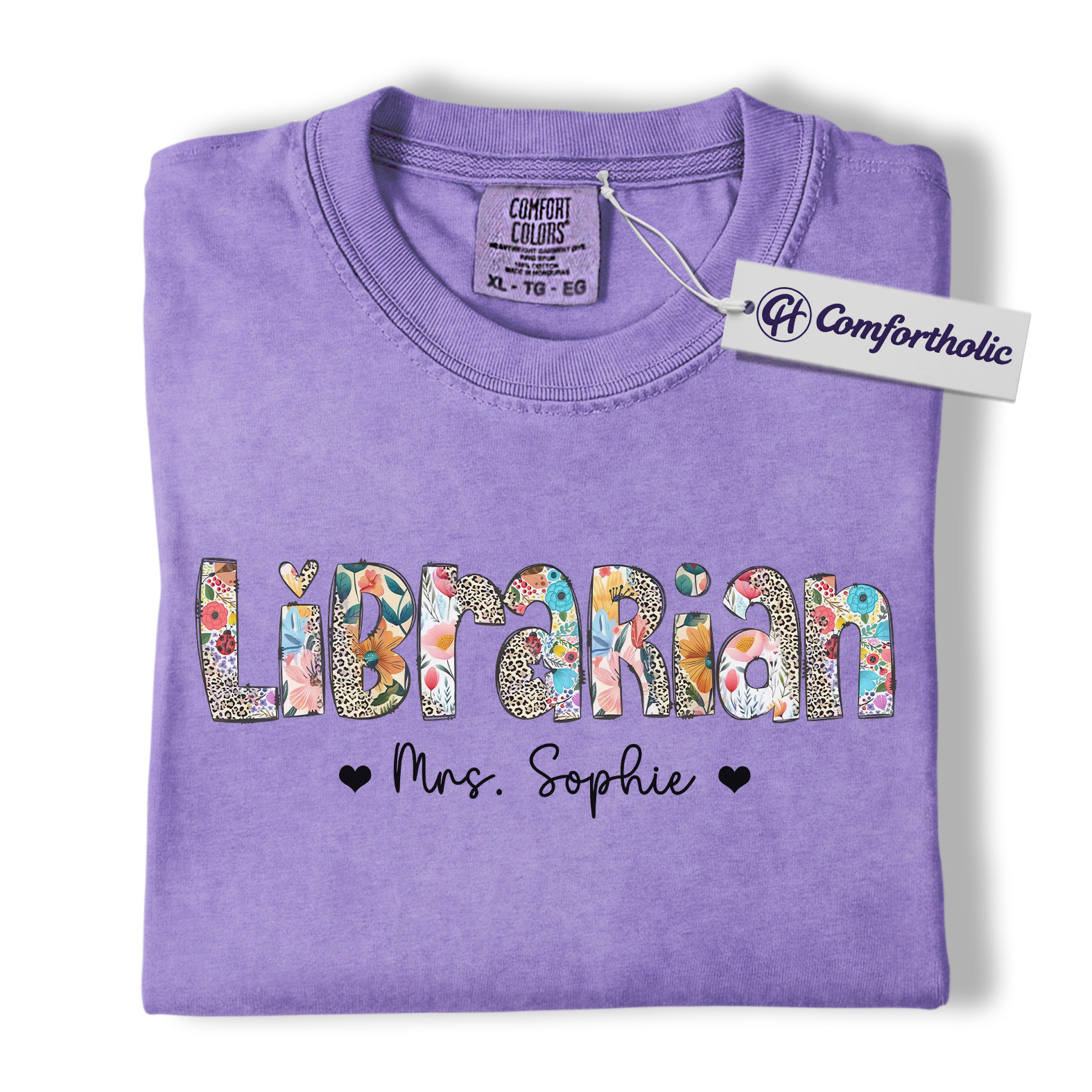 Personalized Librarian Shirt, Custom Name Teacher T-Shirt, Floral Leopard Print Graphic Tee, Cute Library Staff Gift, Comfort Colors Shirt