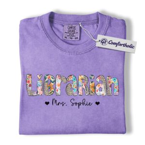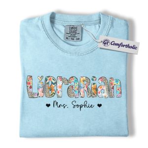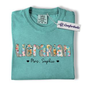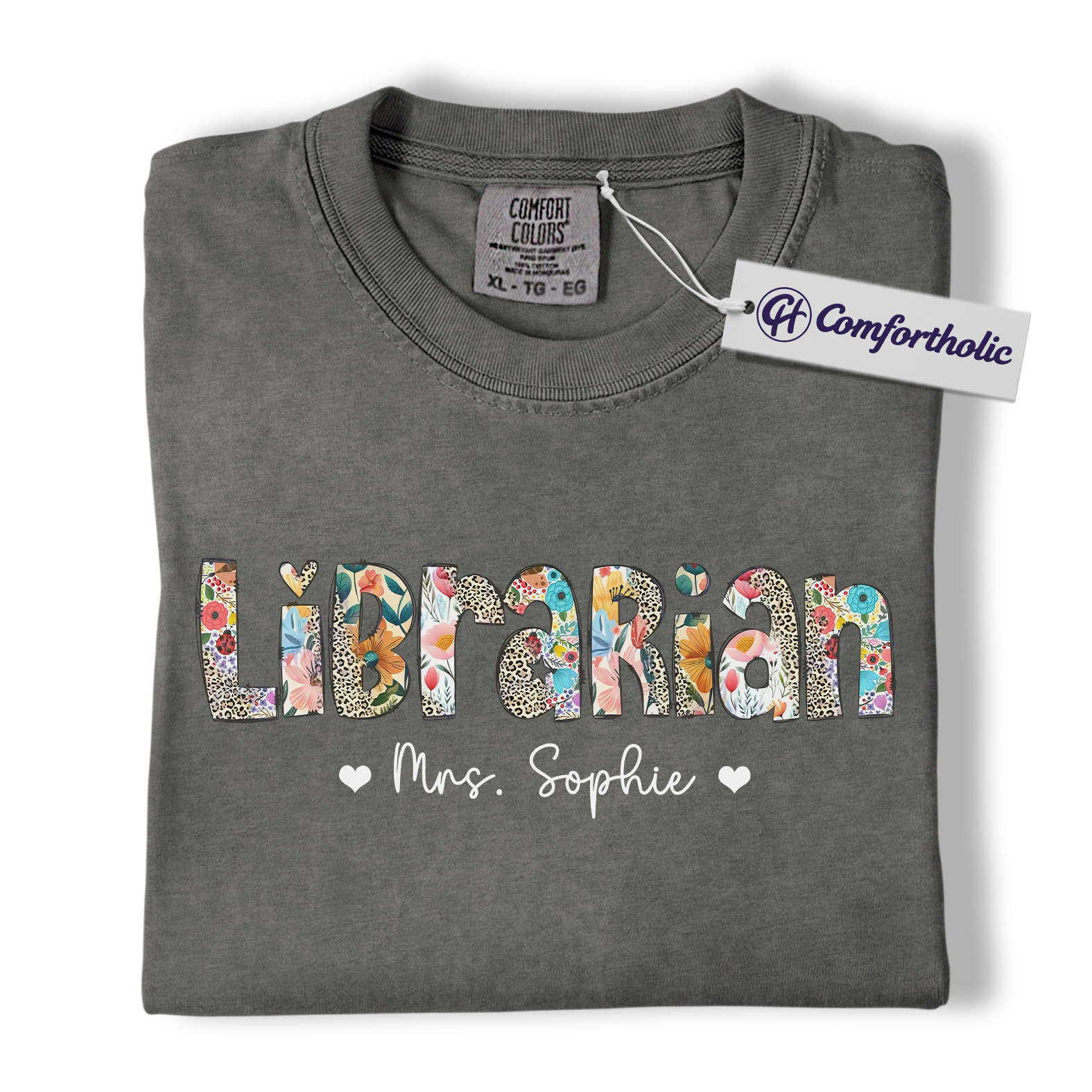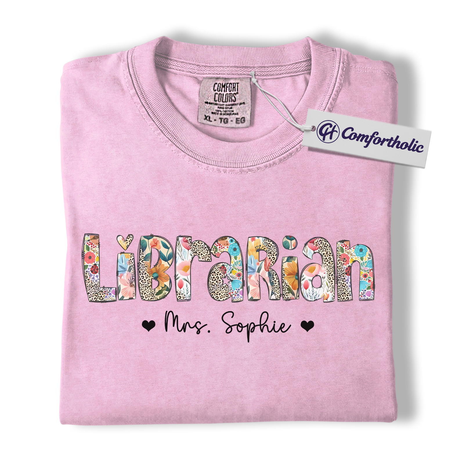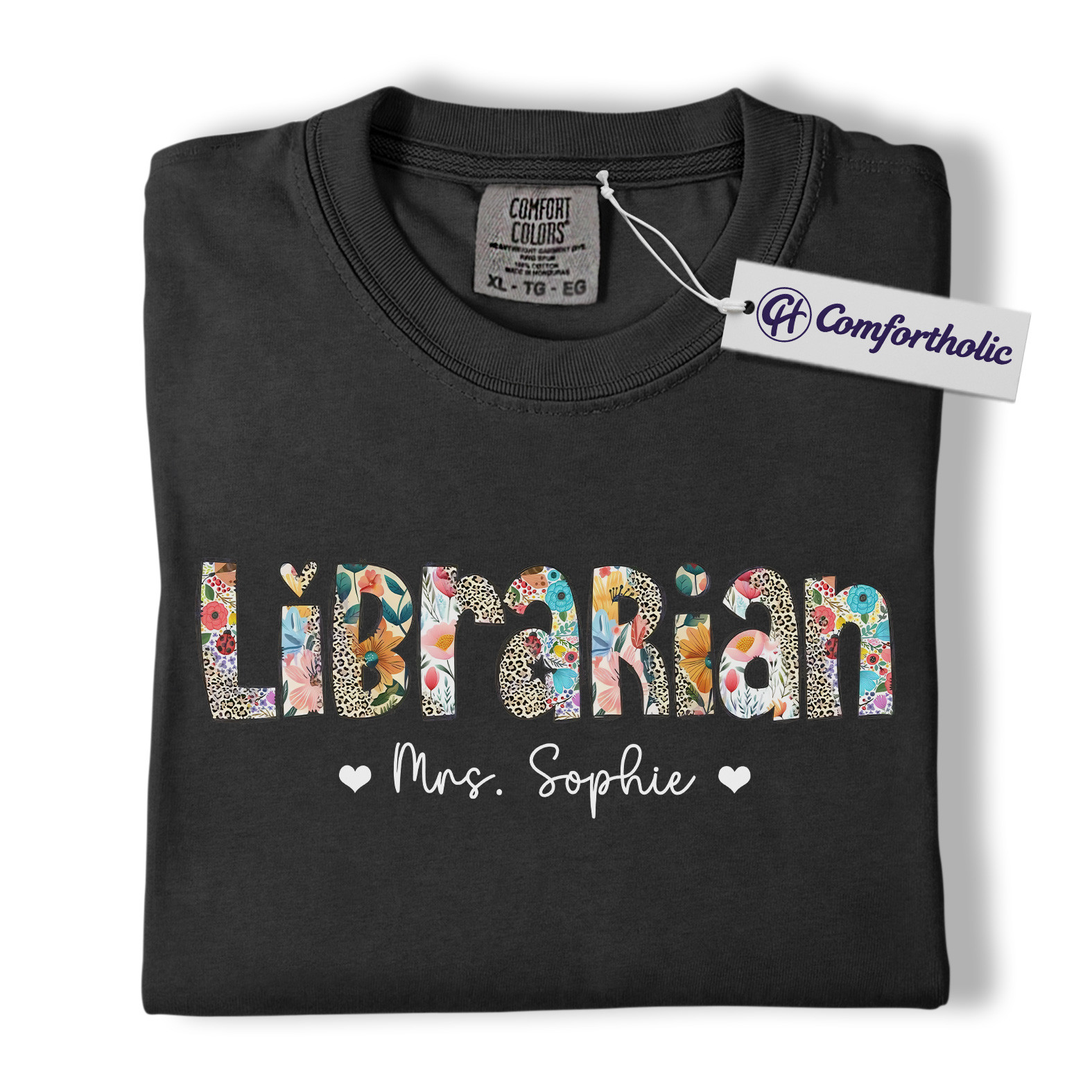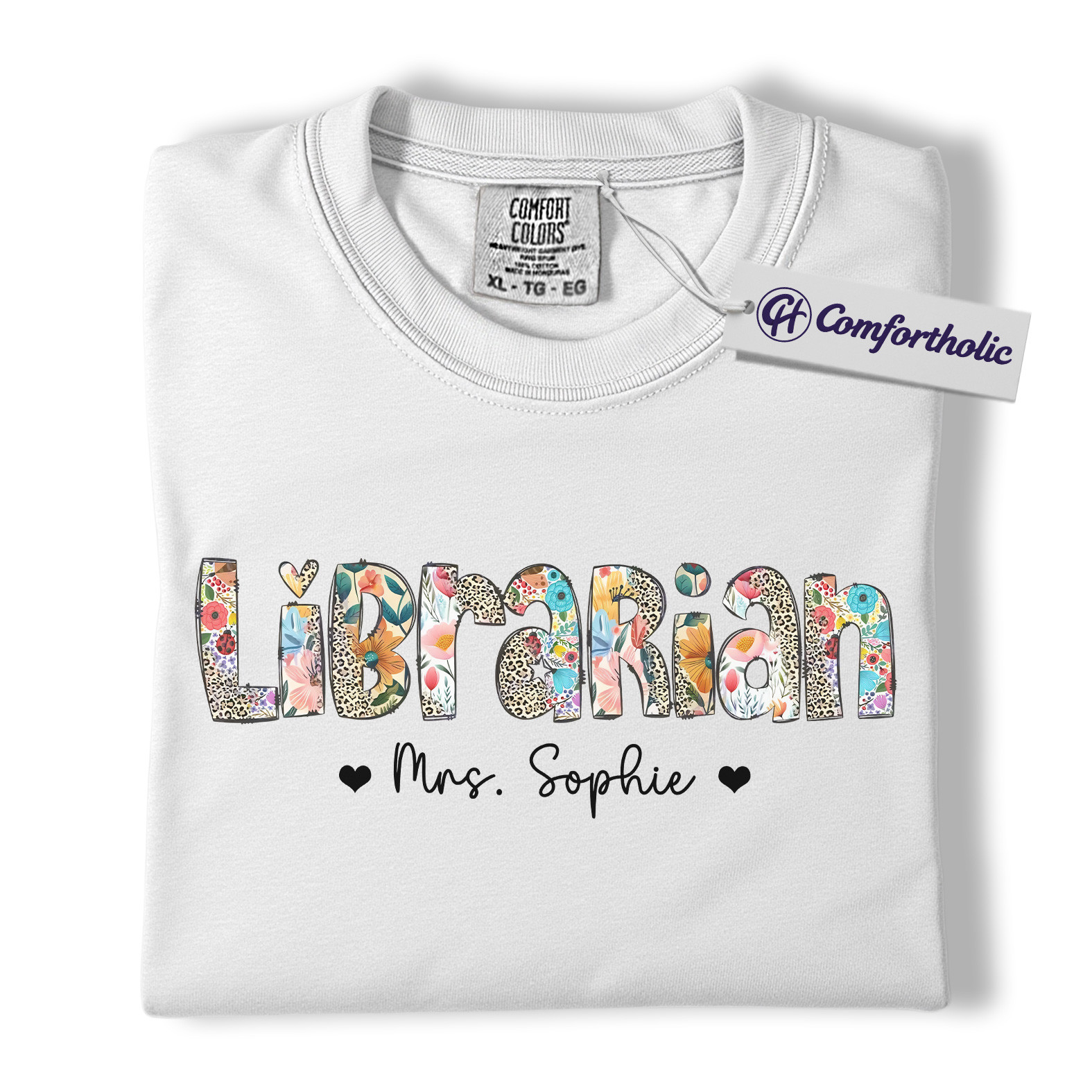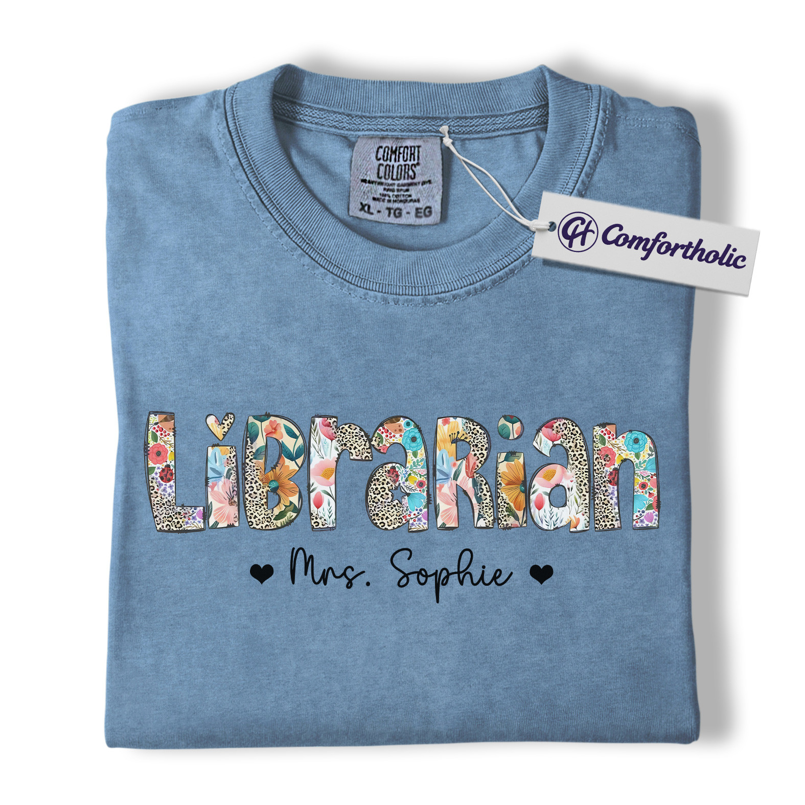 Personalized Librarian Shirt, Custom Name Teacher T-Shirt, Floral Leopard Print Graphic Tee, Cute Library Staff Gift, Comfort Colors Shirt