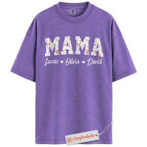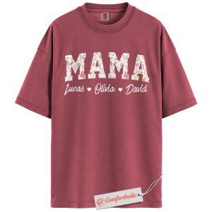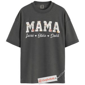 Personalized Mama Shirt with Kids’ Names, Floral Letter Print Mama T-Shirt, Custom Mom Graphic Tee, Mother’s Day Gift, Family Comfort Colors Shirt