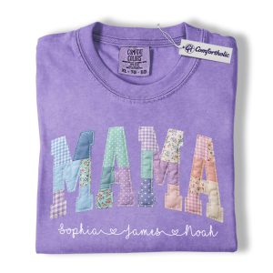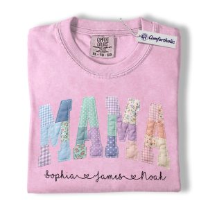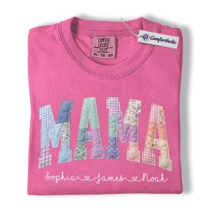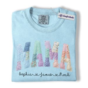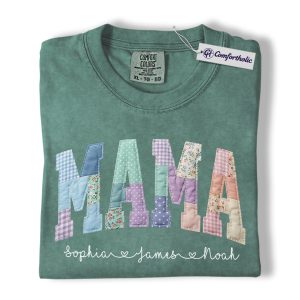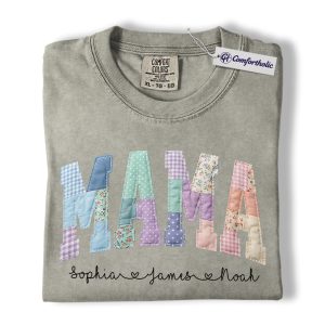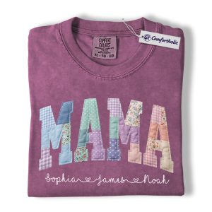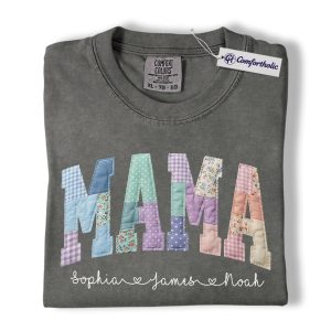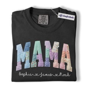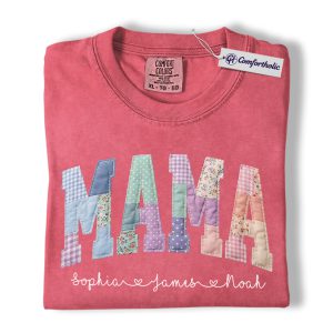 Personalized Mama Shirt with Kids Names, Patchwork MAMA Graphic Tee, Mother’s Day T-Shirt, Custom Gift for Moms, Comfort Colors Shirt