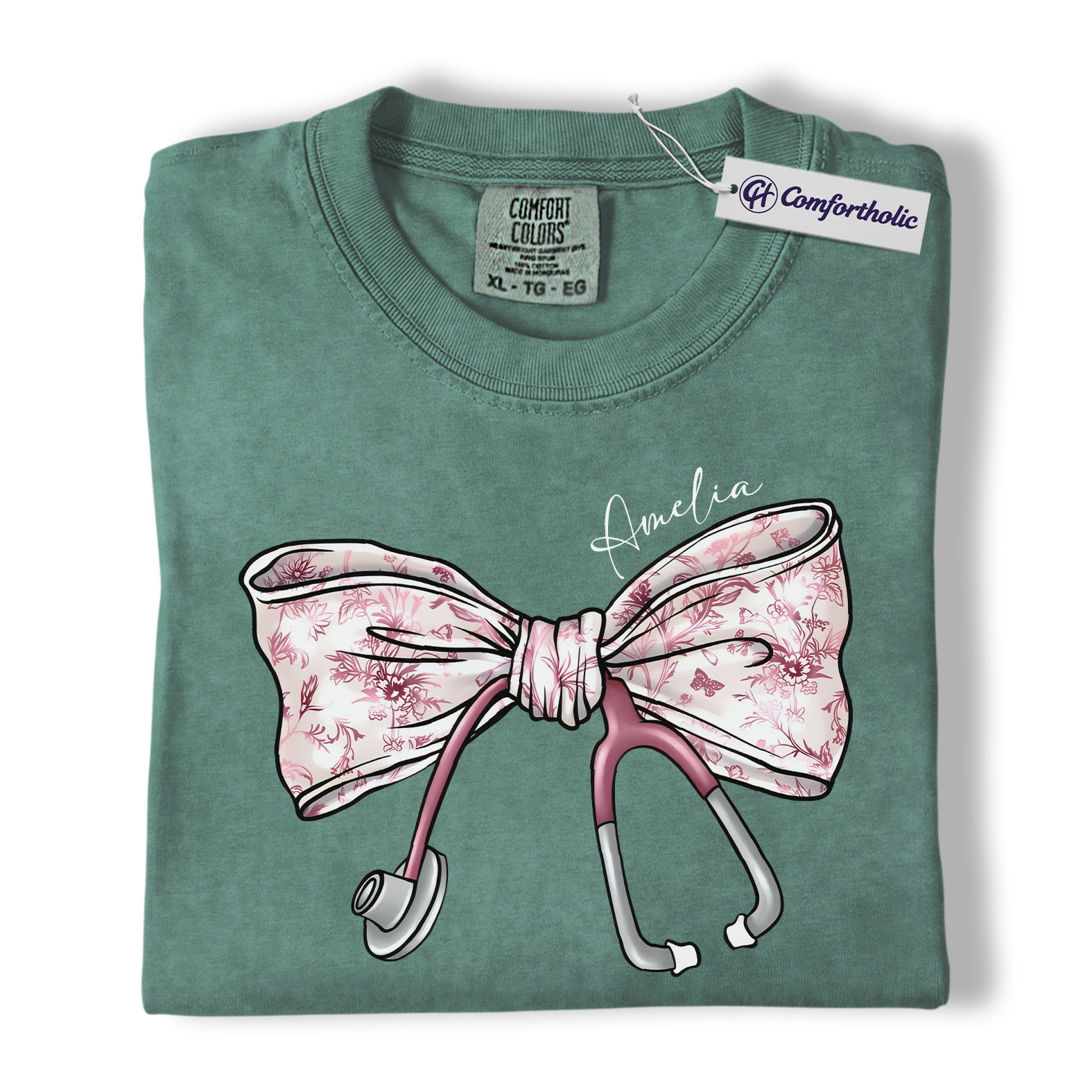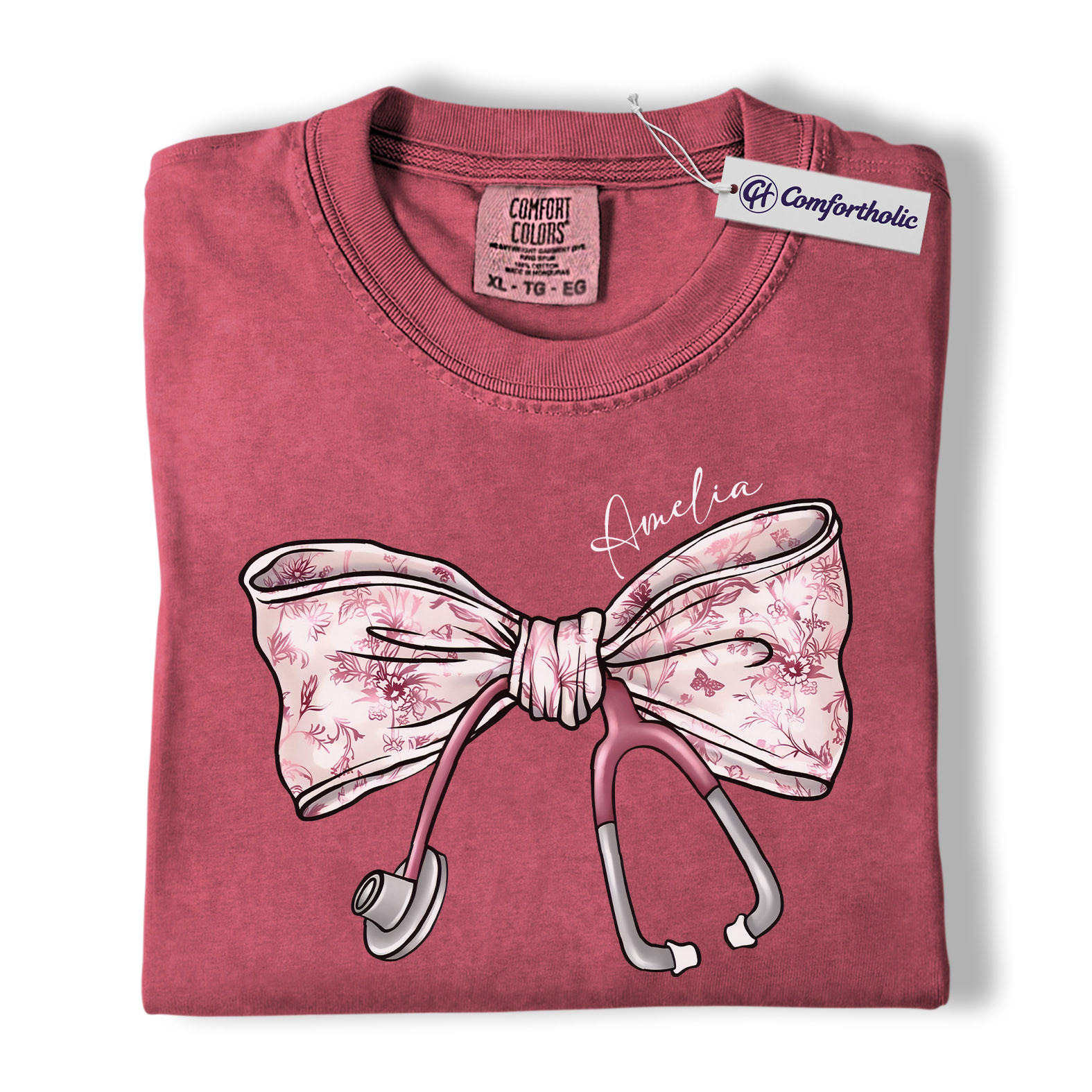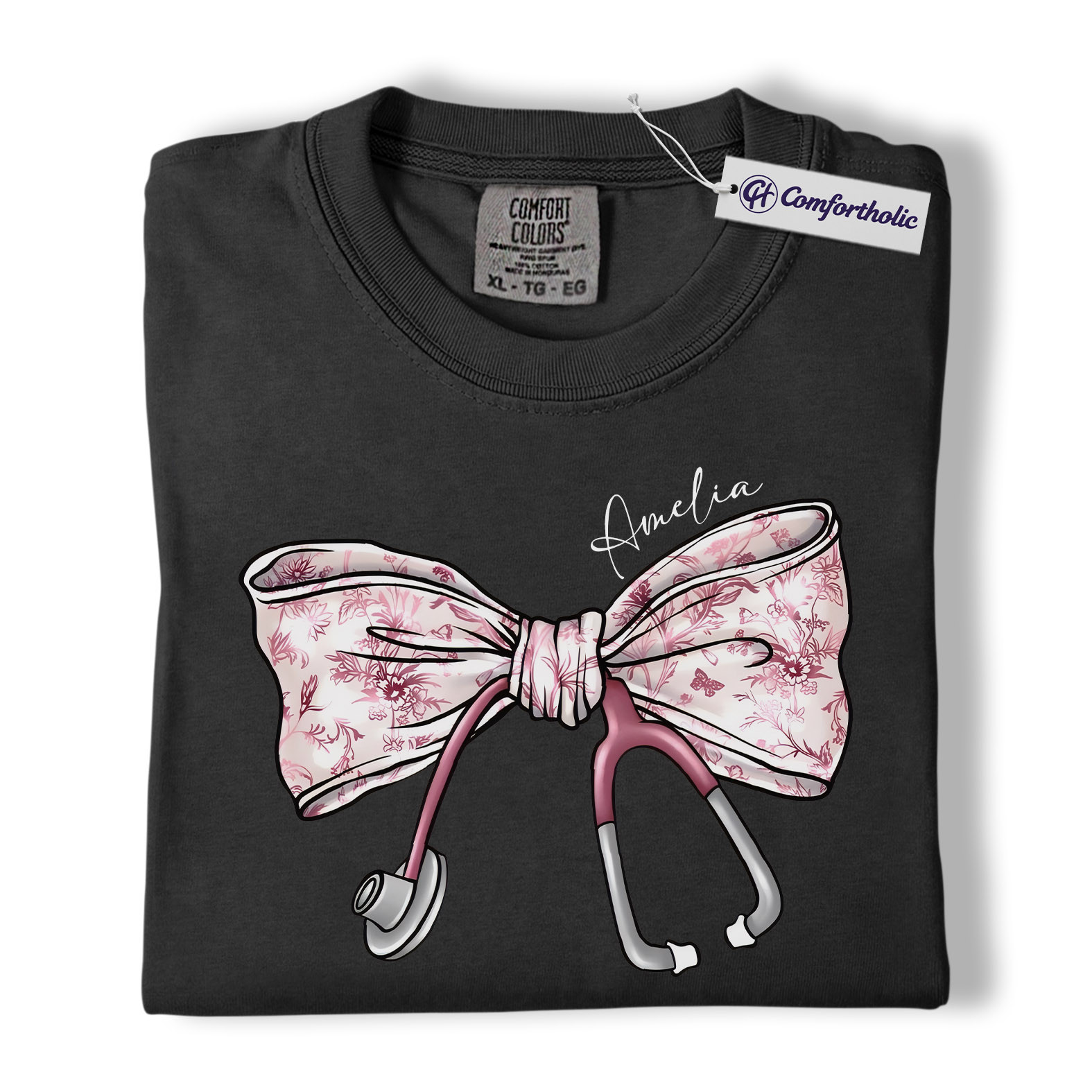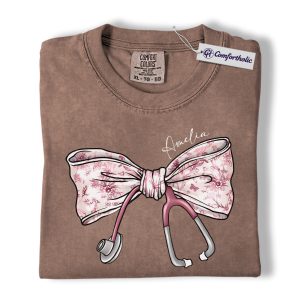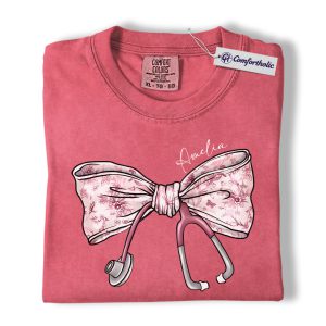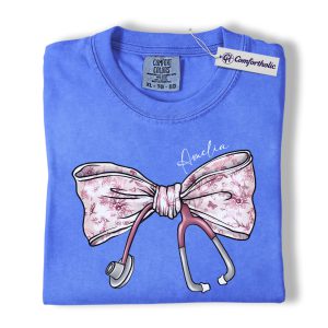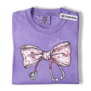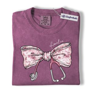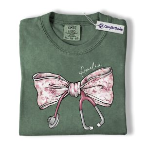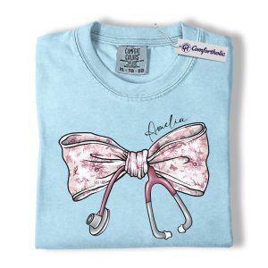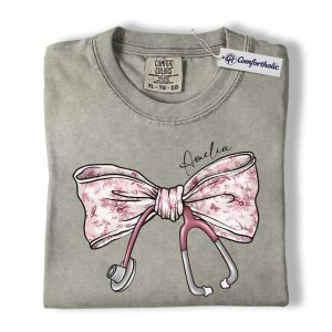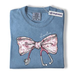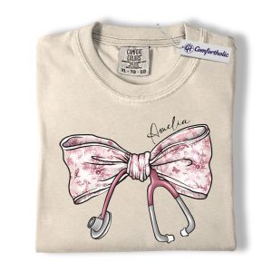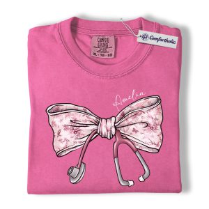 Personalized Nurse Bow Shirt, Cute Stethoscope Graphic Tee, Custom Name RN LPN CNA T-Shirt, Gift for Nurses, Comfort Colors Shirt