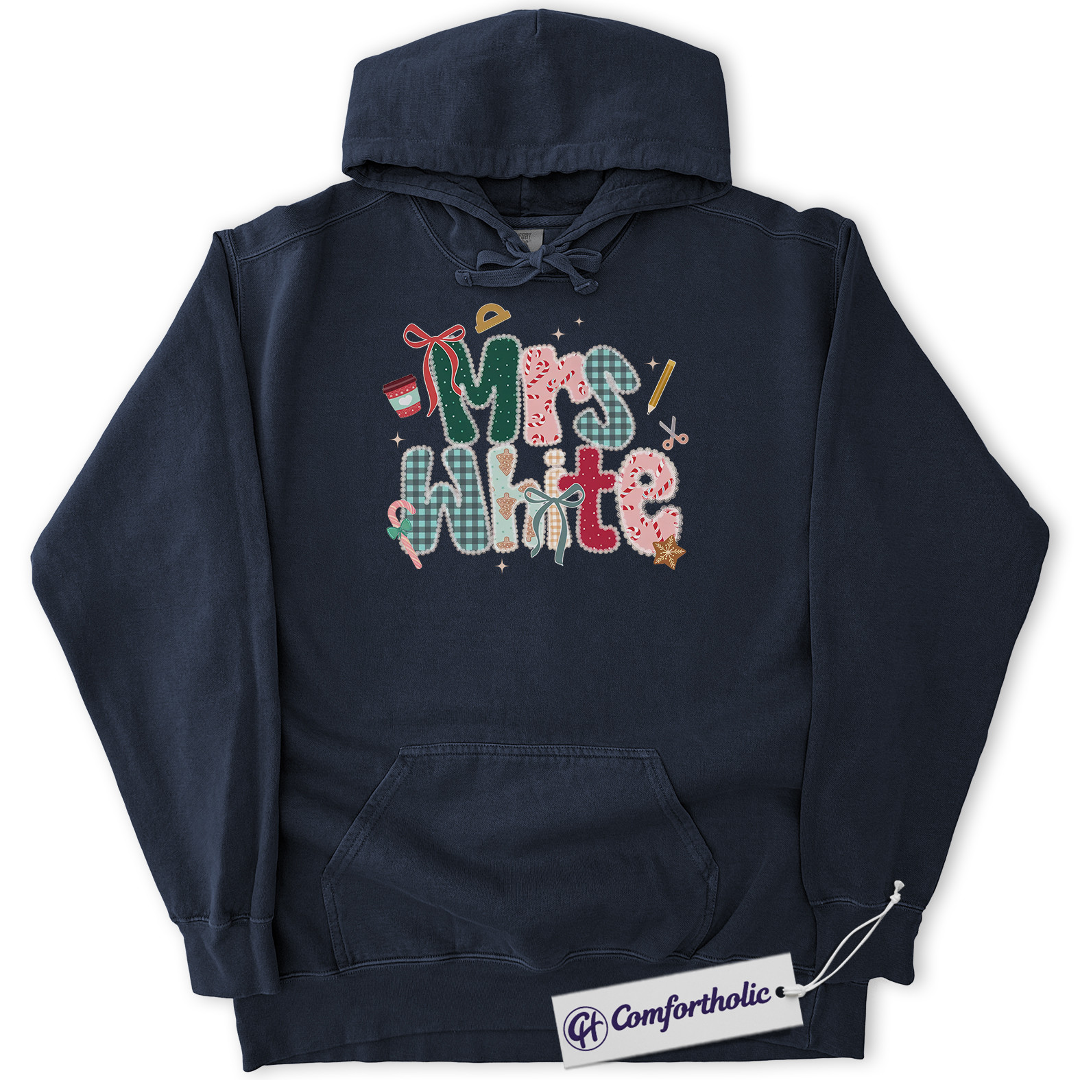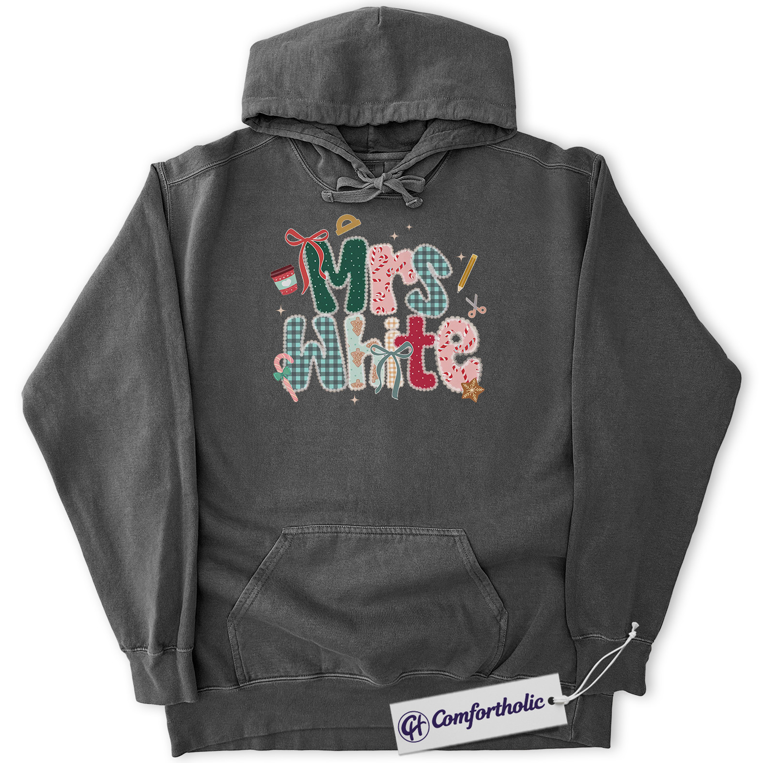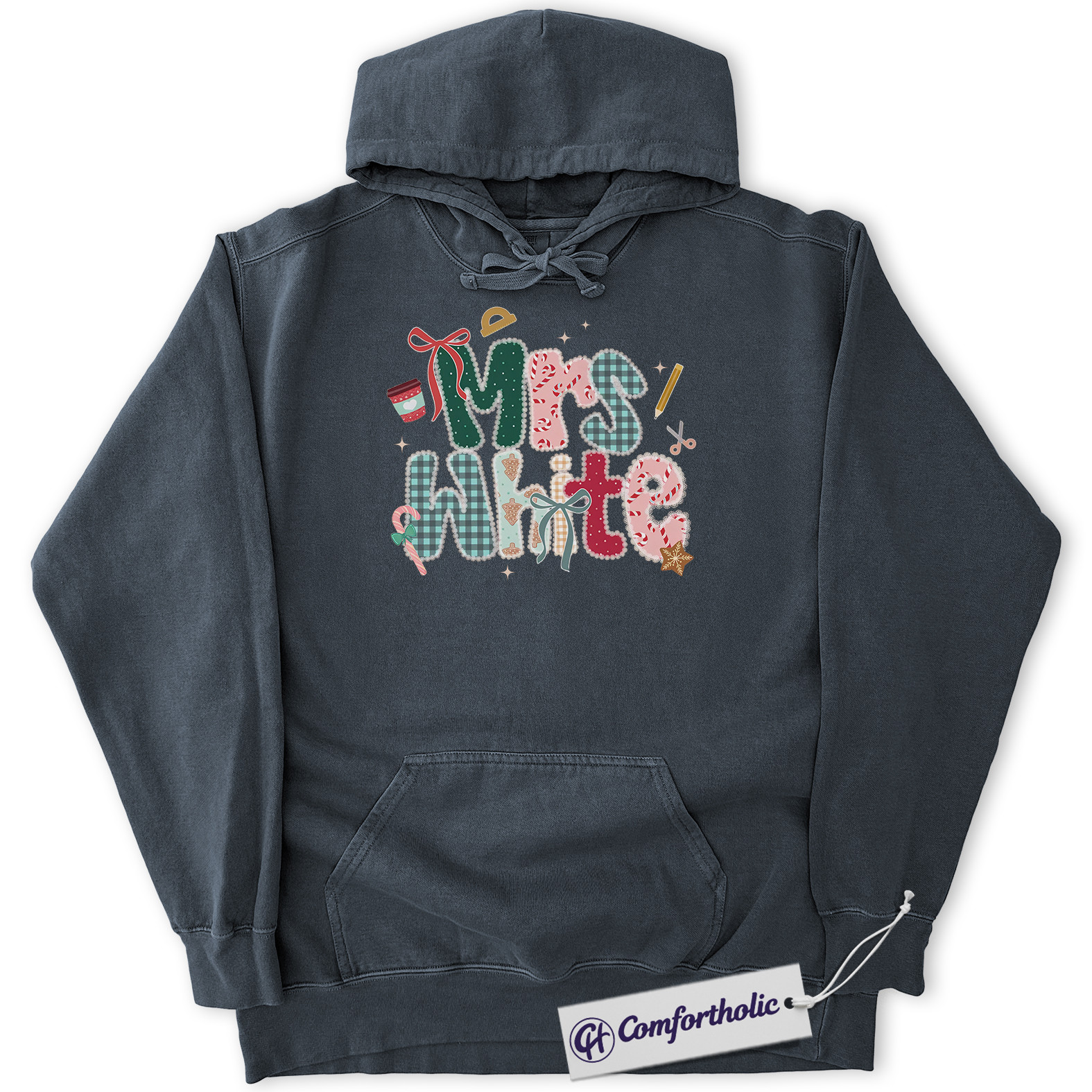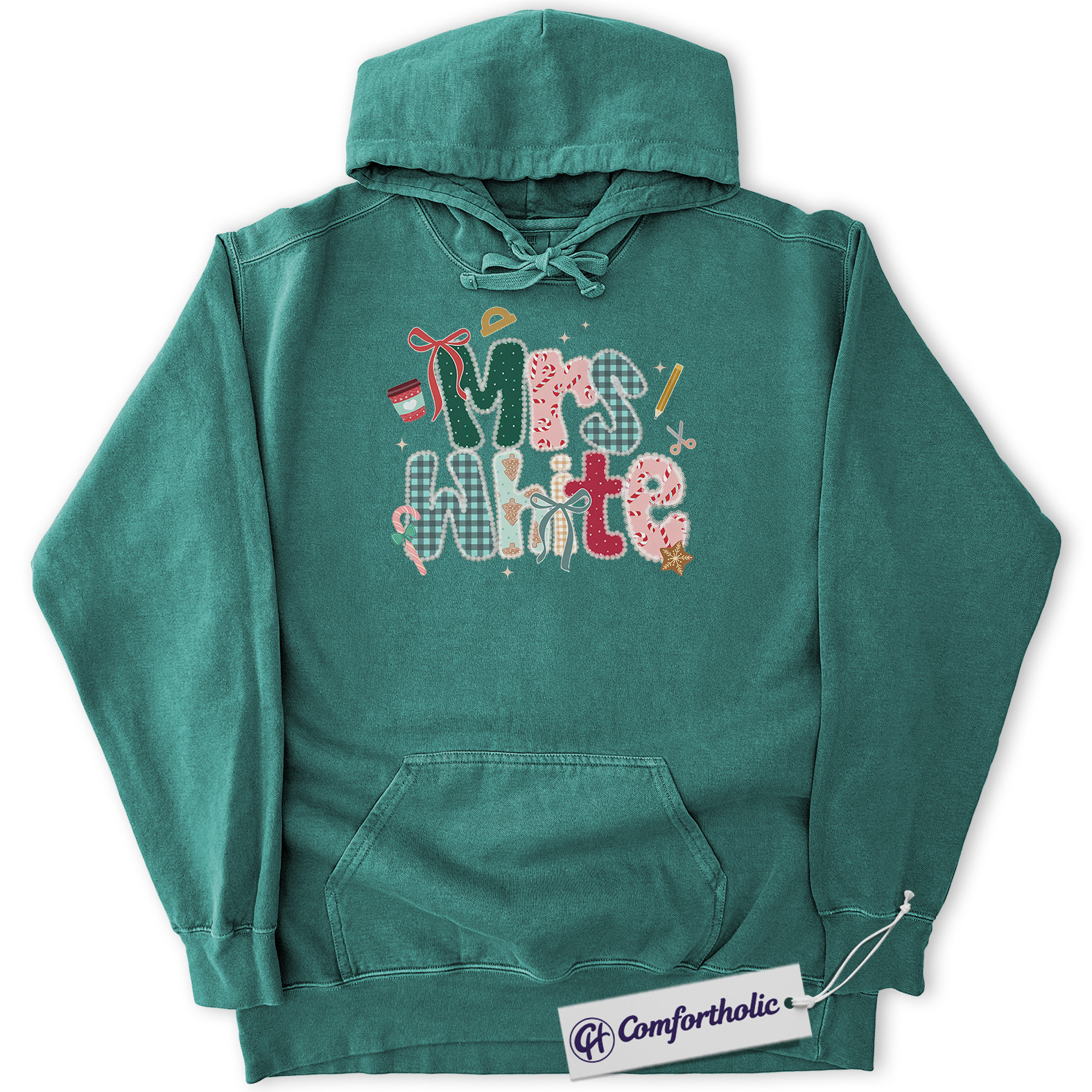 Personalized Teacher Christmas Hoodie, Custom Name Patchwork Holiday Hoodie, Cute Classroom Graphic Pullover, Festive Gift for Educators, Christmas Comfort Colors Hoodie