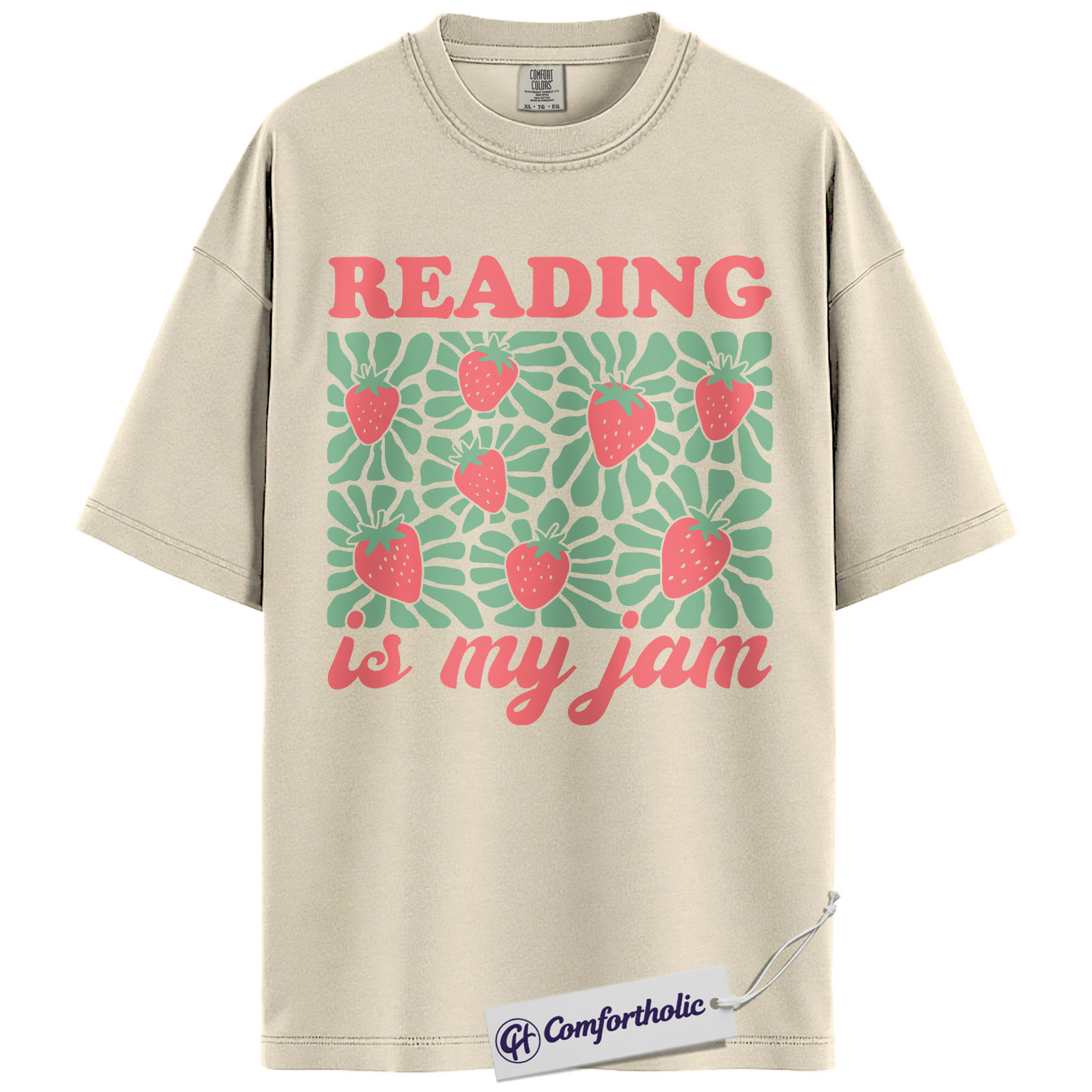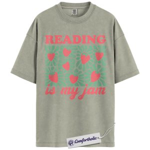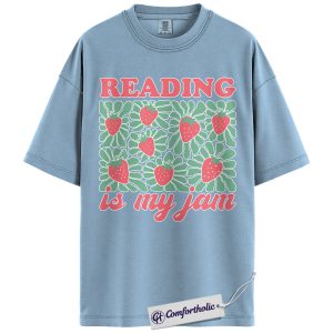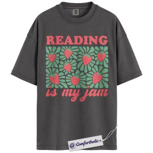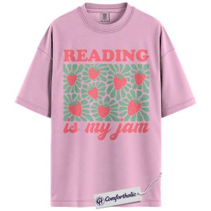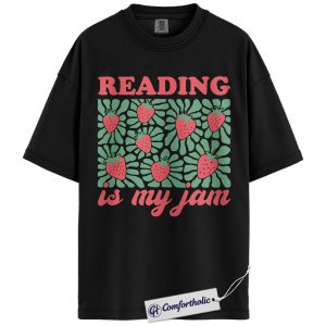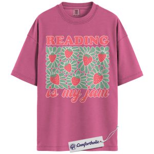 Reading Is My Jam Shirt, Strawberry Pattern Bookish Graphic Tee, Cute Reader Book Lover T-Shirt, Gift for Librarian & Book Club Friends, Comfort Colors Shirt