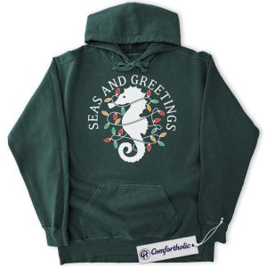 Seas and Greetings Hoodie, Funny Coastal Christmas Hoodie, Seahorse Holiday Graphic Pullover, Beach Lover Festive Gift, Christmas Comfort Colors Hoodie