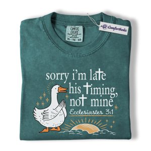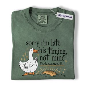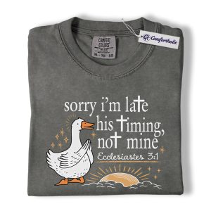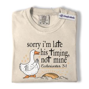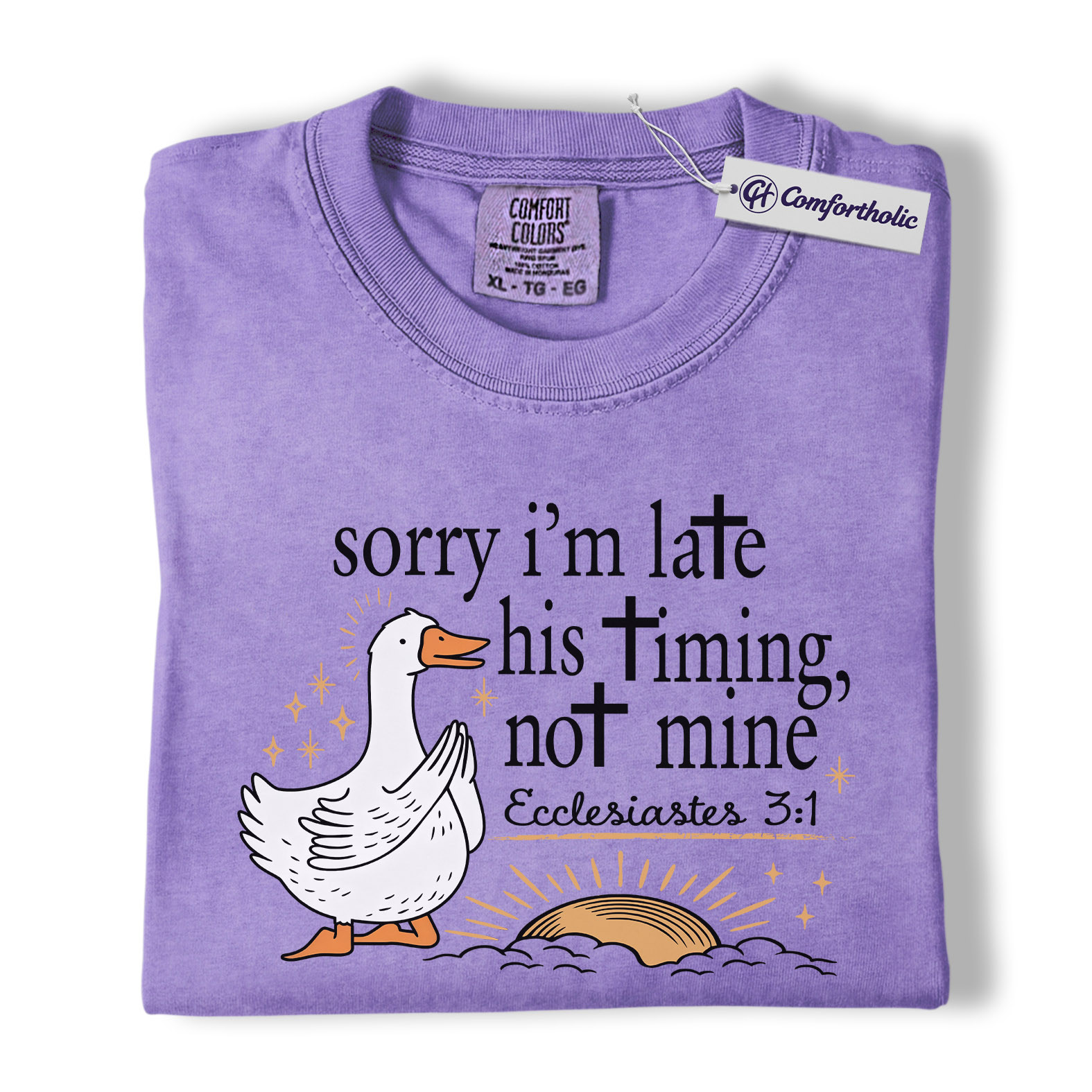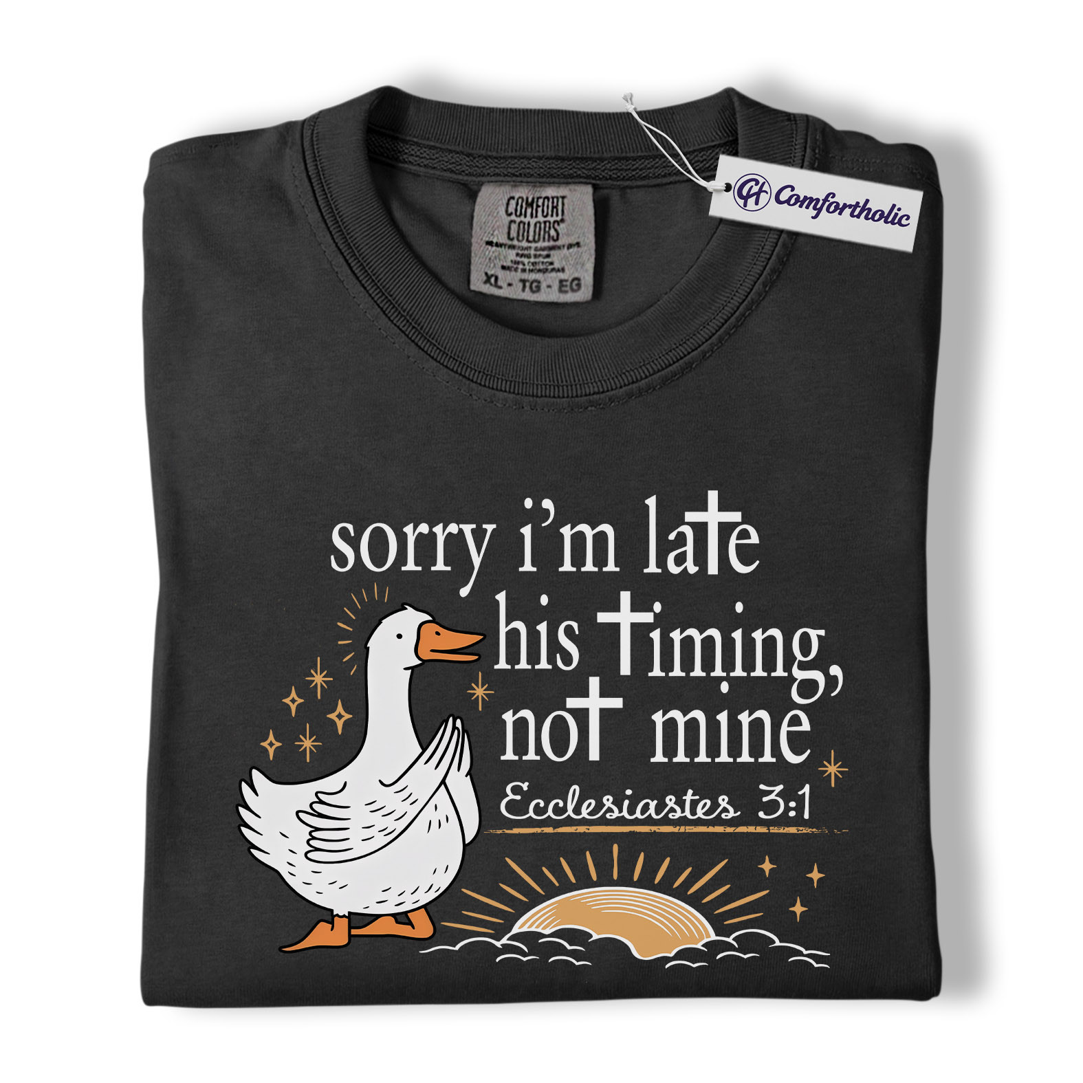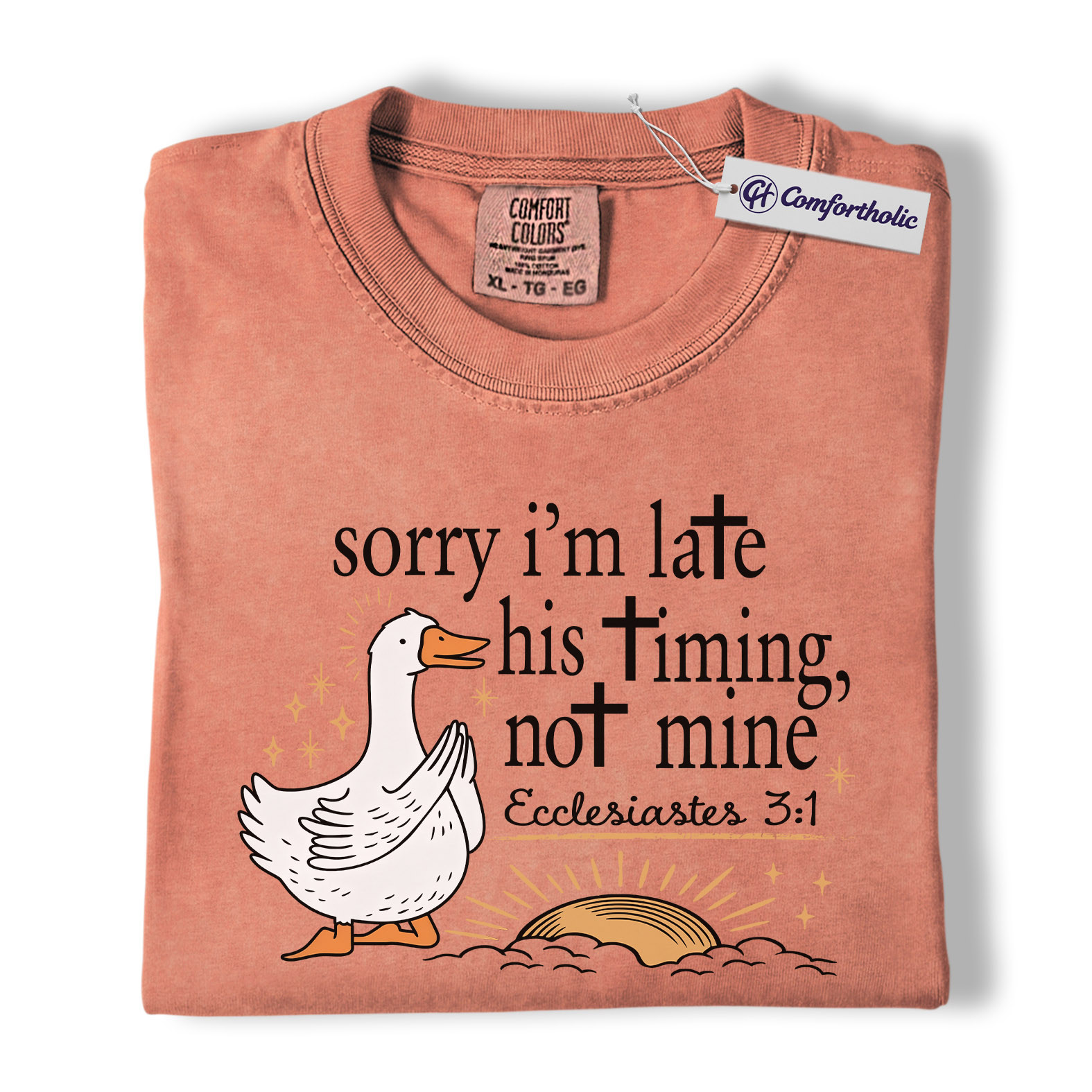 Sorry I’m Late His Timing Not Mine Shirt, Cute Christian Goose Graphic Tee, Ecclesiastes 3:1 Bible Verse T-Shirt, Faith Gift for Women, Comfort Colors Shirt