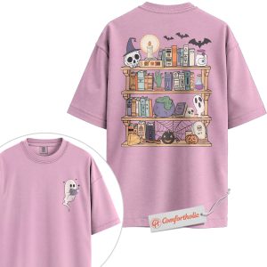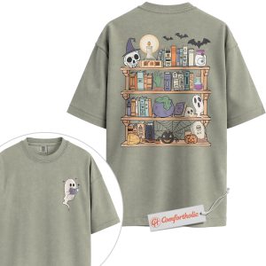 Spooky Bookshelf Shirt, Halloween Book Lover T-Shirt, Witchy Ghost Graphic Tee, Fall Comfort Colors Shirt 2-Sided