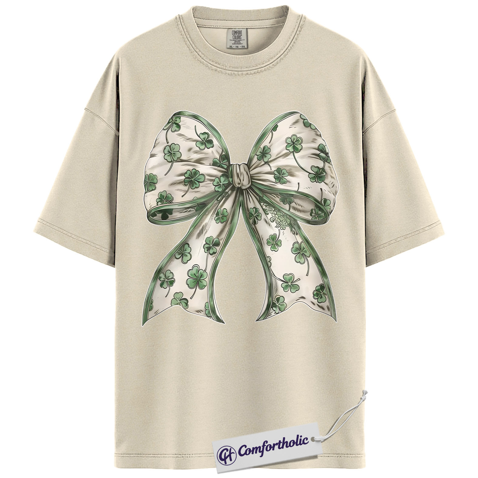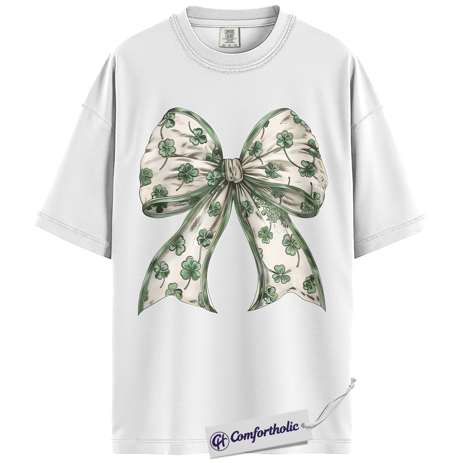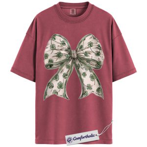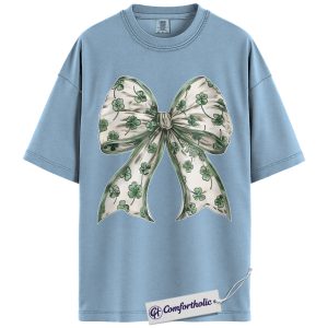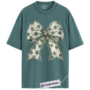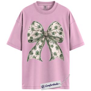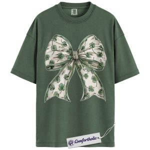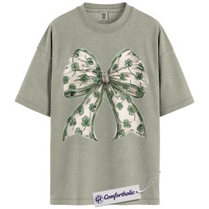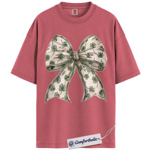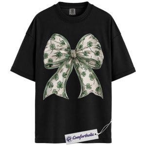 St Patrick’s Day Bow Shirt, Shamrock Coquette Ribbon Graphic Tee, Lucky Irish Clover T-Shirt, St Paddy’s Day Gift for Women Girls & Friends, Comfort Colors Shirt