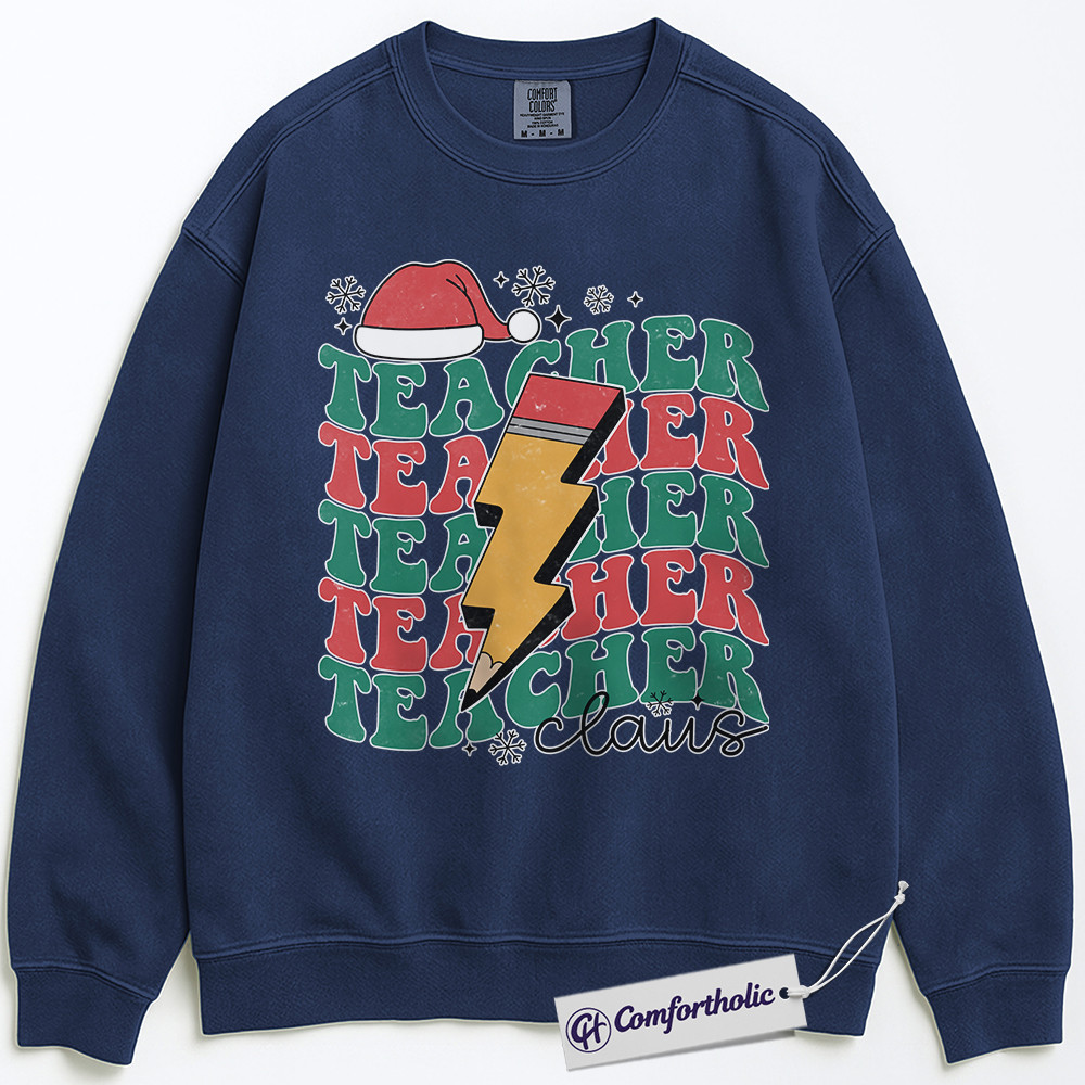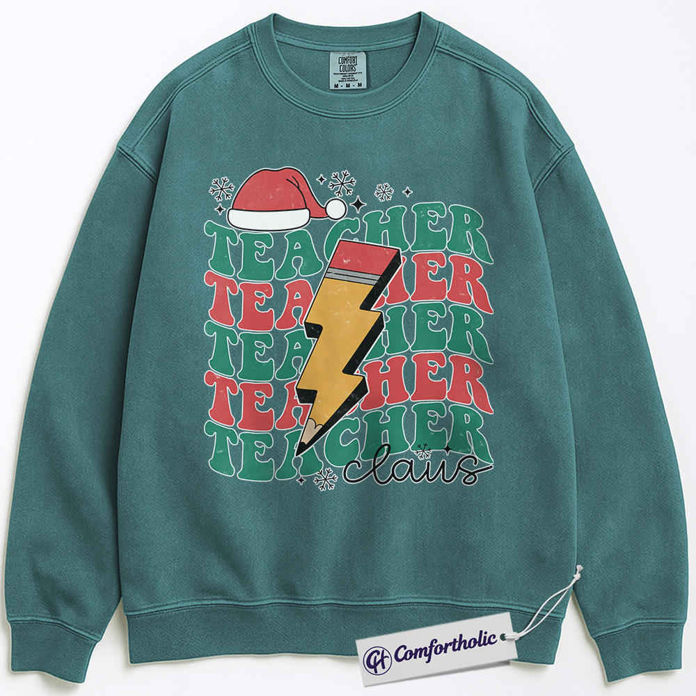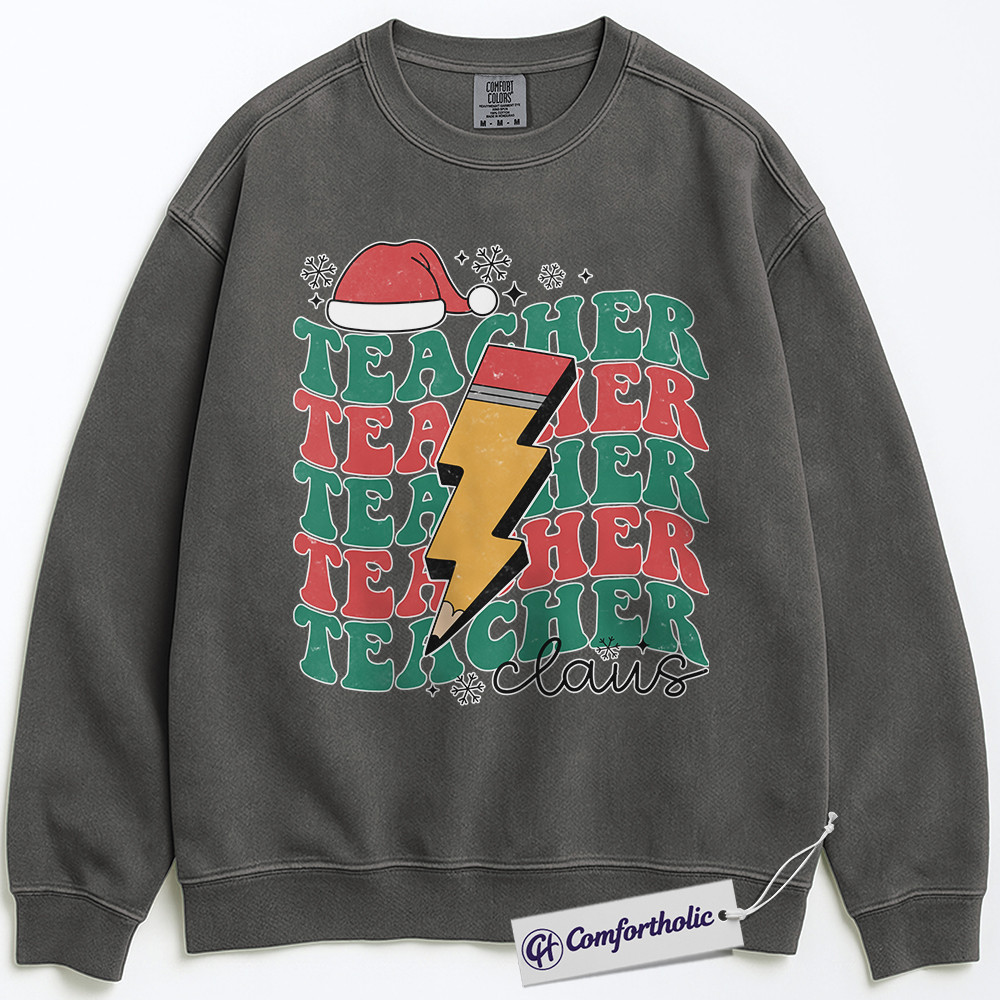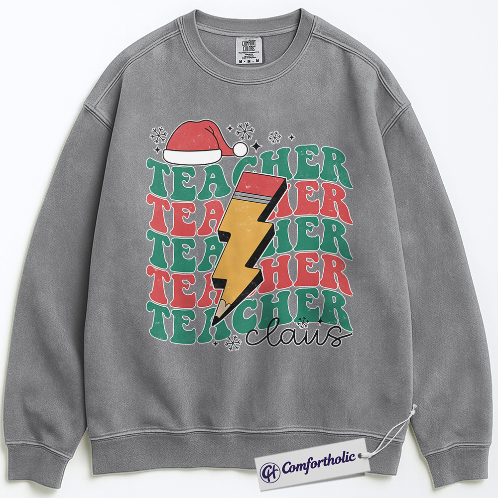 Teacher Claus Christmas Crewneck, Funny Holiday Teacher Sweatshirt, Retro Lightning Bolt Graphic Pullover, Cute Gift for Educators and School Staff, Christmas Comfort Colors Sweatshirt