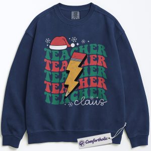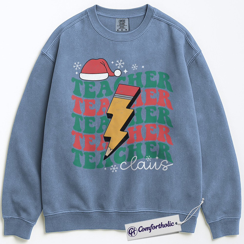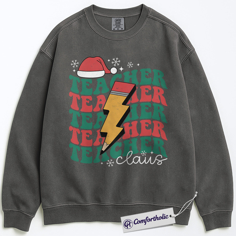 Teacher Claus Christmas Sweatshirt, Funny Holiday Teacher Pullover, Lightning Bolt Retro Graphic Sweatshirt, Cute Gift for Educators and School Staff, Christmas Comfort Colors Sweatshirt