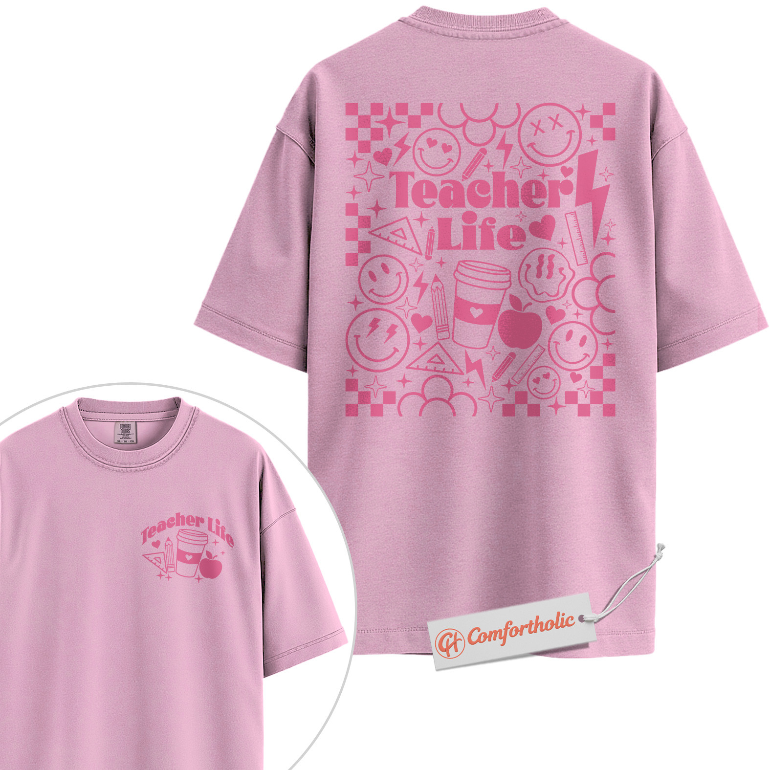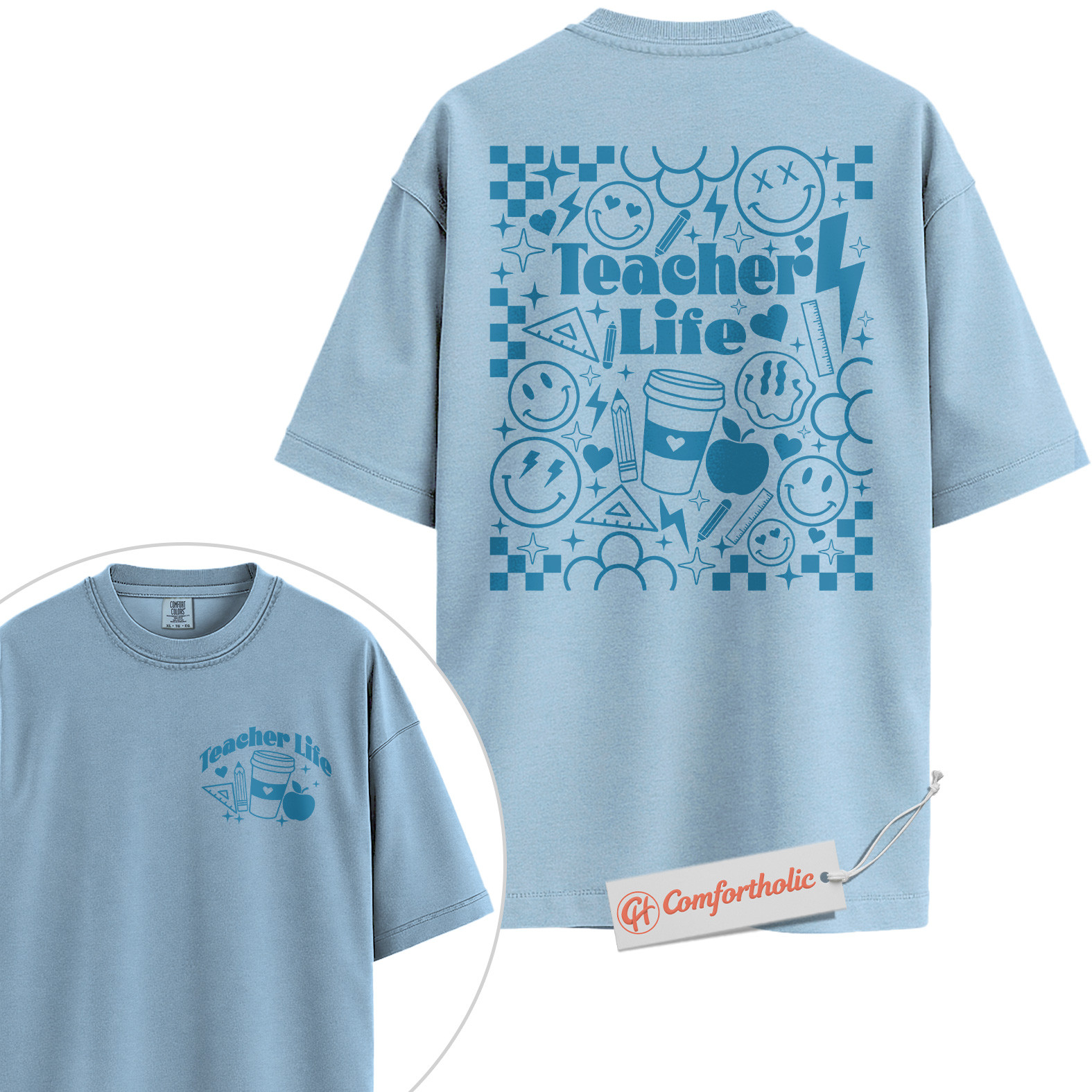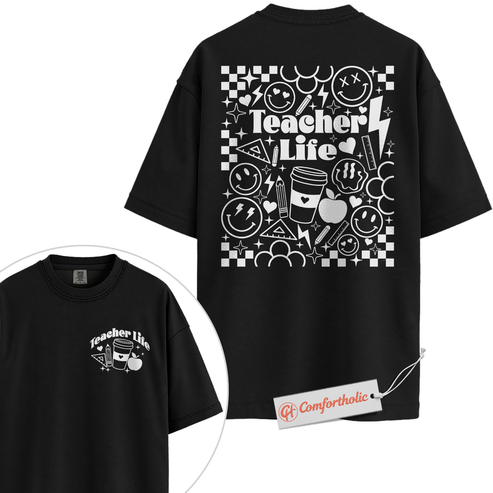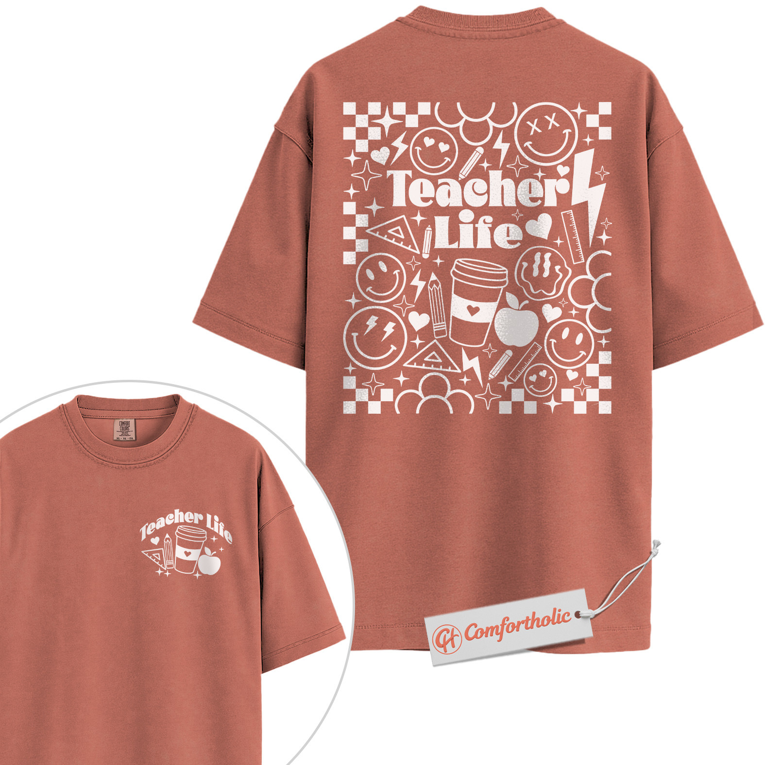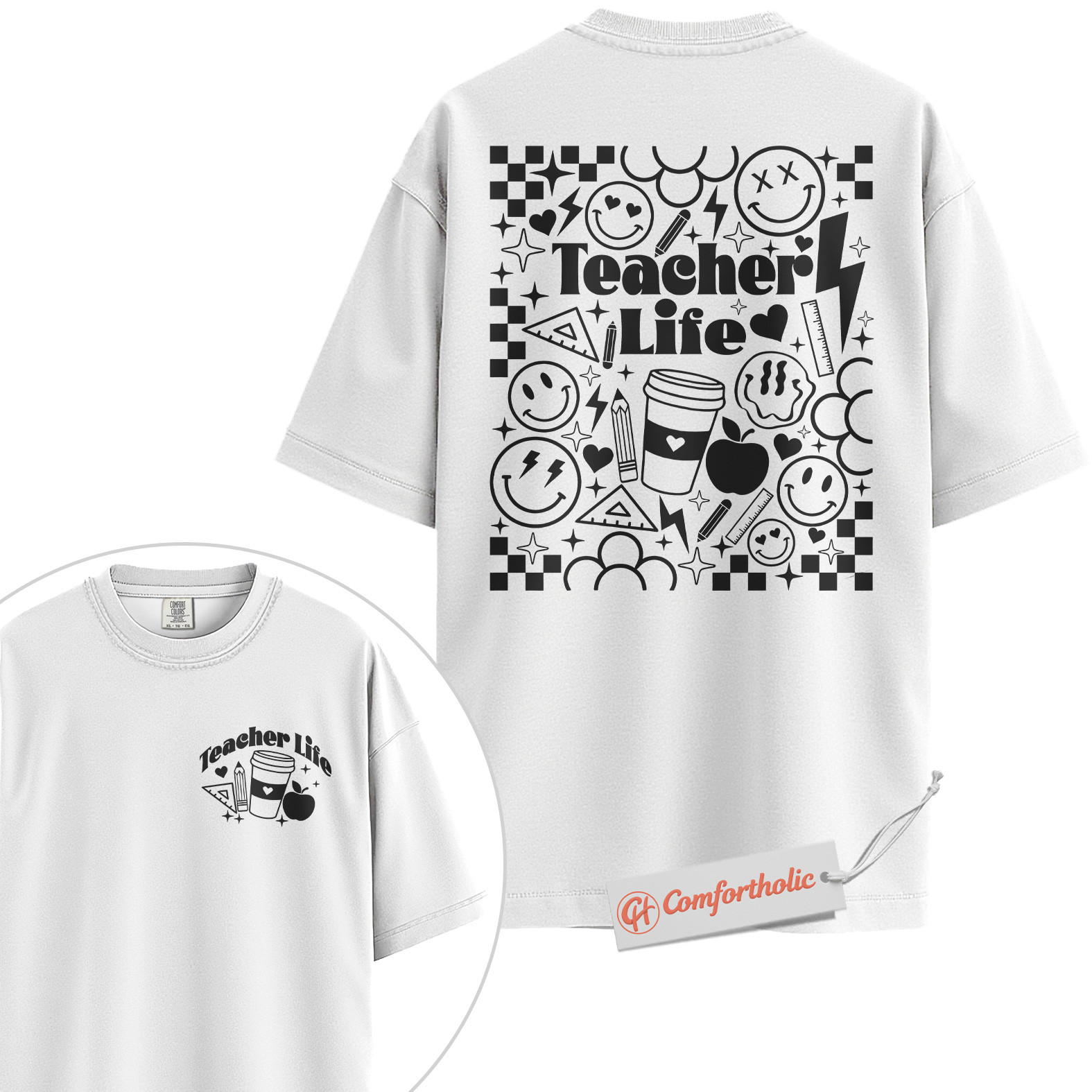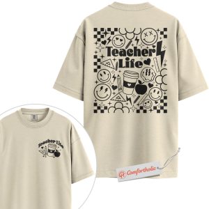 Teacher Life Shirt, Retro Smiley Teacher T-Shirt, Cute Back to School Graphic Tee, Aesthetic Coffee & Classroom Gift for Educators, Comfort Colors Shirt 2-Sided
