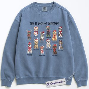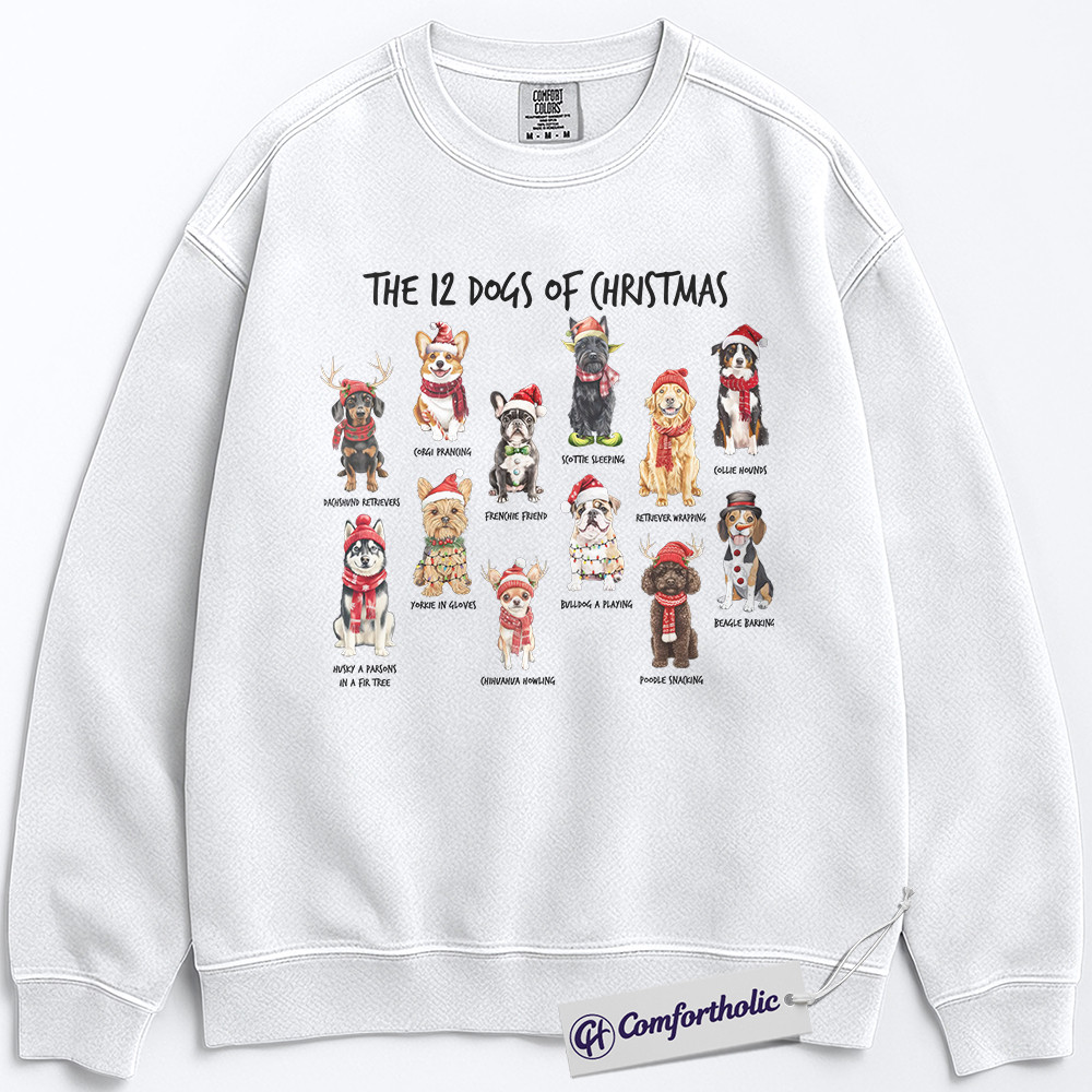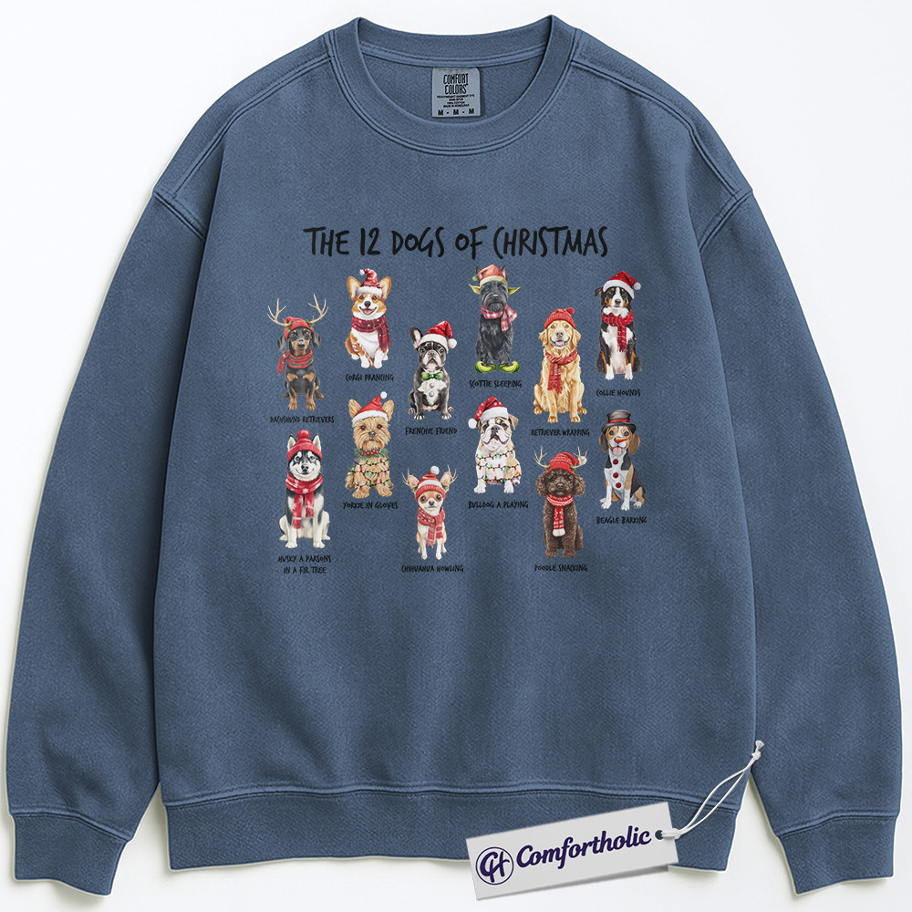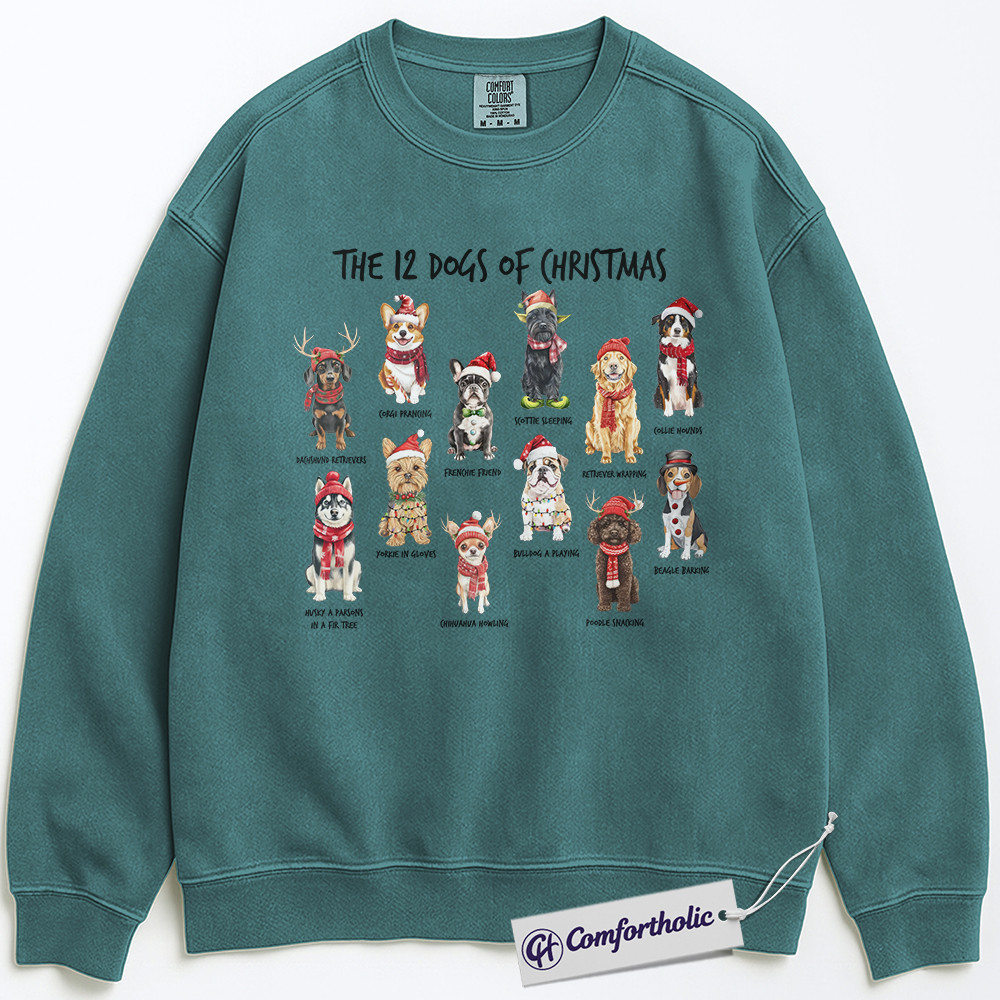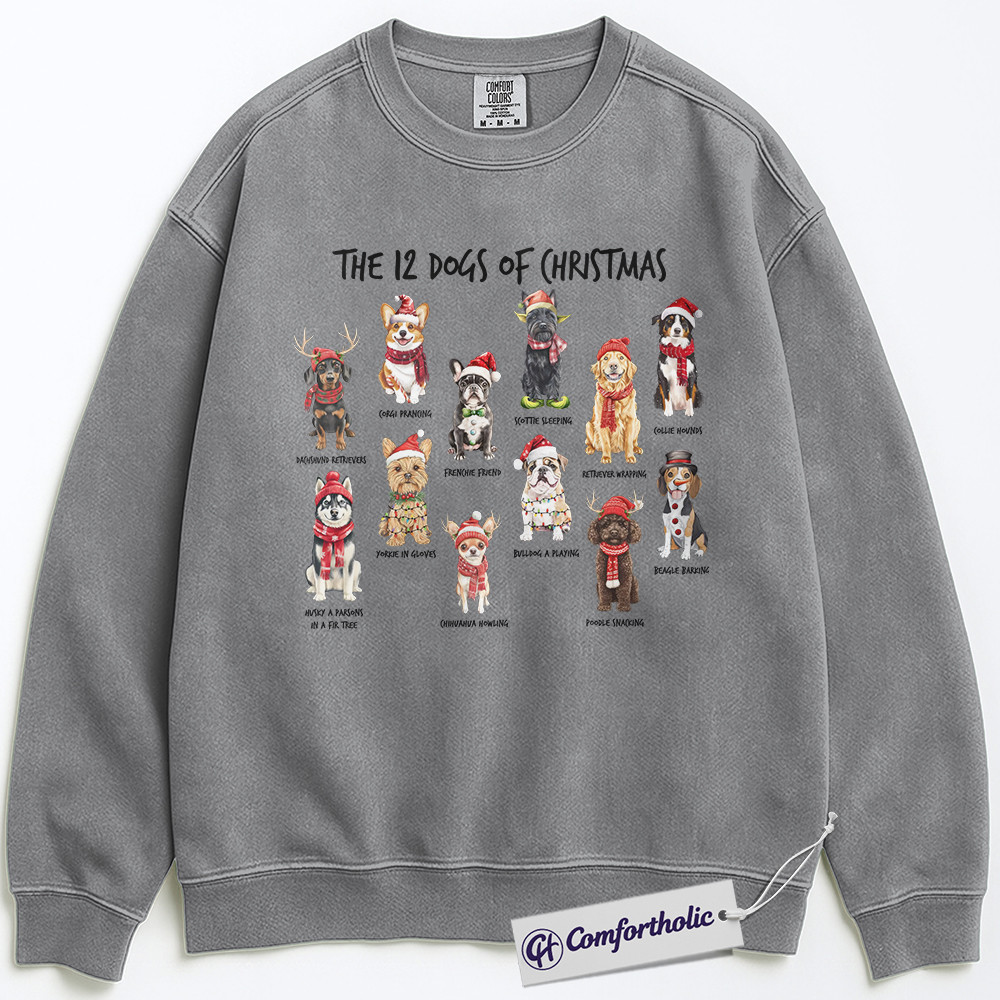 The 12 Dogs of Christmas Sweatshirt, Funny Dog Lover Holiday Pullover, Cute Pet Breed Graphic Sweatshirt, Christmas Gift for Dog Moms and Animal Lovers, Christmas Comfort Colors Sweatshirt