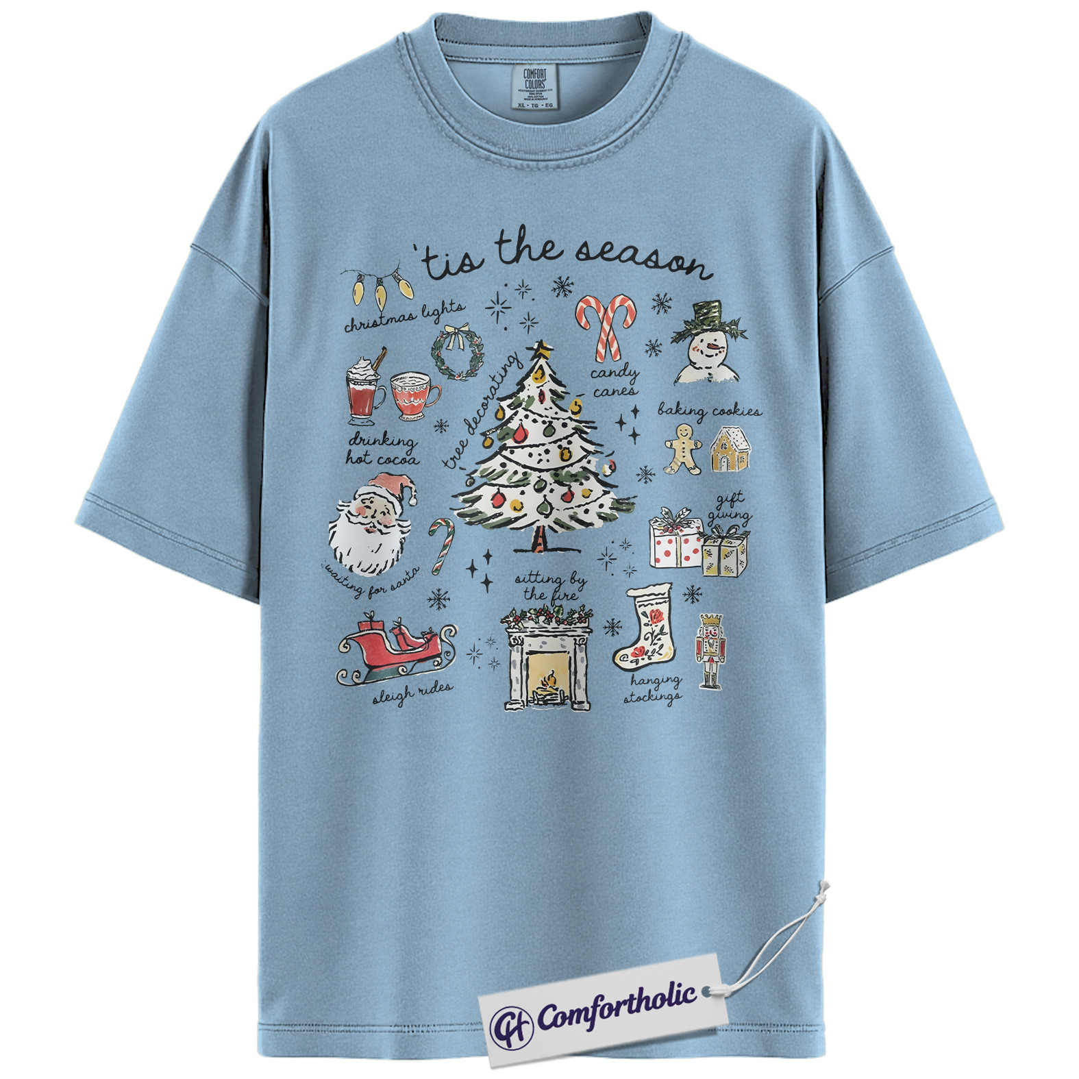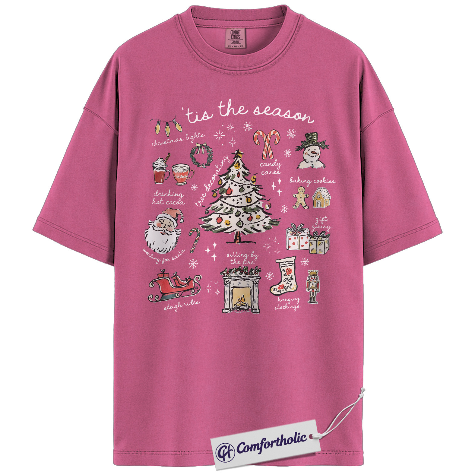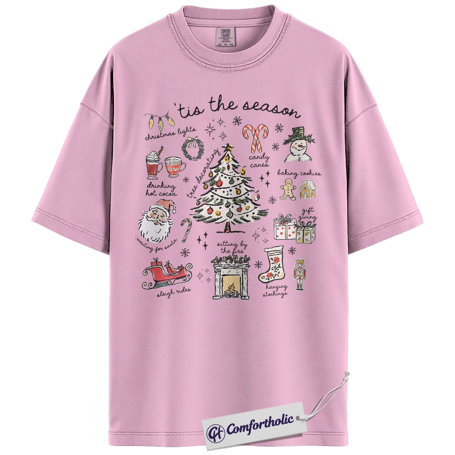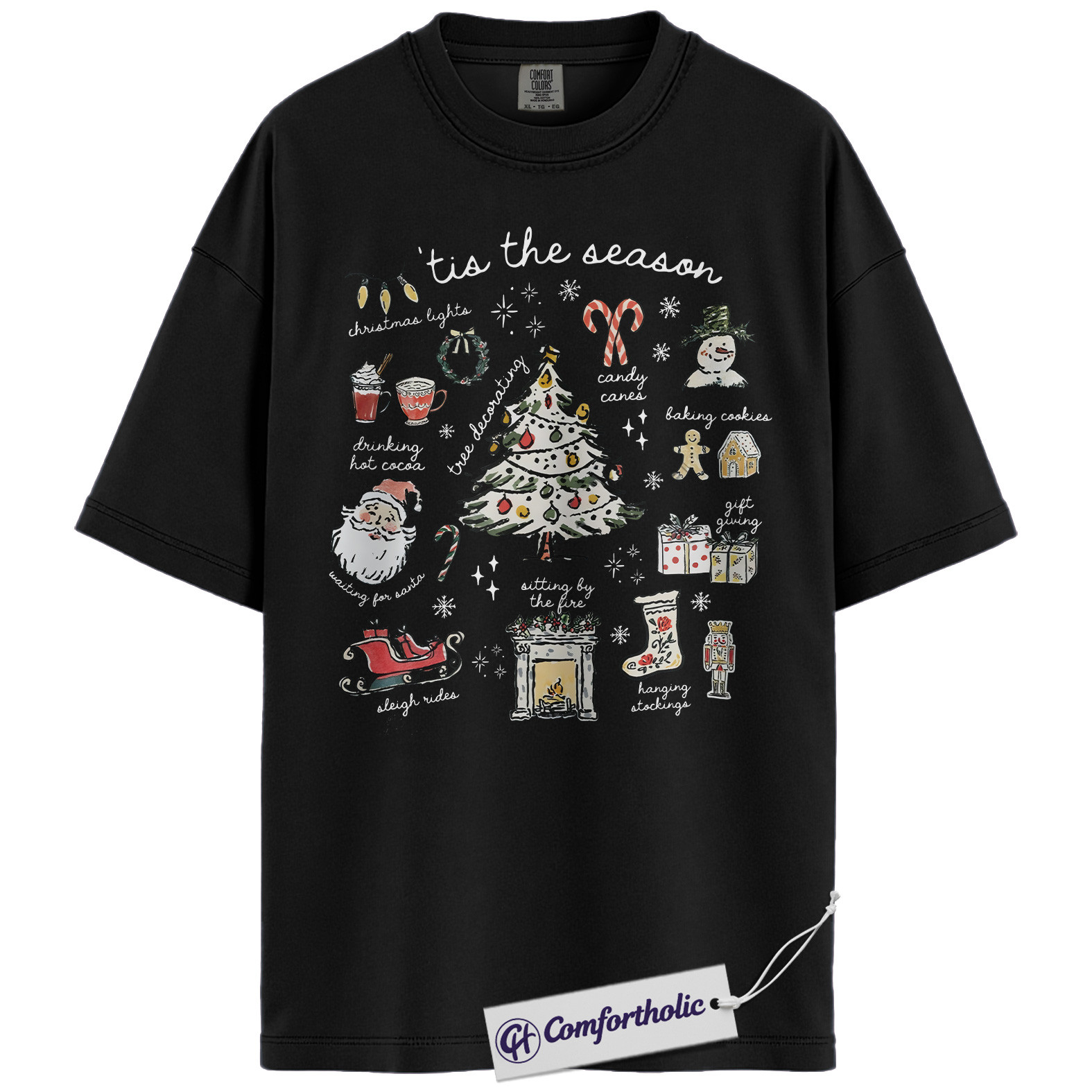 Tis the Season Christmas Shirt, Cozy Holiday Aesthetic T-Shirt, Cute Festive Graphic Tee with Santa and Christmas Tree, Winter Gift for Women, Christmas Comfort Colors Shirt