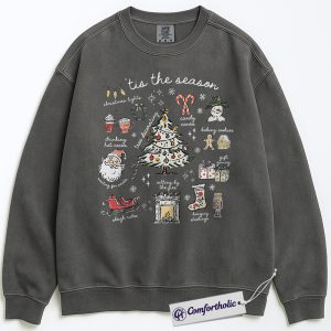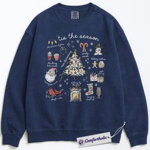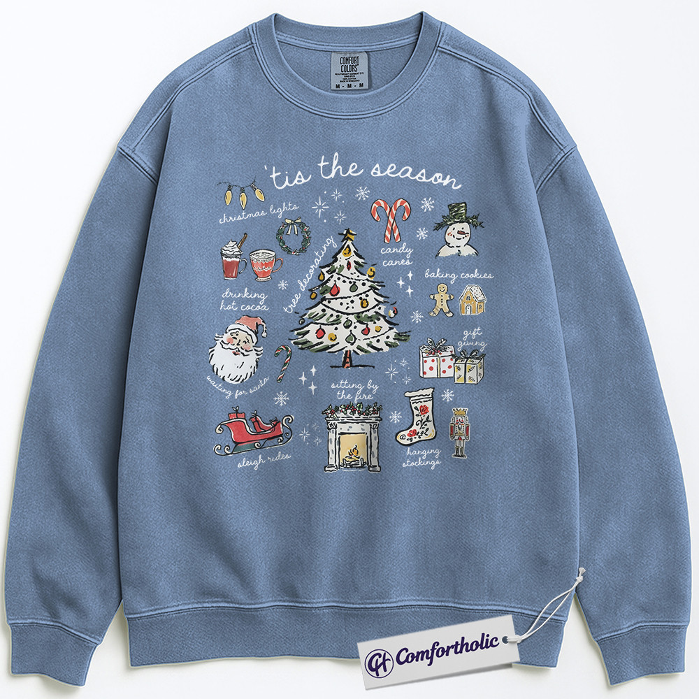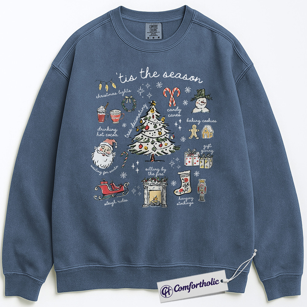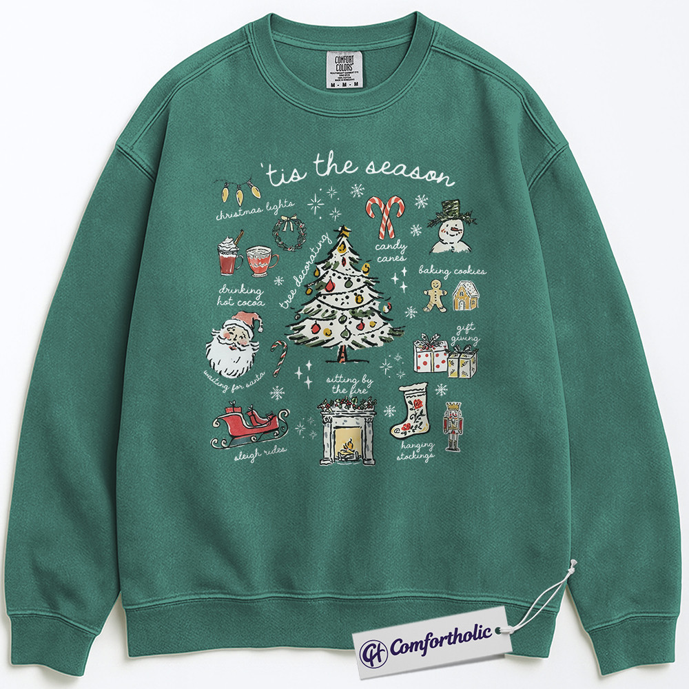 Tis the Season Christmas Sweatshirt, Cozy Holiday Aesthetic Pullover, Cute Festive Graphic Crewneck with Santa and Christmas Tree, Winter Gift for Women, Christmas Comfort Colors Sweatshirt