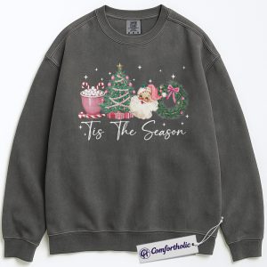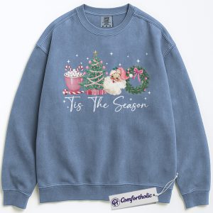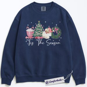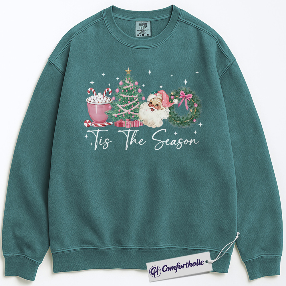 Tis The Season Christmas Sweatshirt, Retro Santa and Wreath Crewneck, Cute Pink Holiday Graphic Pullover, Festive Winter Gift for Women, Comfort Colors Sweatshirt