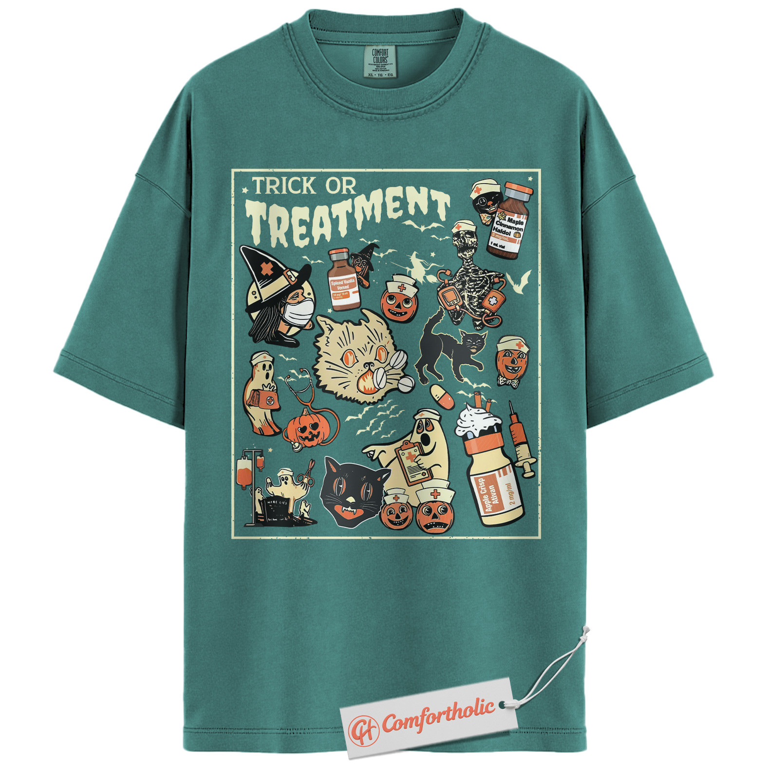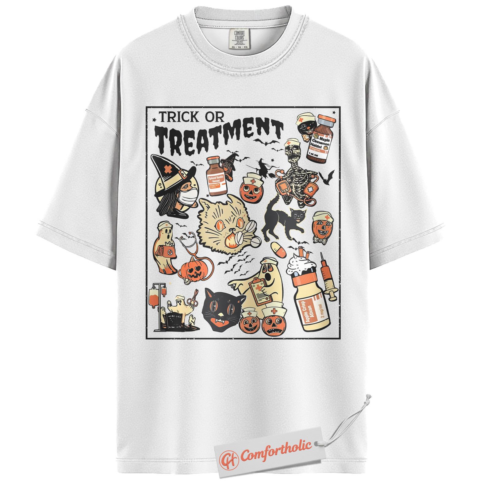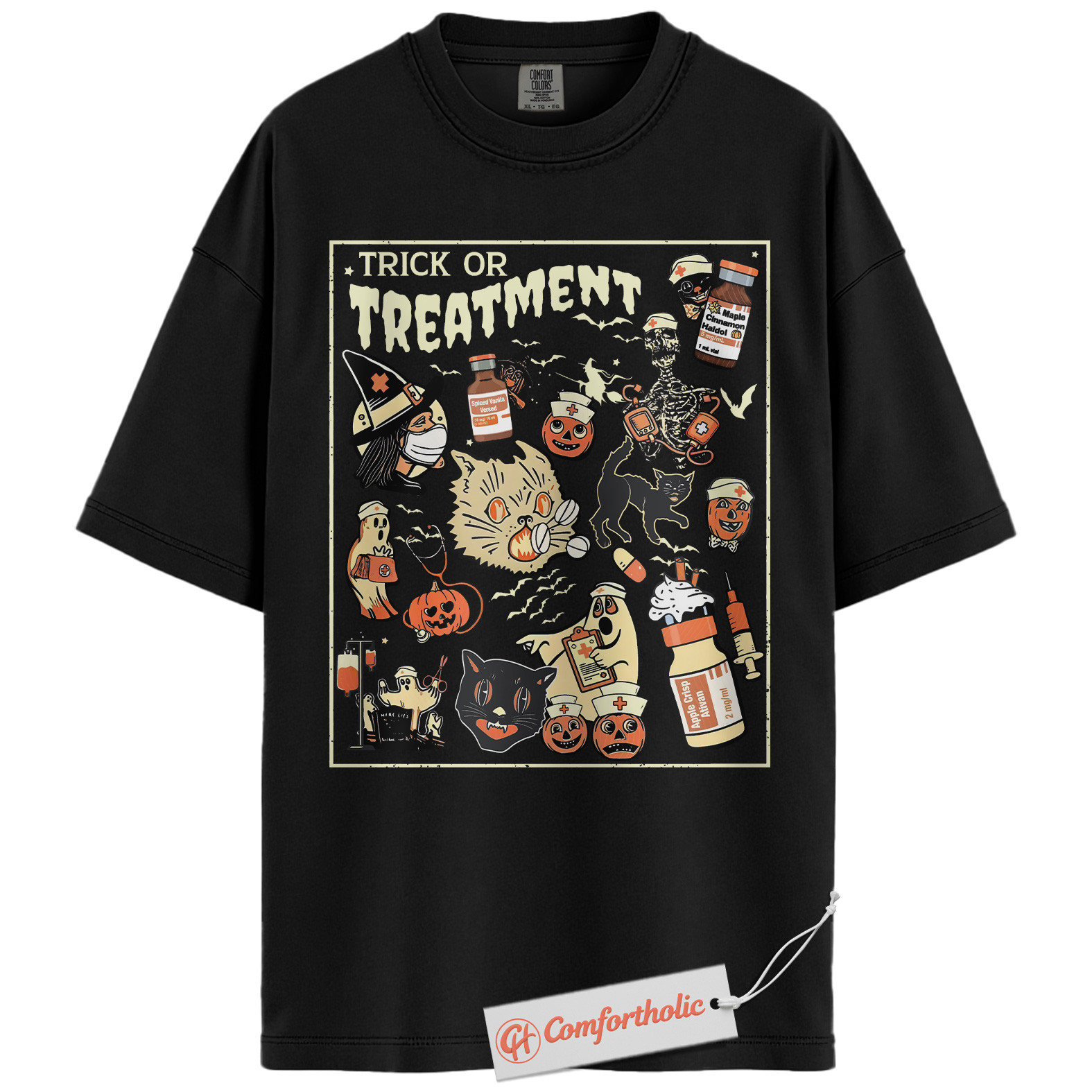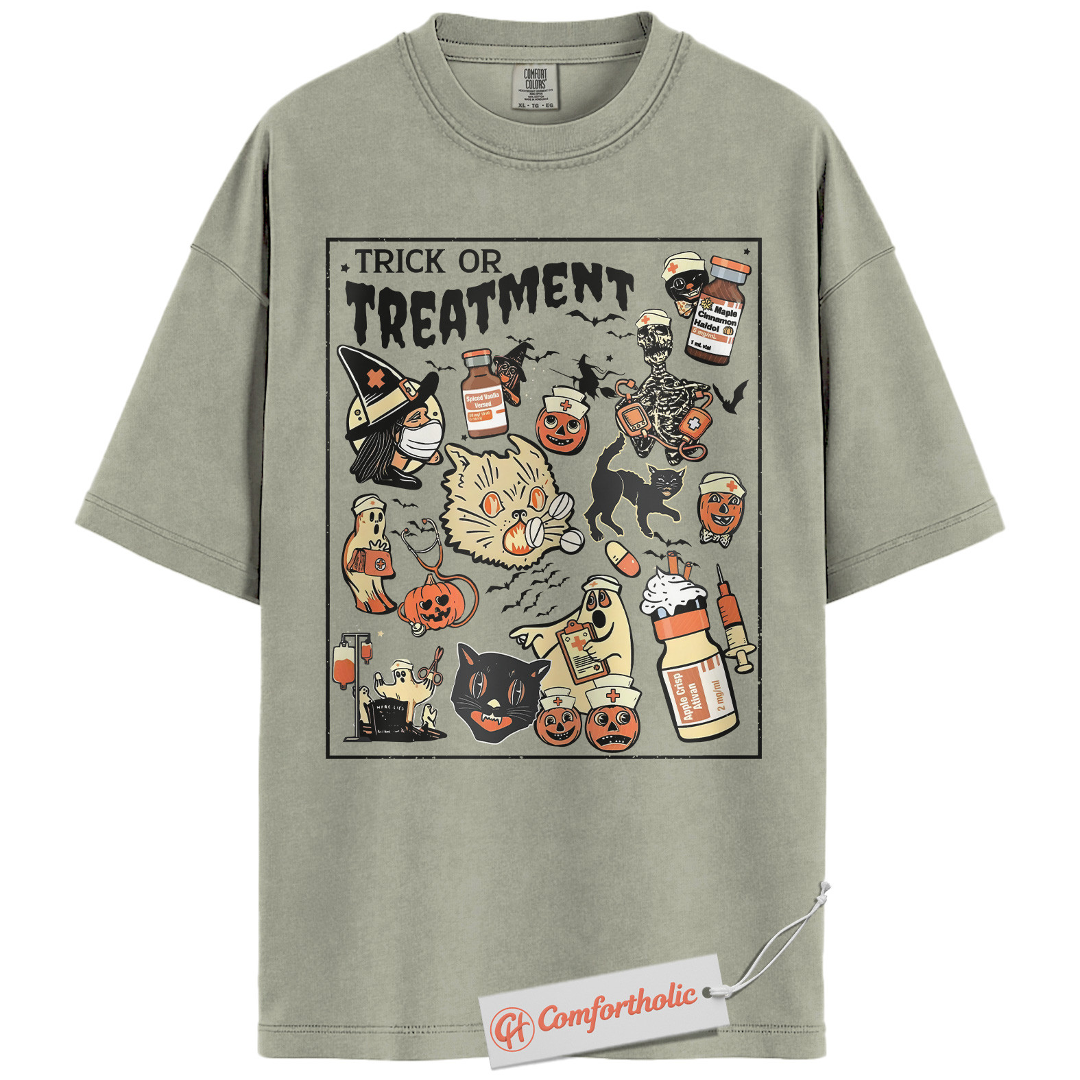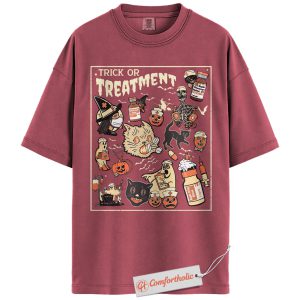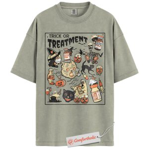 Trick or Treatment Shirt, Funny Halloween Nurse T-Shirt, Spooky Medical Cat Graphic Tee, Gift for Veterinary Workers & Pet Lovers, Halloween Comfort Colors Shirt