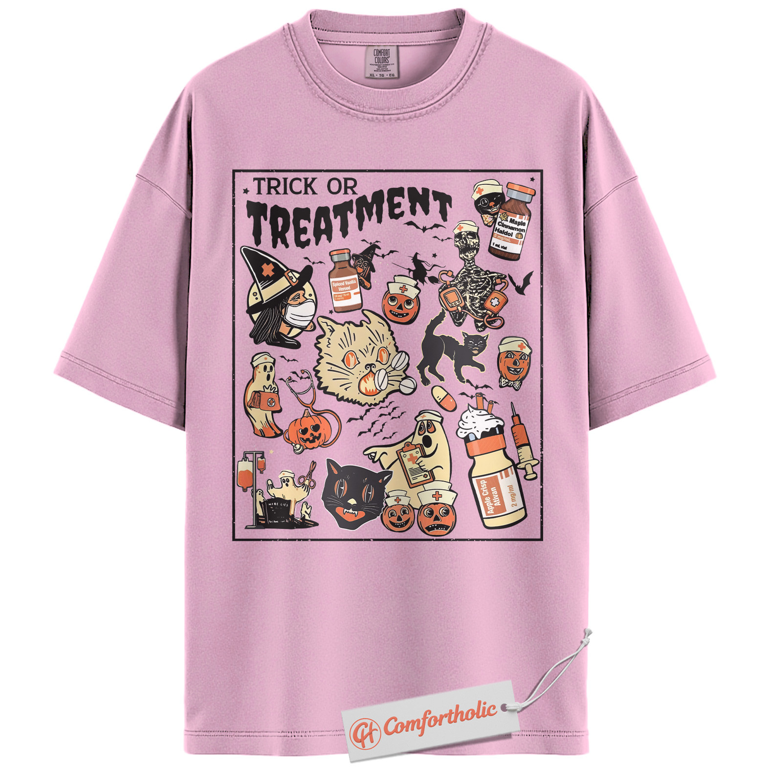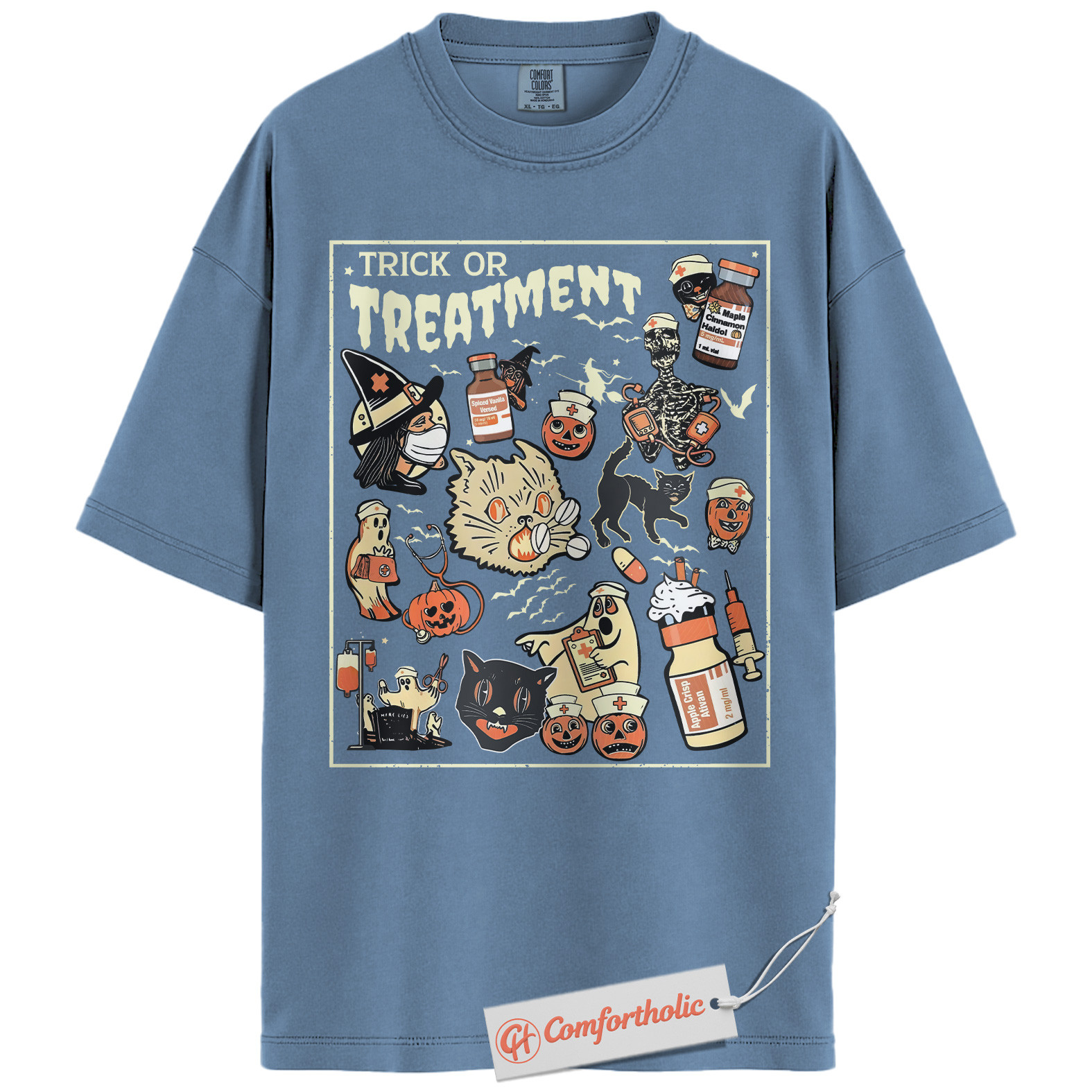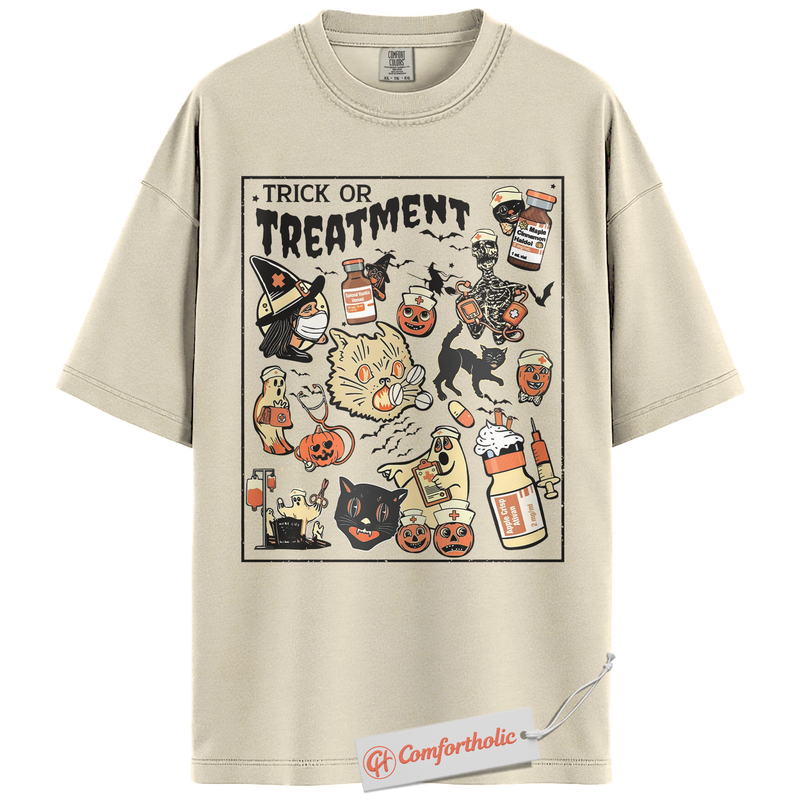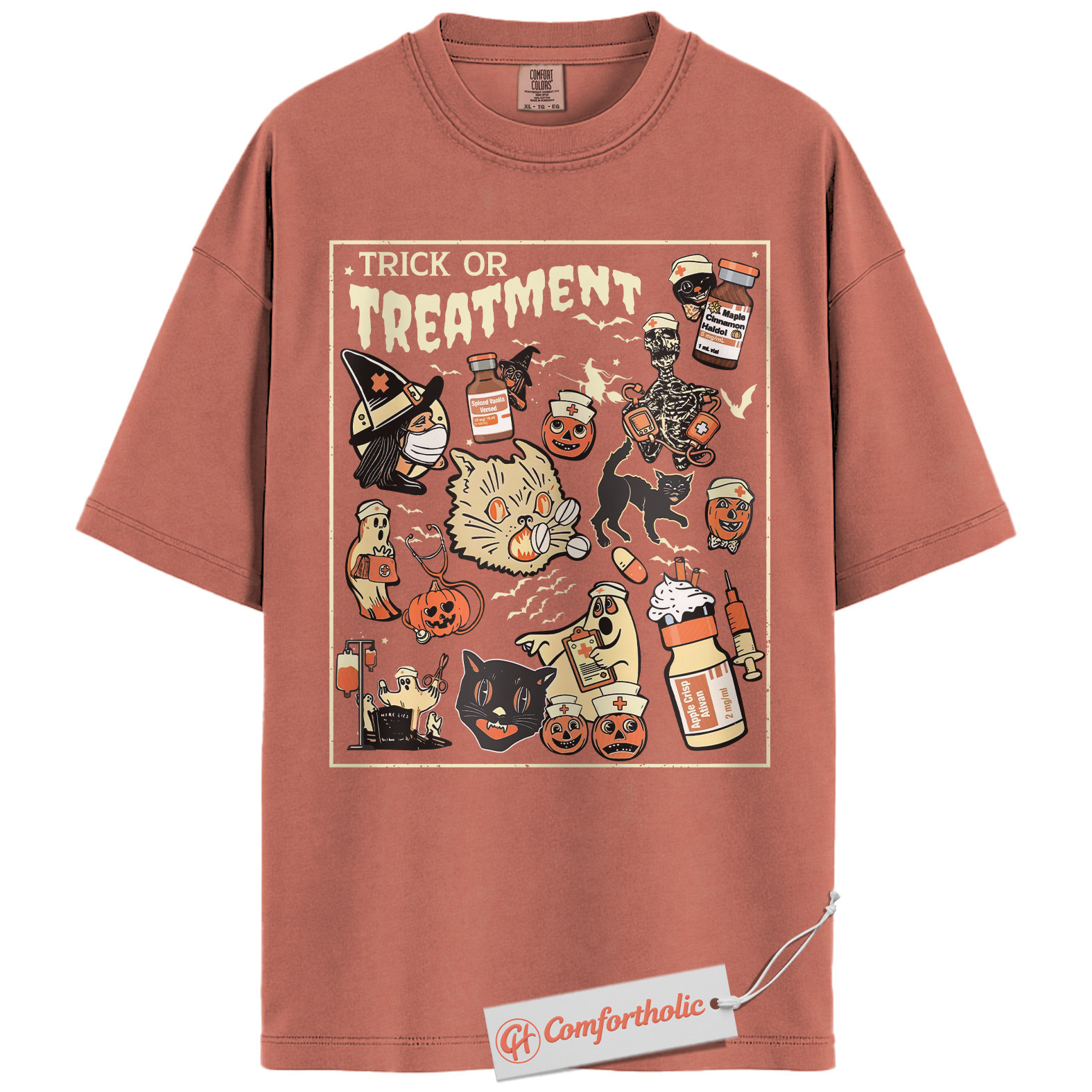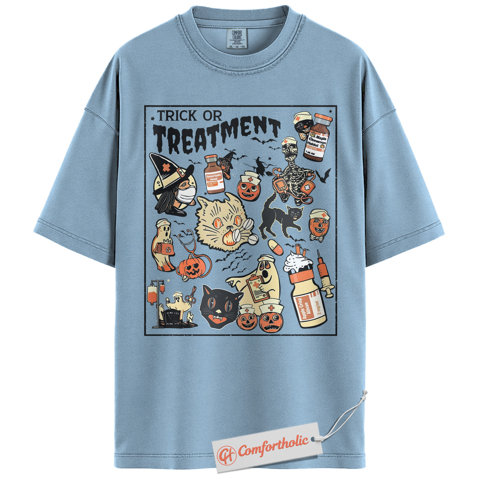Trick or Treatment Shirt, Funny Halloween Nurse T-Shirt, Spooky Medical Cat Graphic Tee, Gift for Veterinary Workers & Pet Lovers, Halloween Comfort Colors Shirt