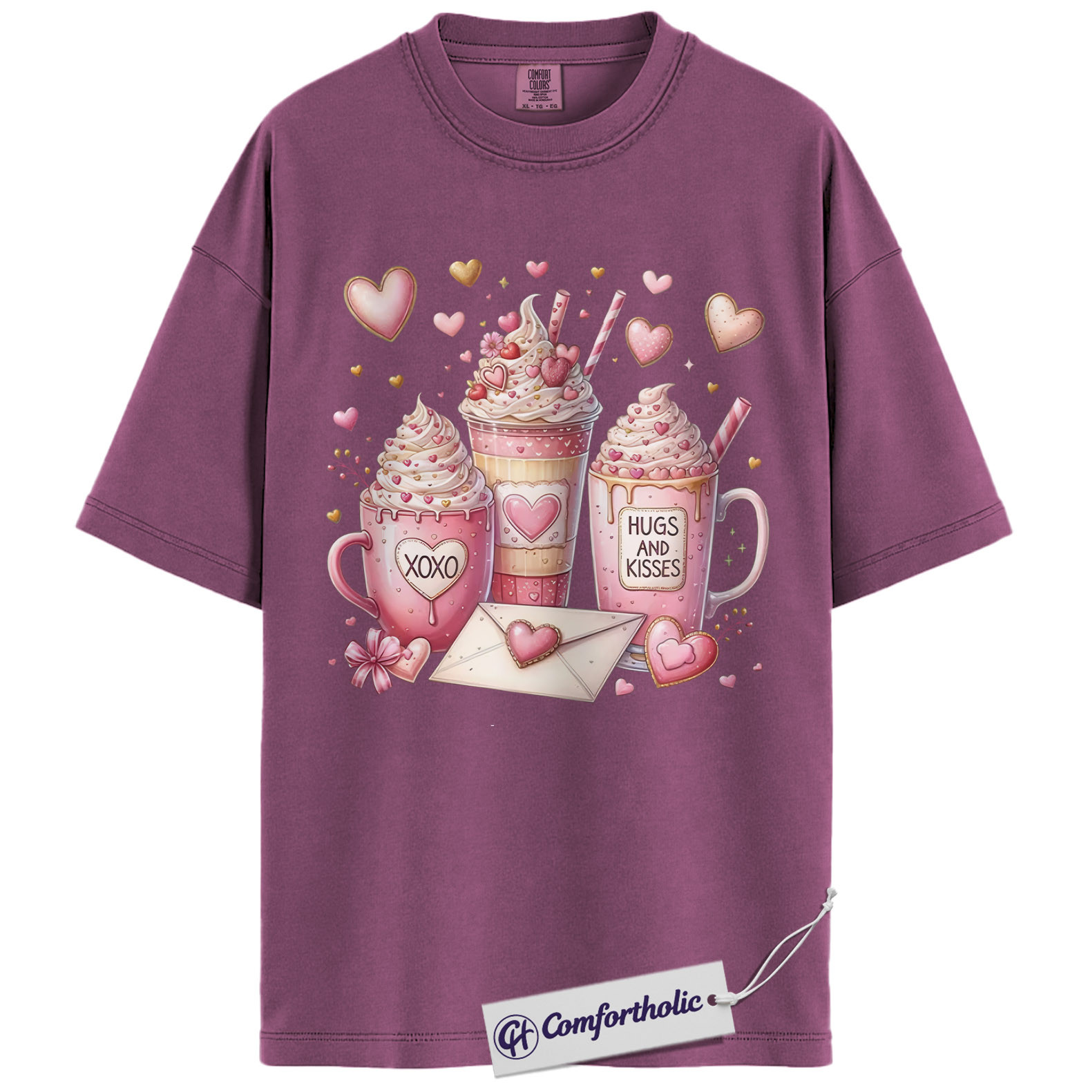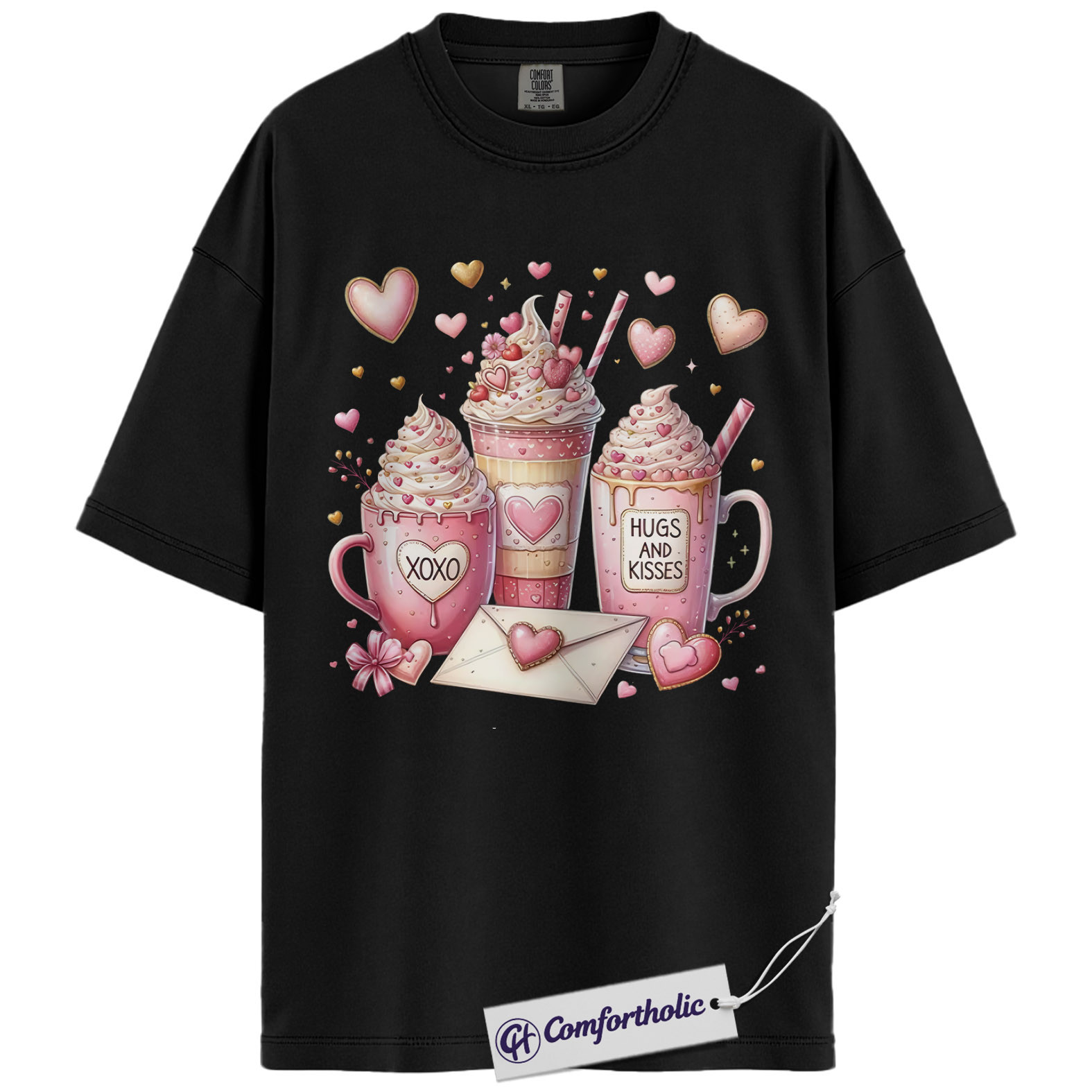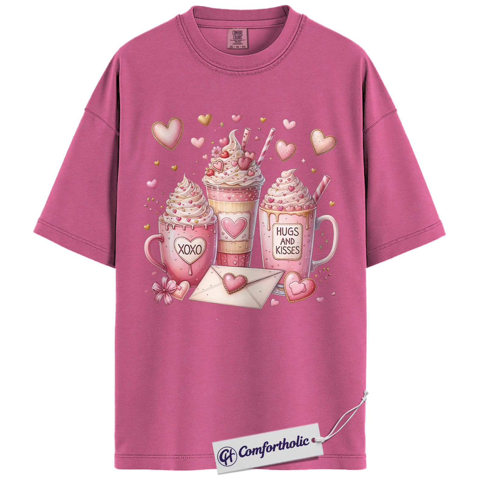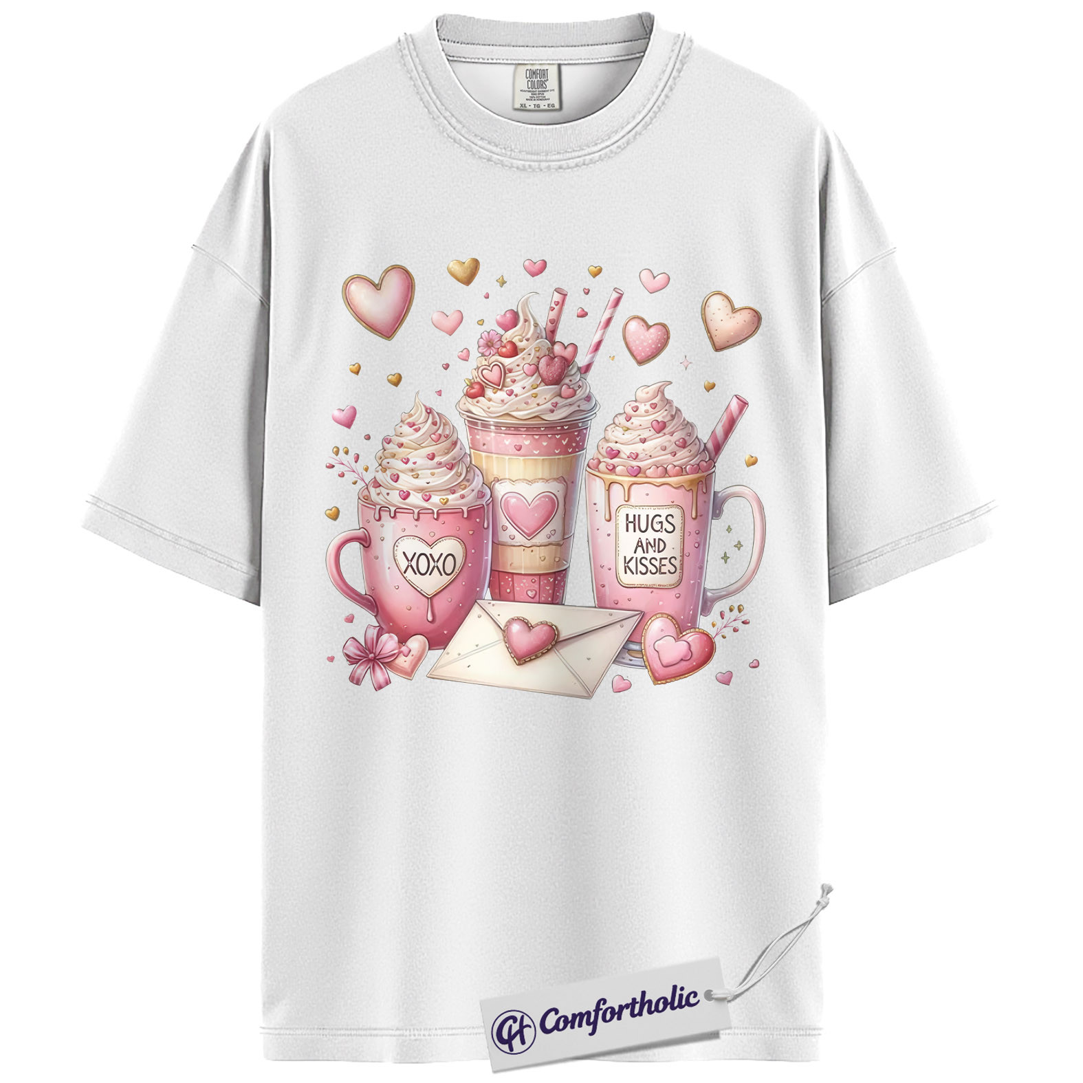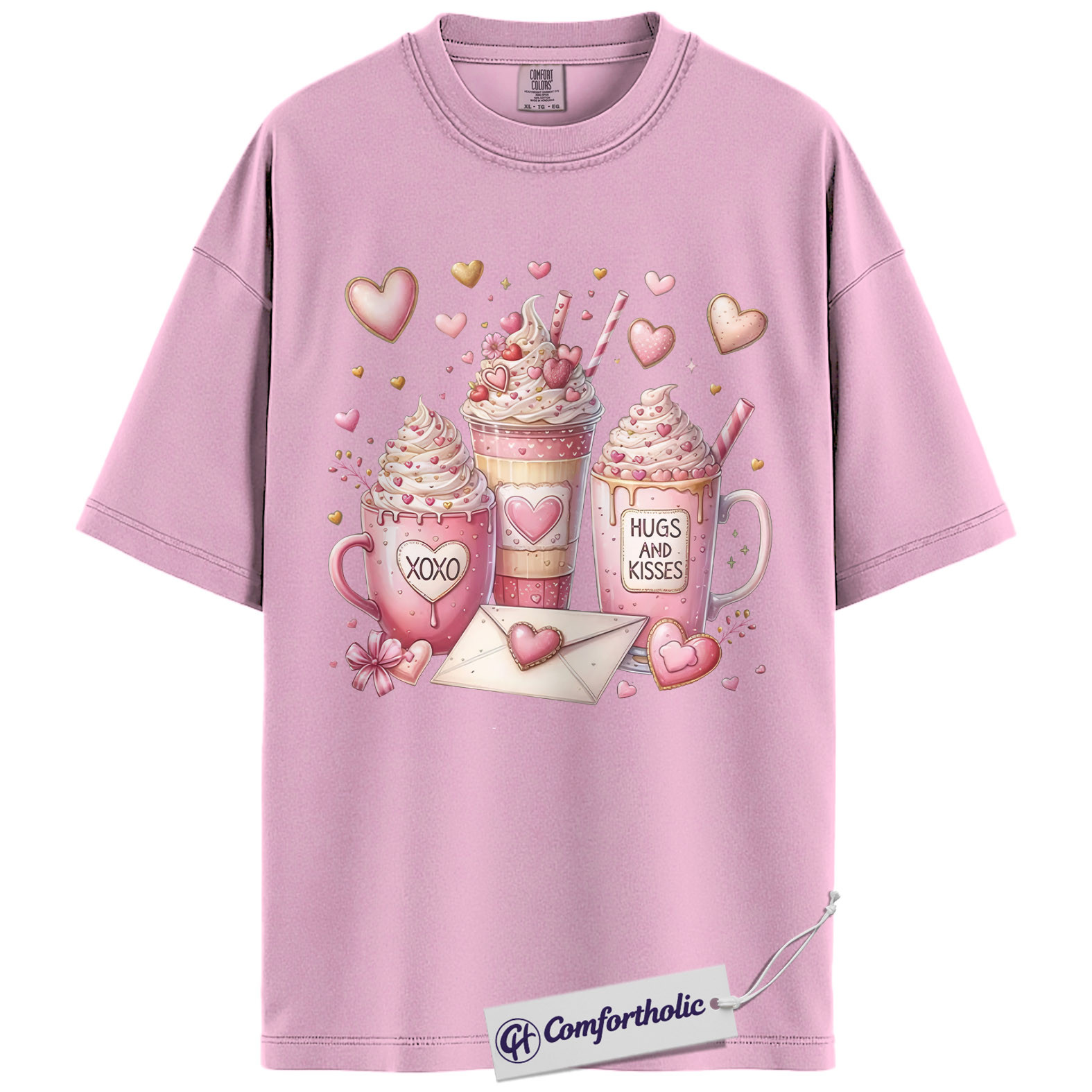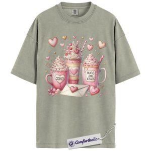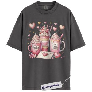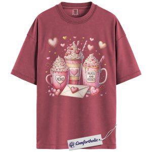 Valentine Coffee Shirt, Cute Pink Cocoa Graphic Tee, Hearts & Kisses Hot Chocolate T-Shirt, Valentine’s Day Gift for Women, Comfort Colors Shirt