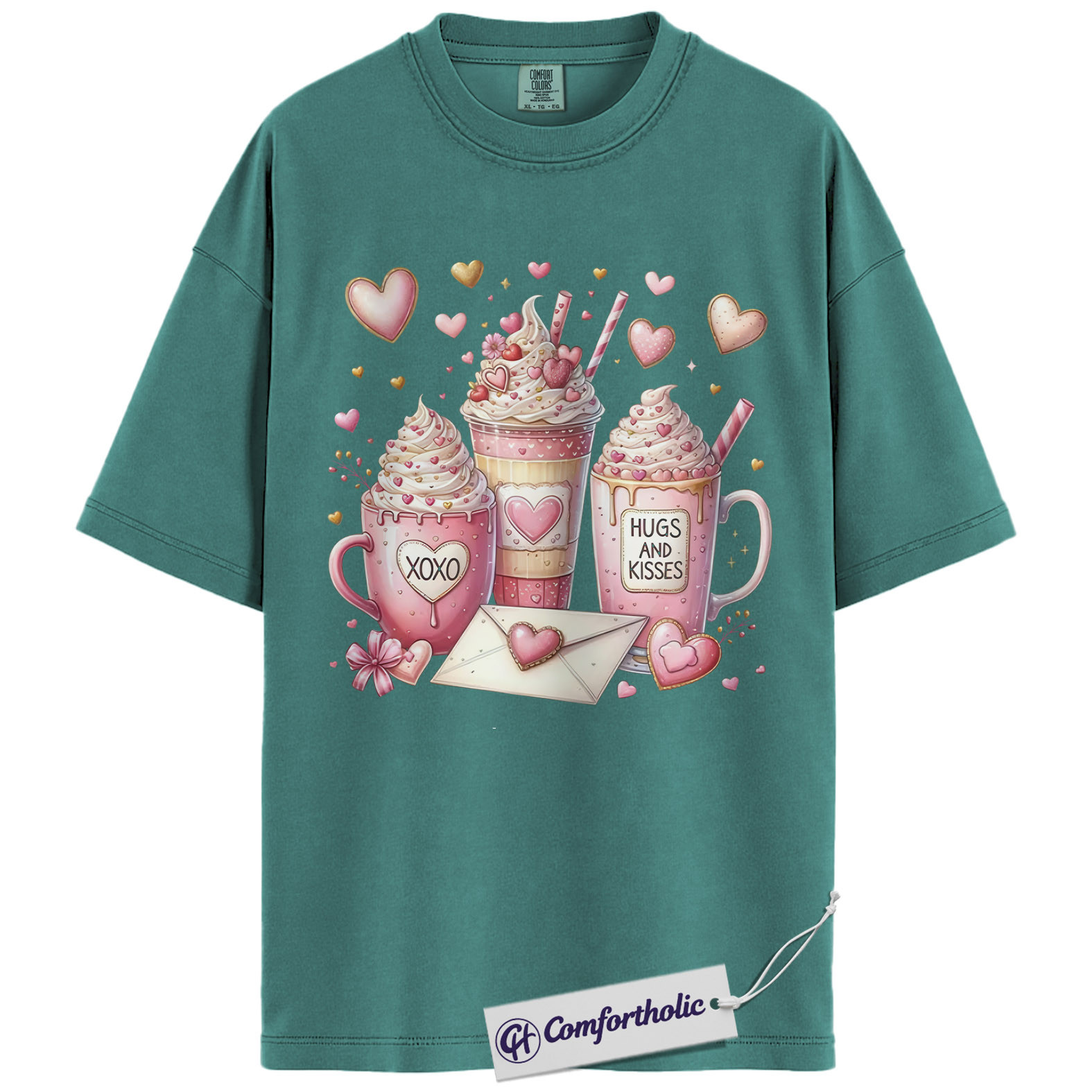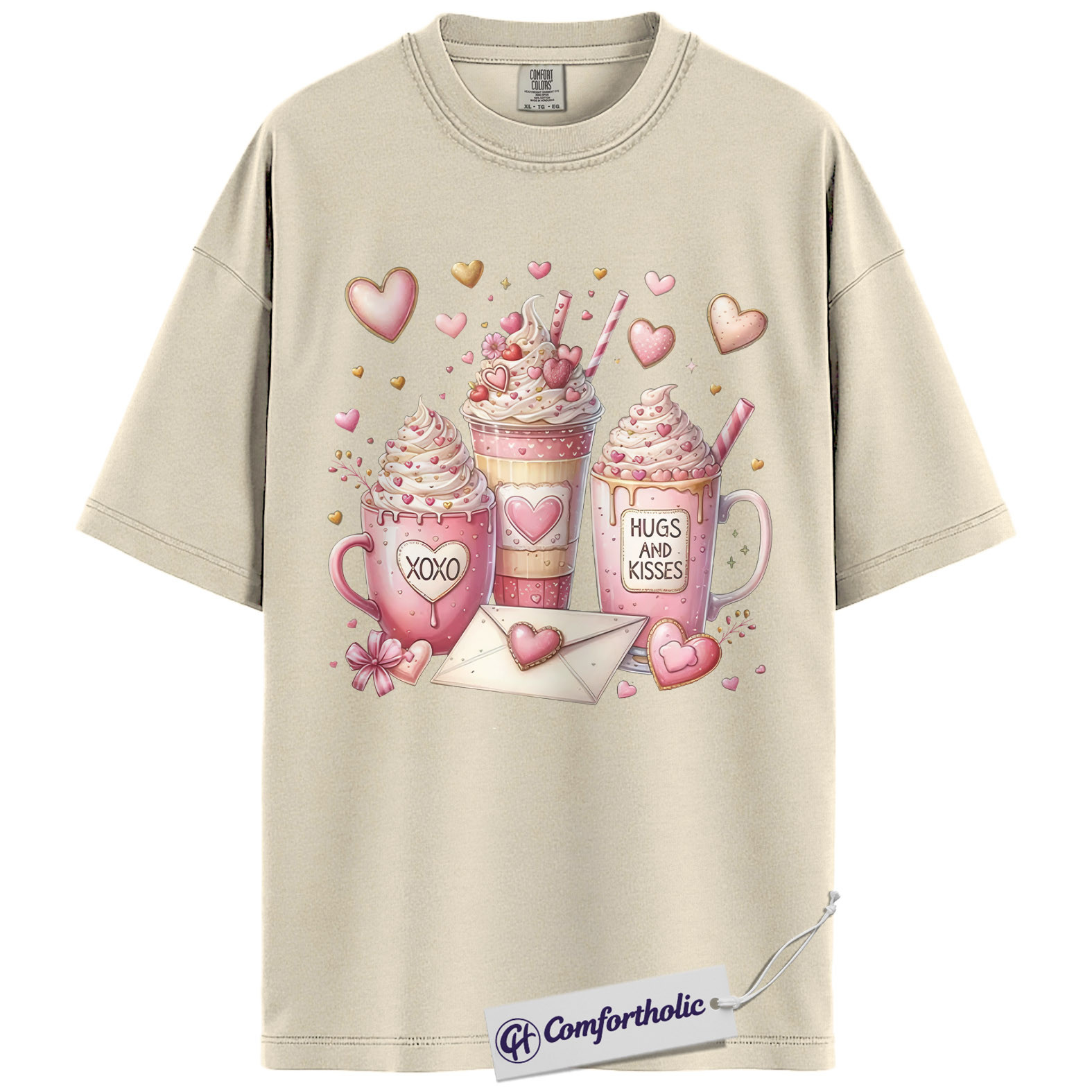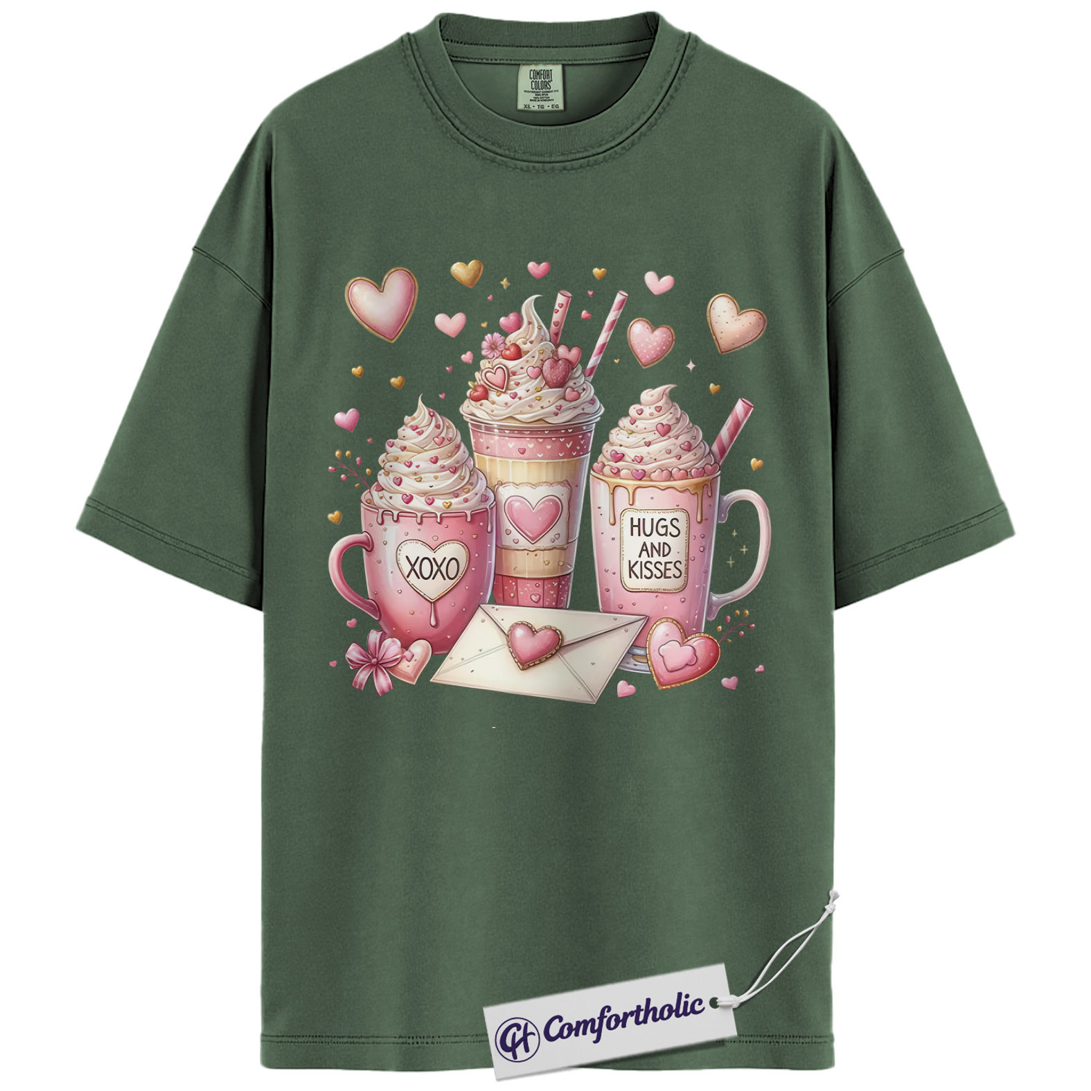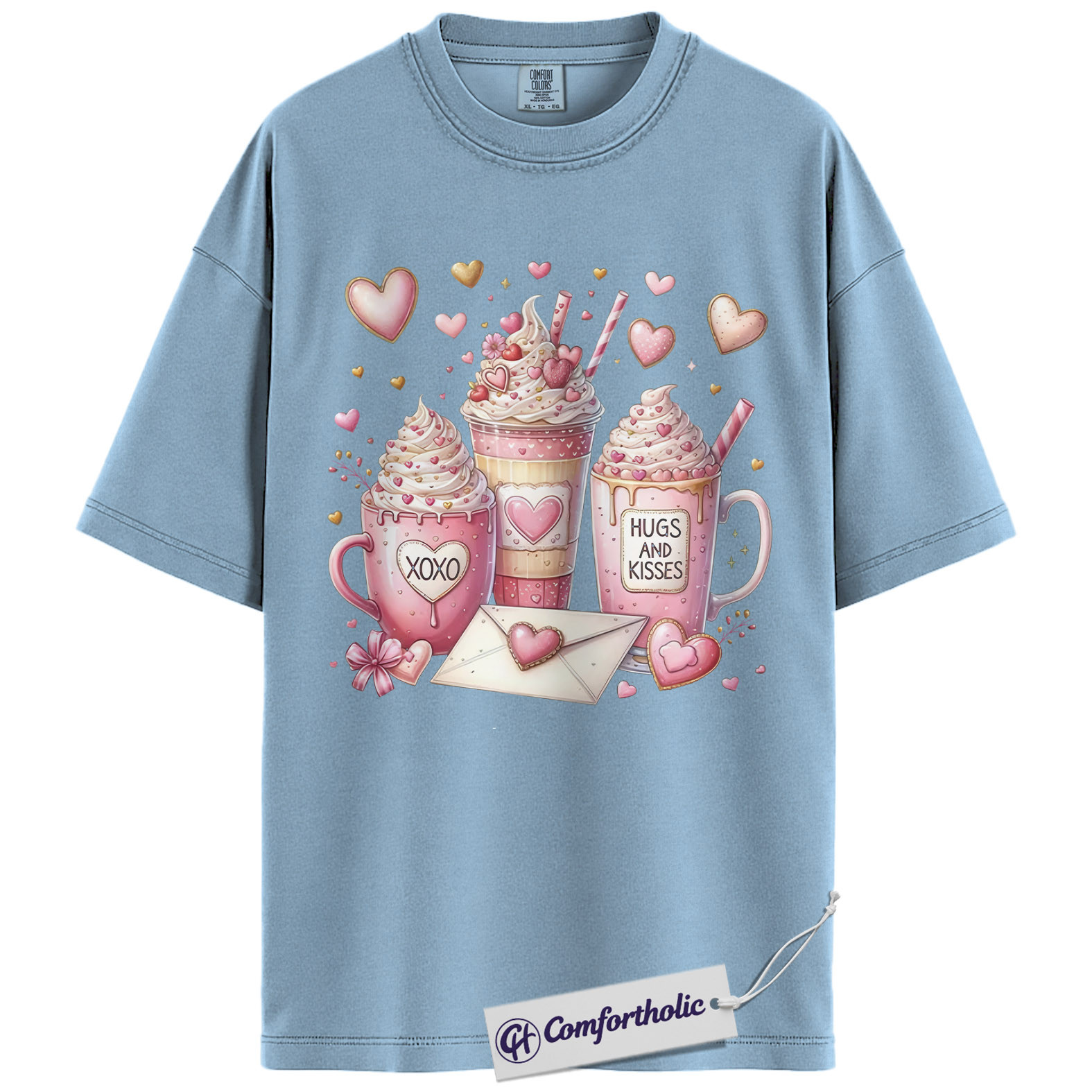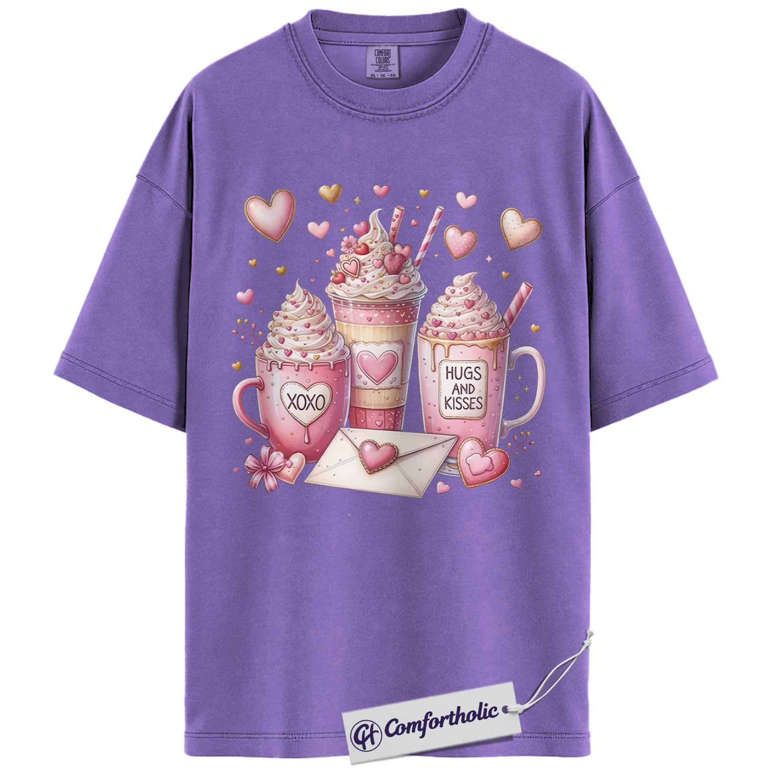 Valentine Coffee Shirt, Cute Pink Cocoa Graphic Tee, Hearts & Kisses Hot Chocolate T-Shirt, Valentine’s Day Gift for Women, Comfort Colors Shirt