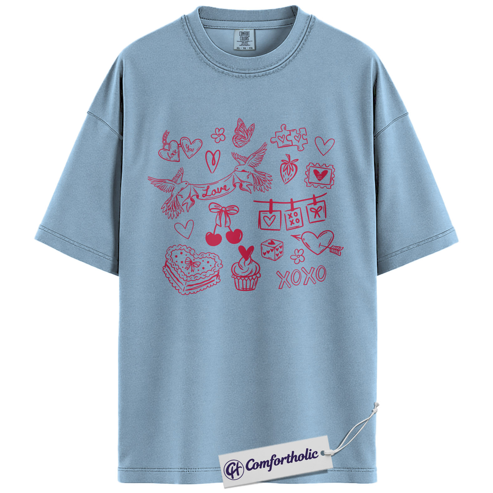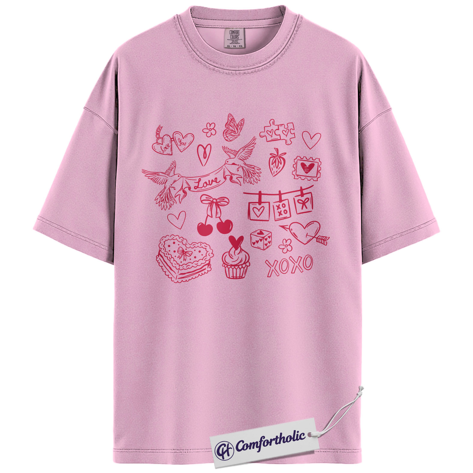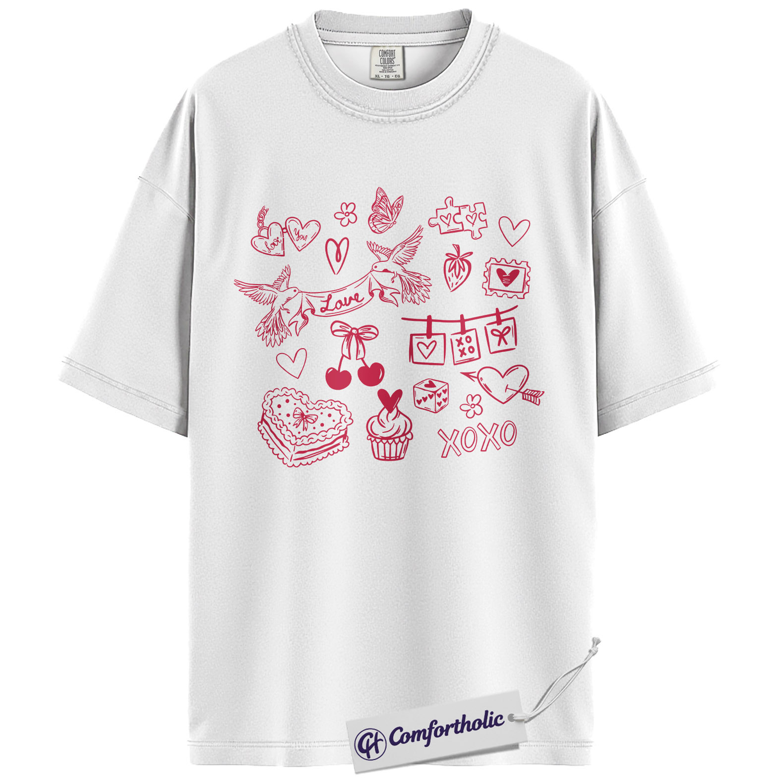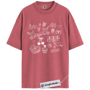 Valentine Doodle Shirt, Pink Love Icons Graphic Tee, XOXO Heart Collage T-Shirt, Cute Valentine Gift for Her, Comfort Colors Shirt