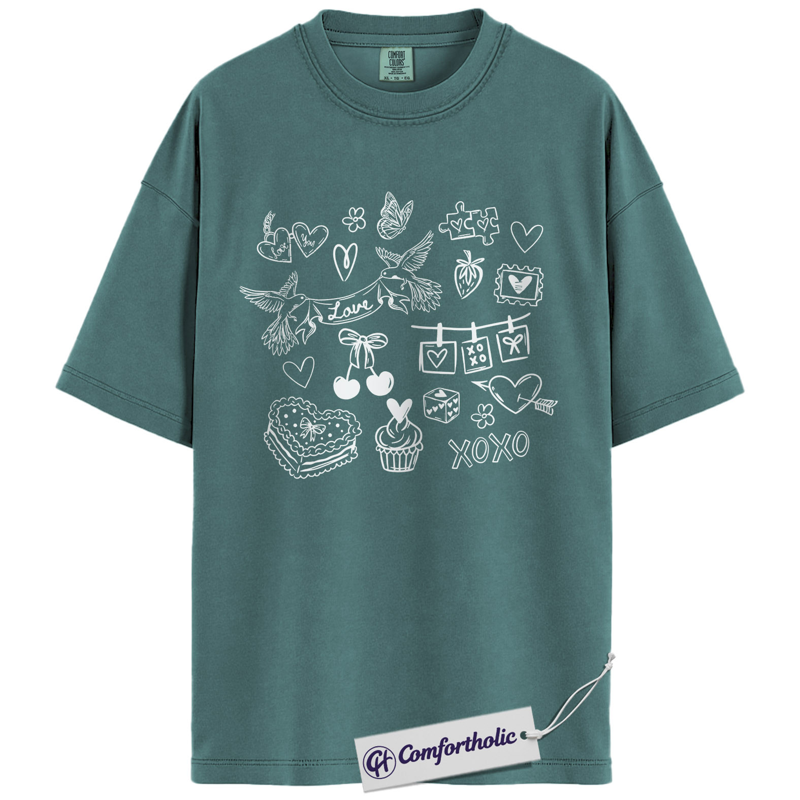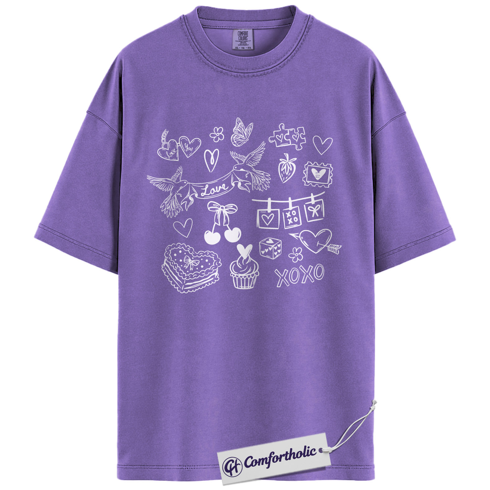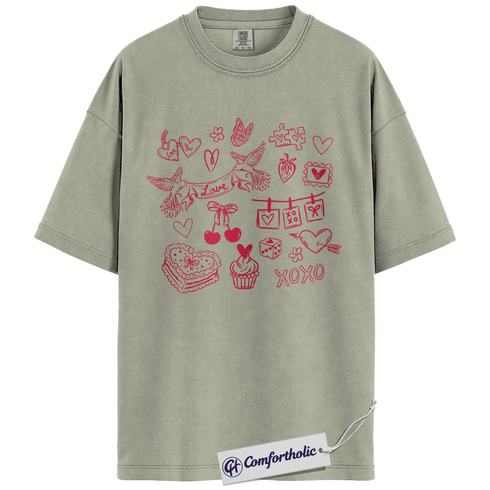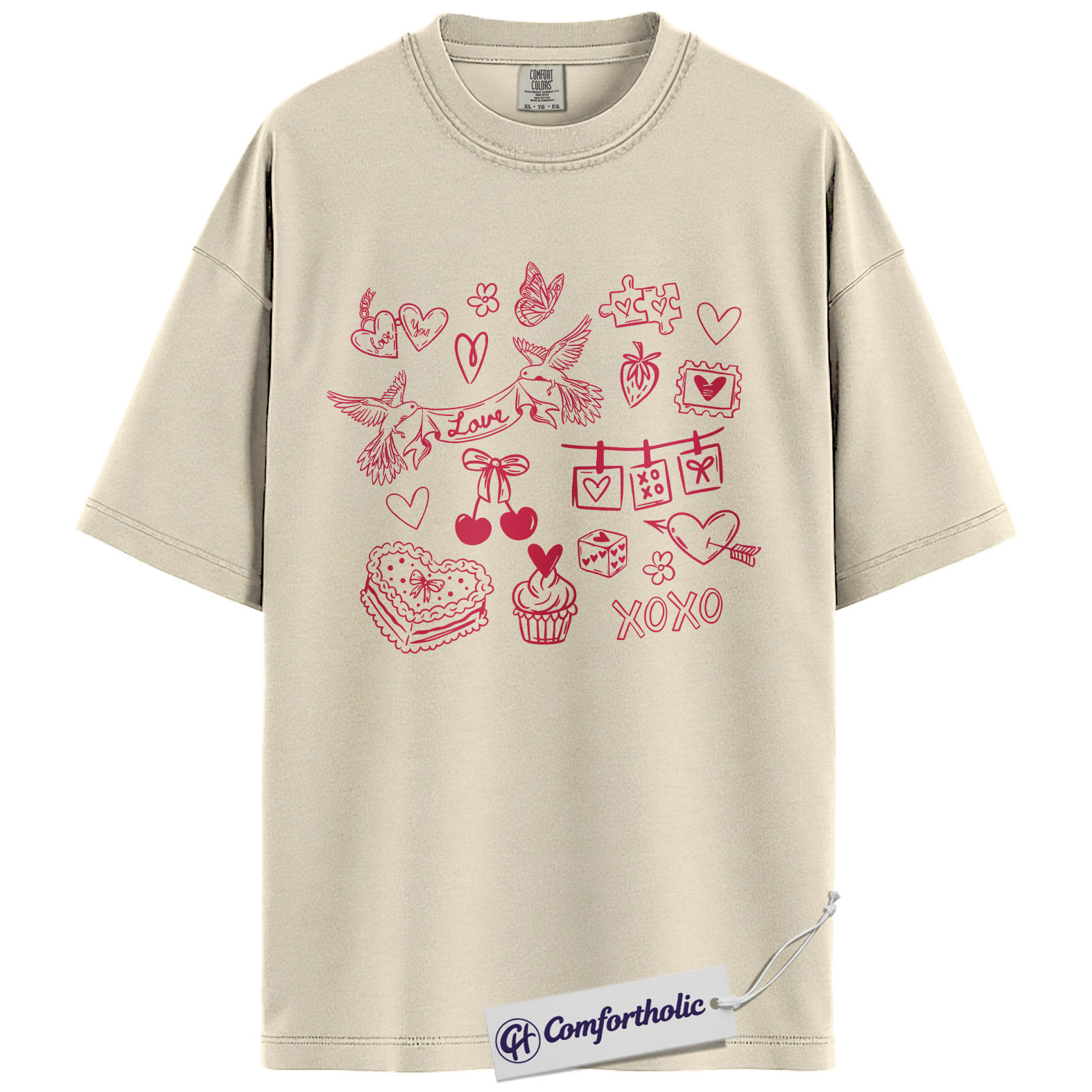 Valentine Doodle Shirt, Pink Love Icons Graphic Tee, XOXO Heart Collage T-Shirt, Cute Valentine Gift for Her, Comfort Colors Shirt