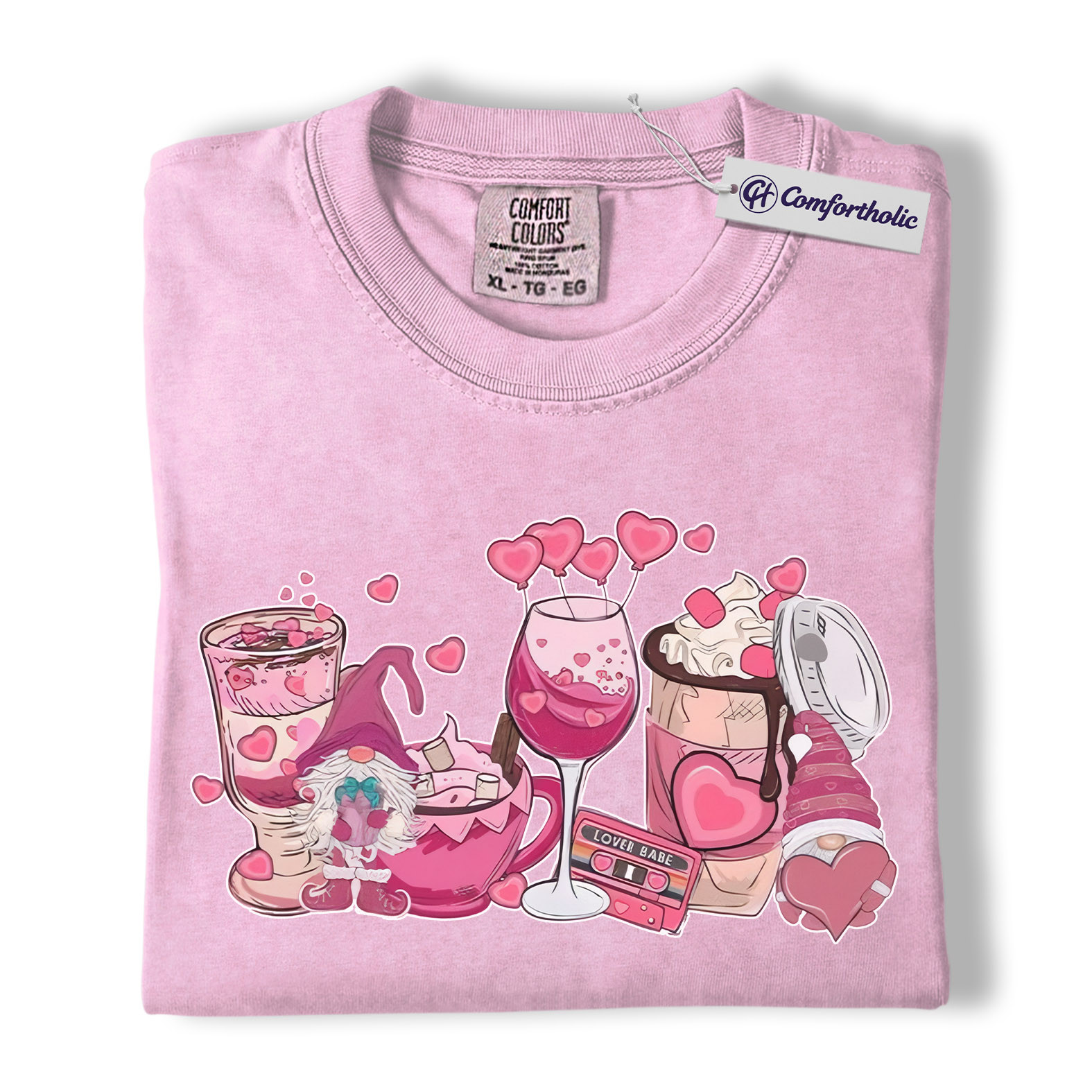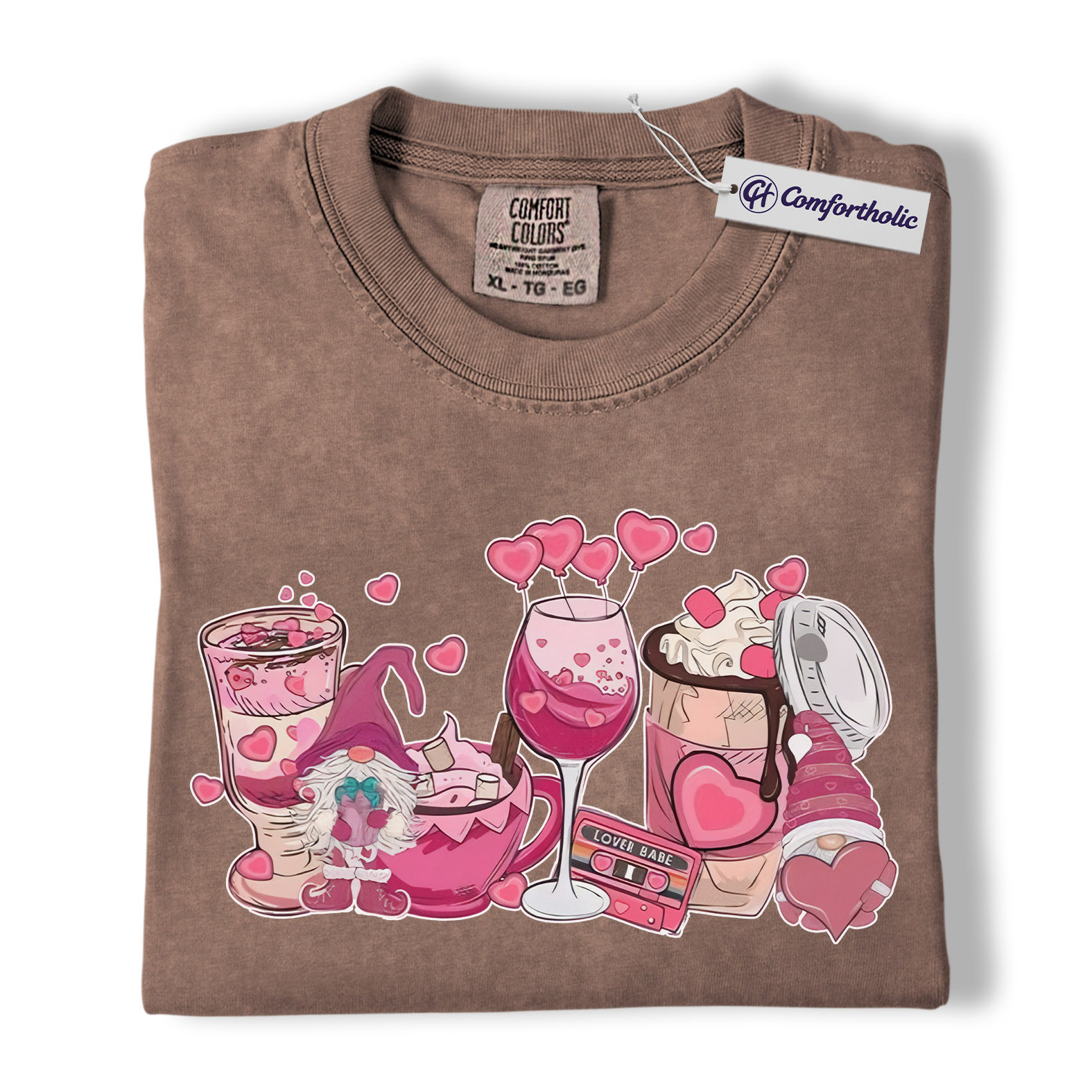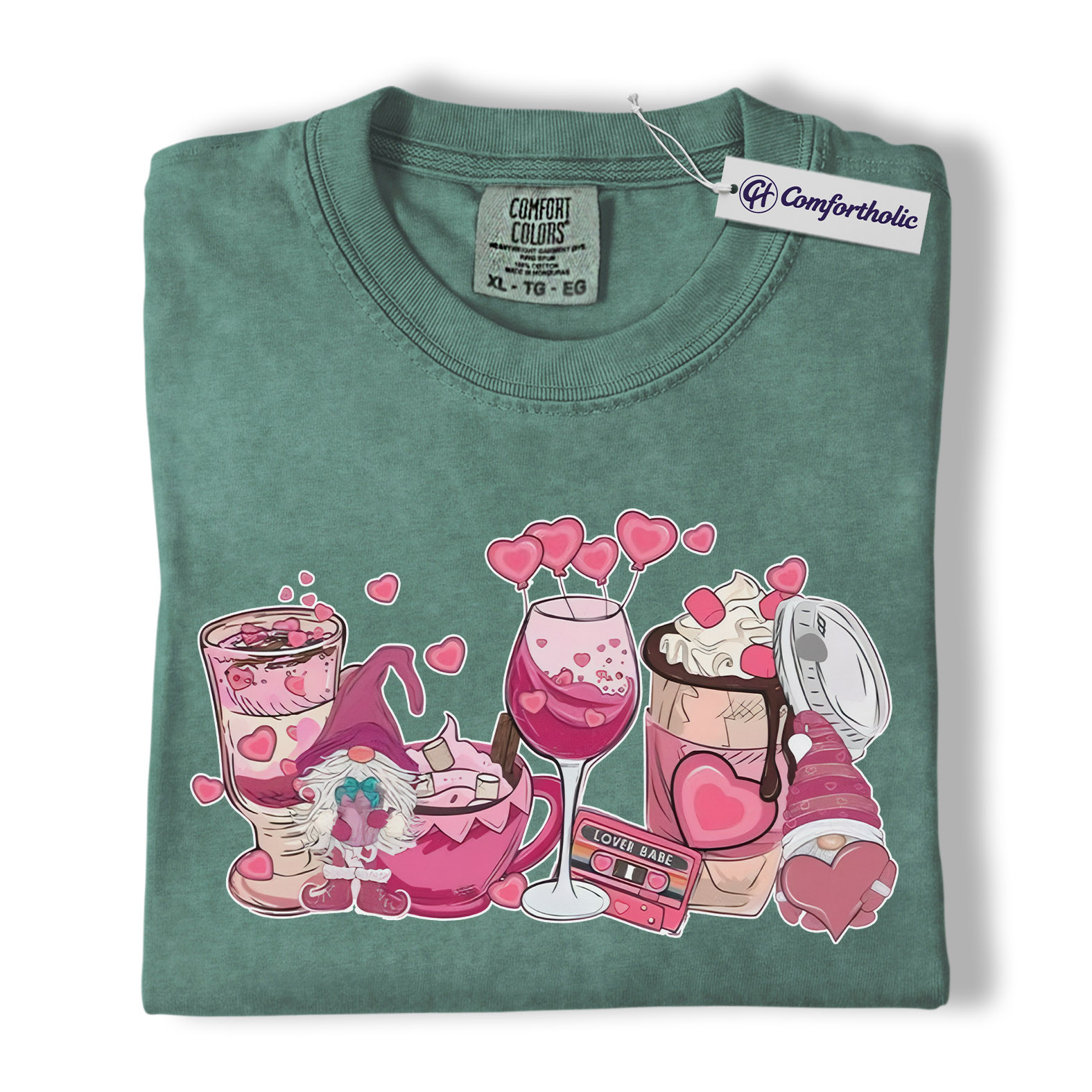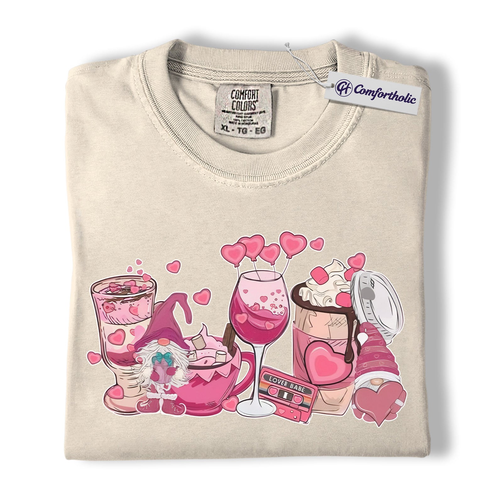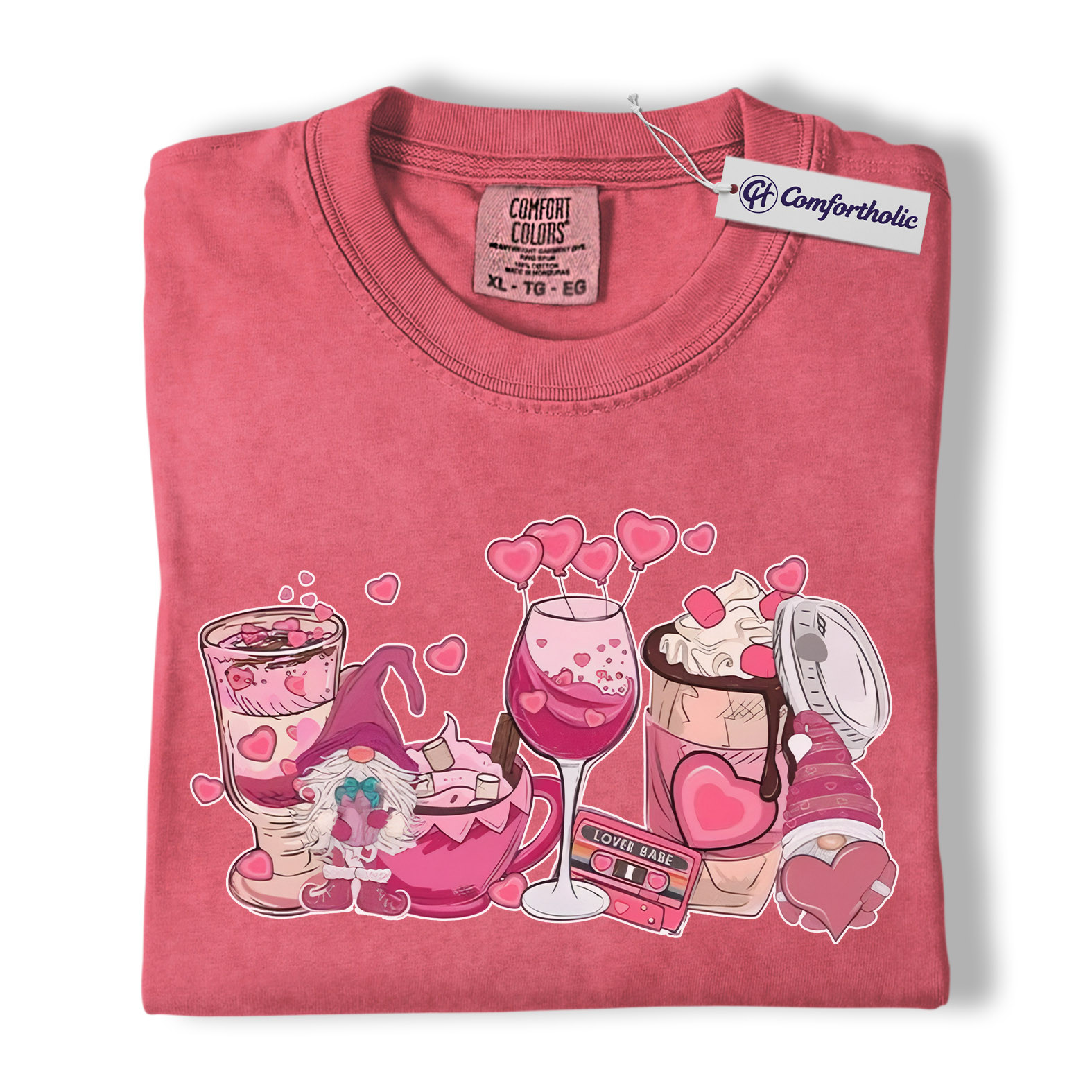 Valentine Gnome Shirt, Cute Pink Gnome Drink Graphic Tee, Wine Lover Valentine T-Shirt, Valentine’s Day Gift for Women, Comfort Colors Shirt