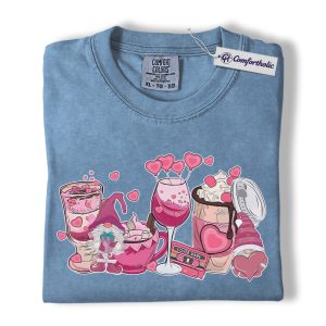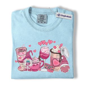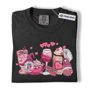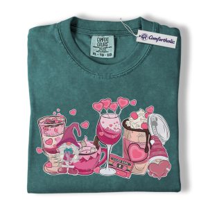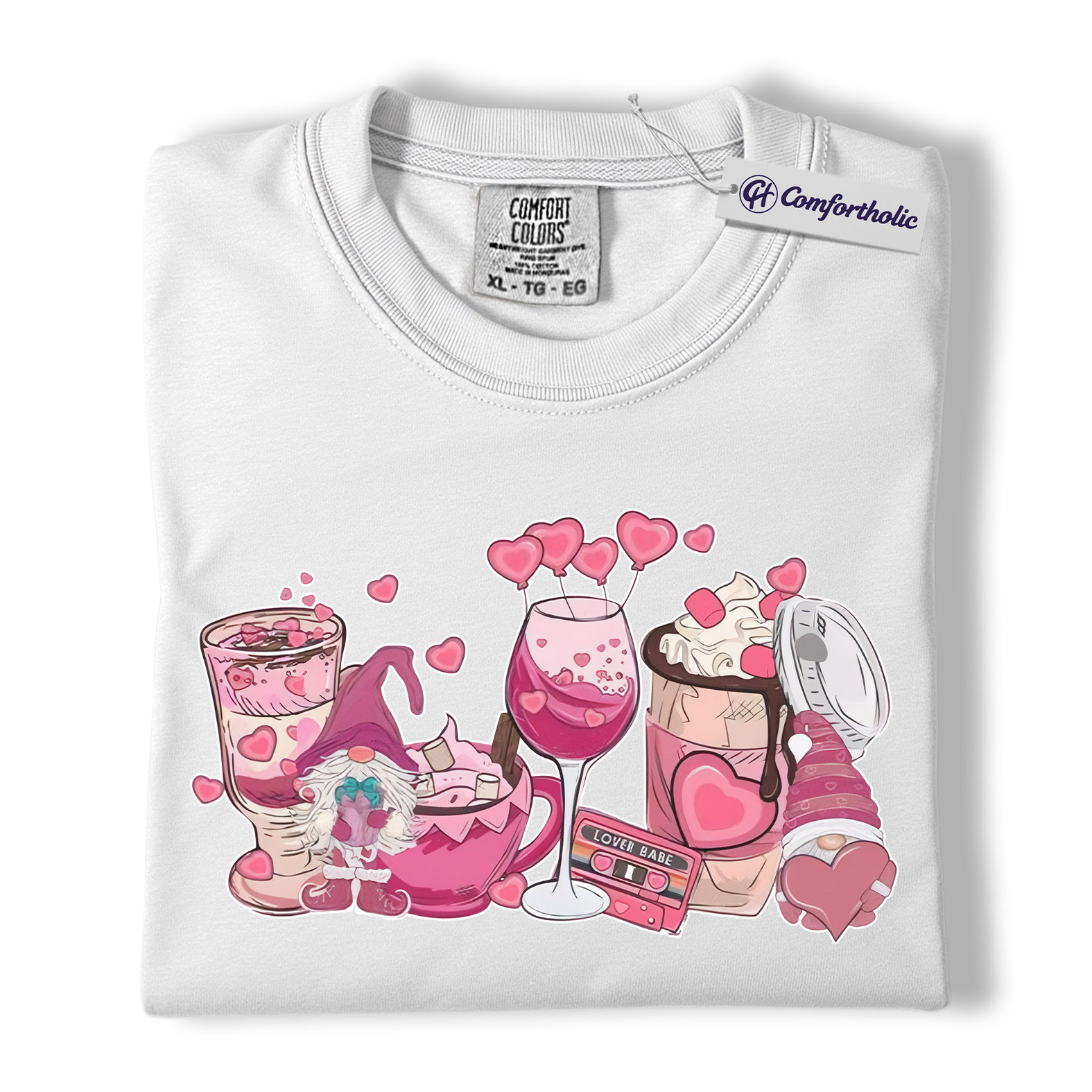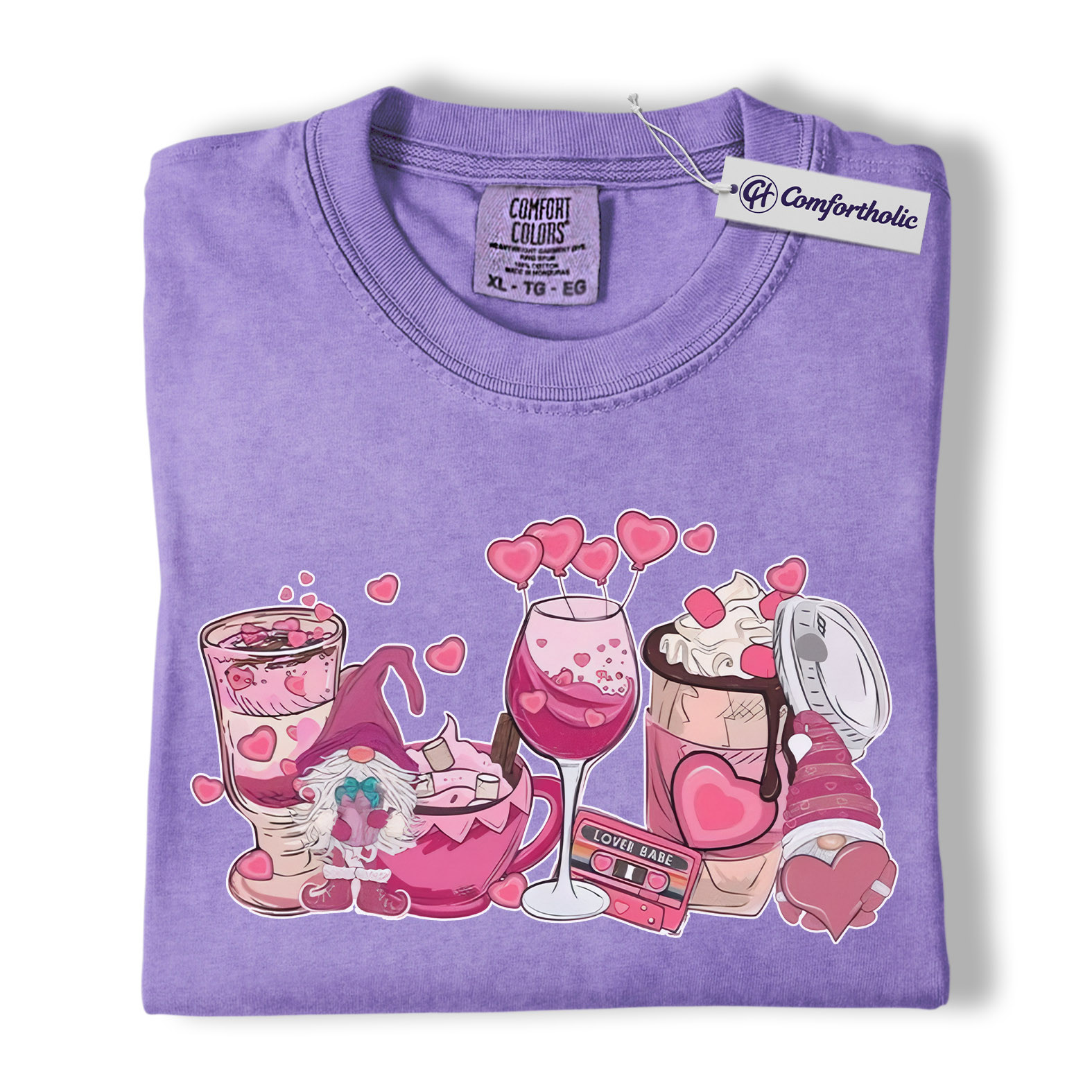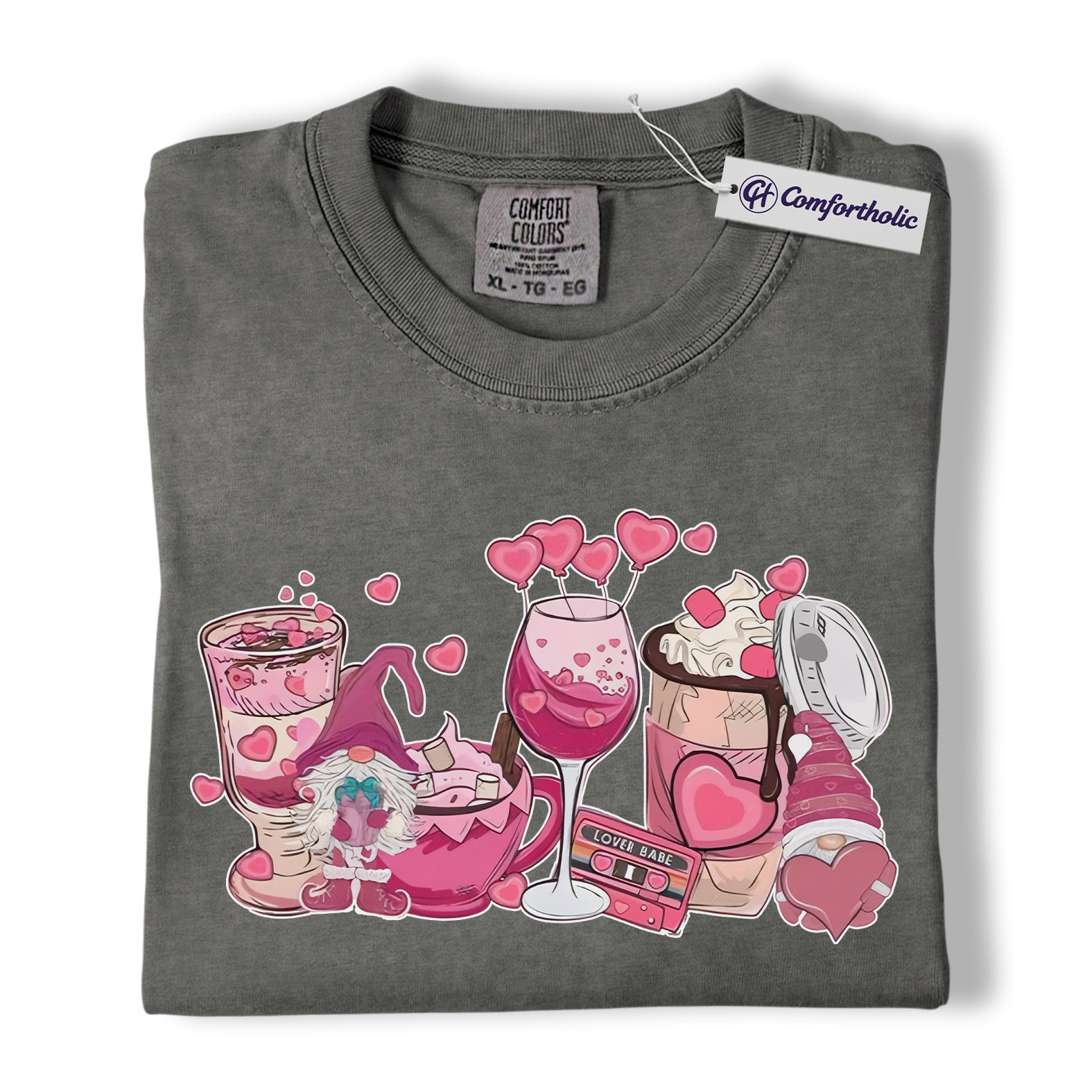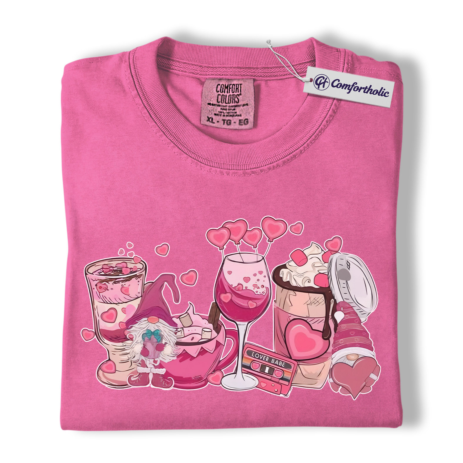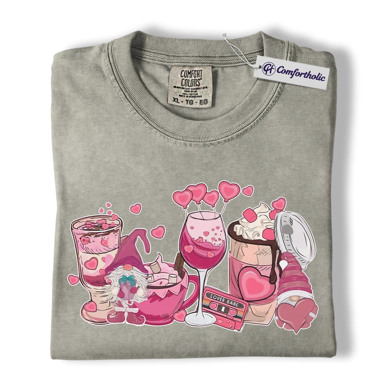 Valentine Gnome Shirt, Cute Pink Gnome Drink Graphic Tee, Wine Lover Valentine T-Shirt, Valentine’s Day Gift for Women, Comfort Colors Shirt