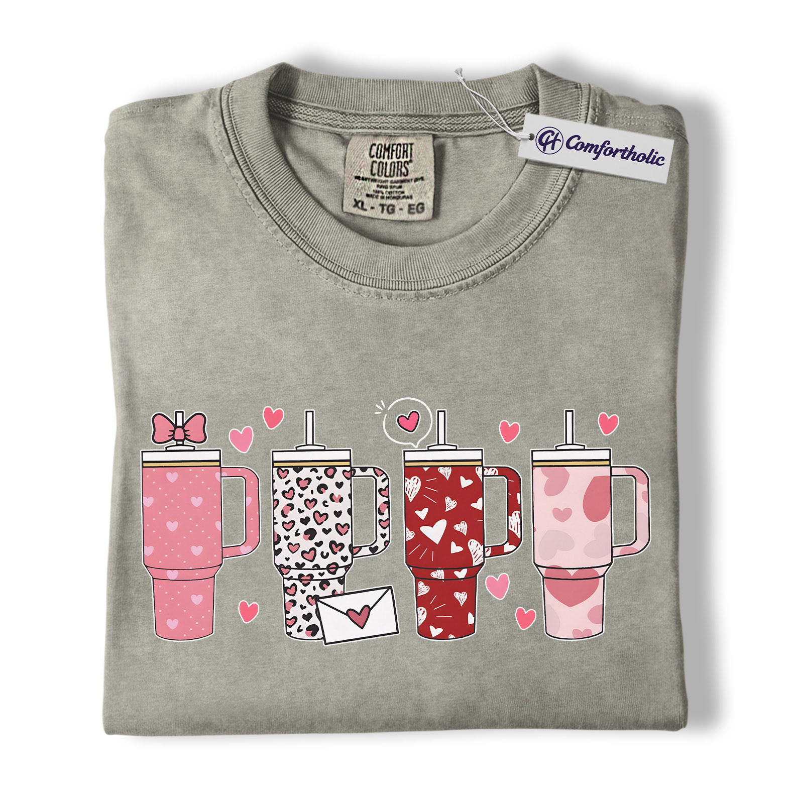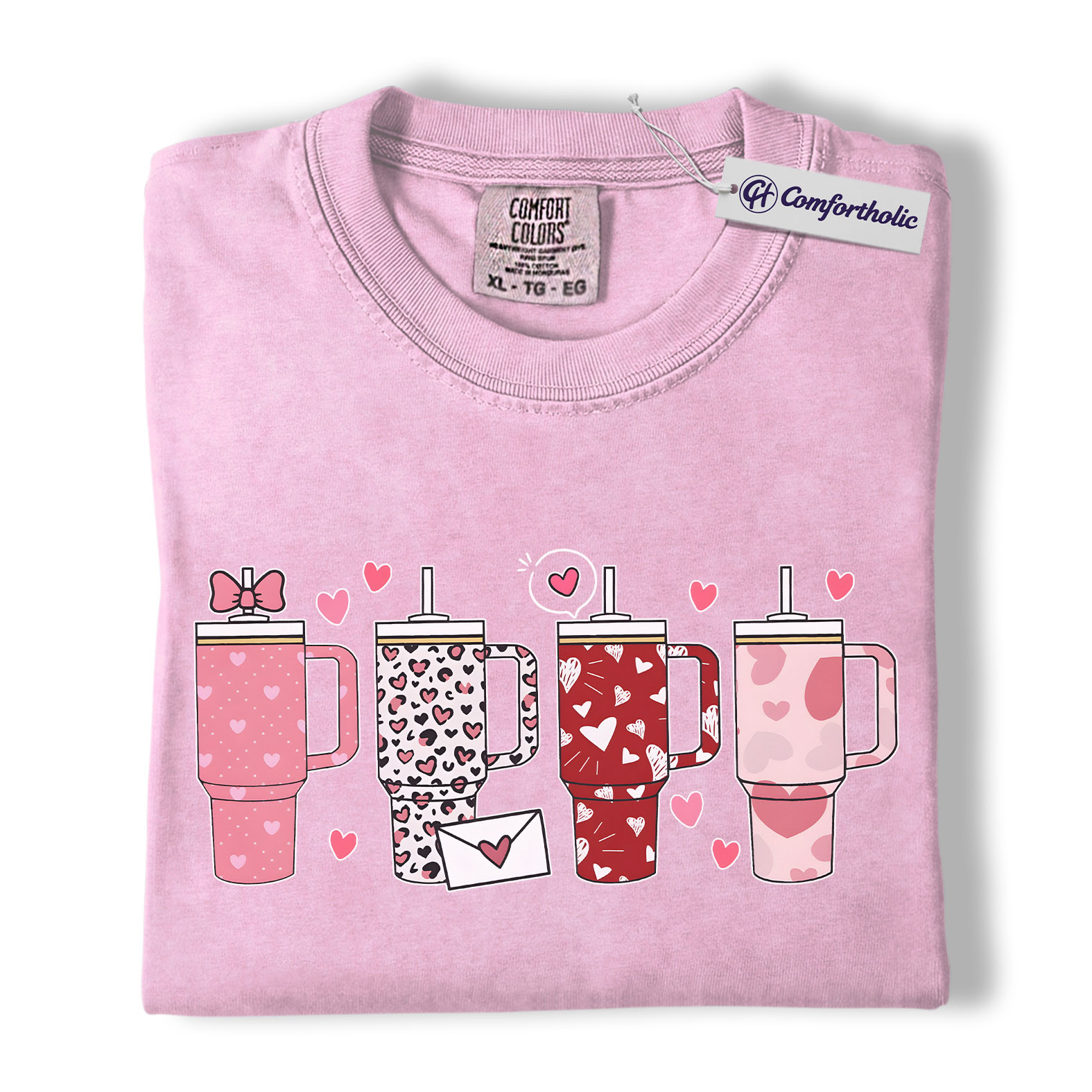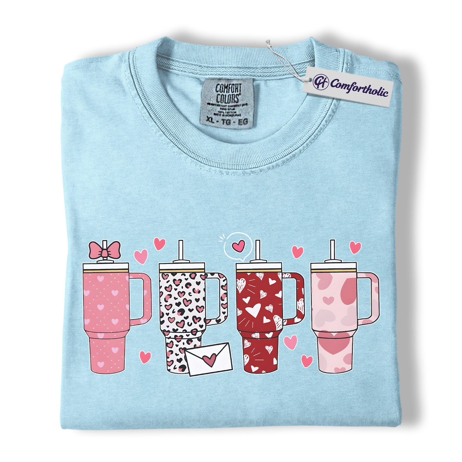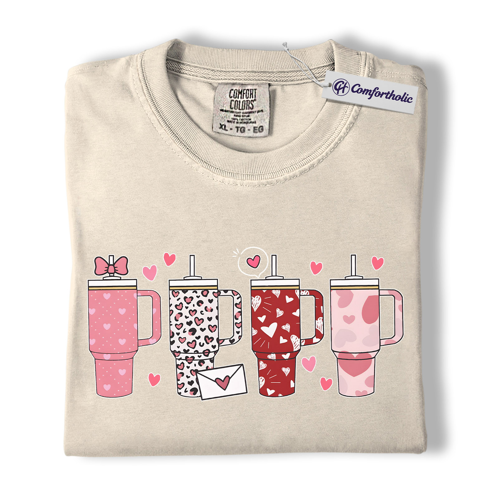 Valentine Tumbler Lover Shirt, Cute Pink Heart Stanley Cup Graphic Tee, Aesthetic Drink Print T-Shirt, Sweet Valentine Gift for Women, Comfort Colors Shirt
