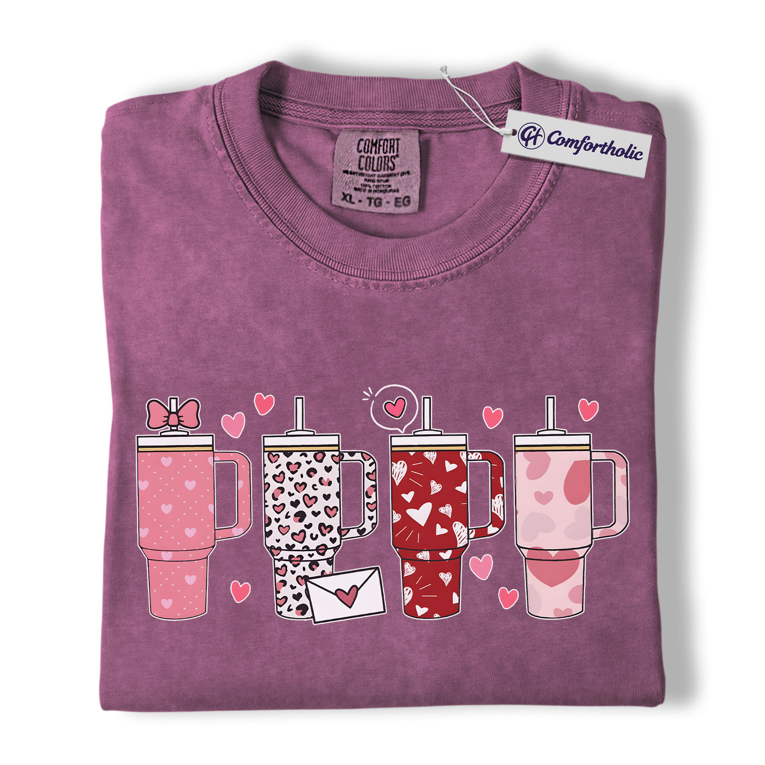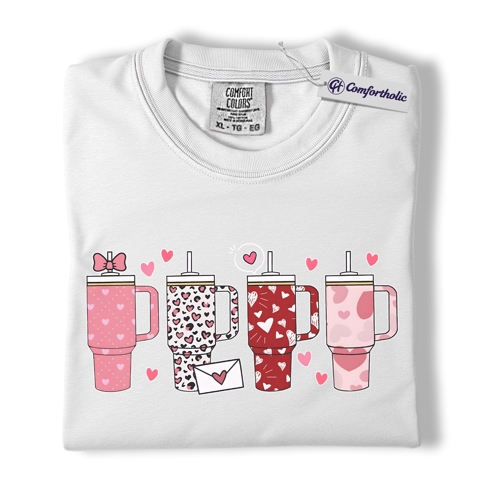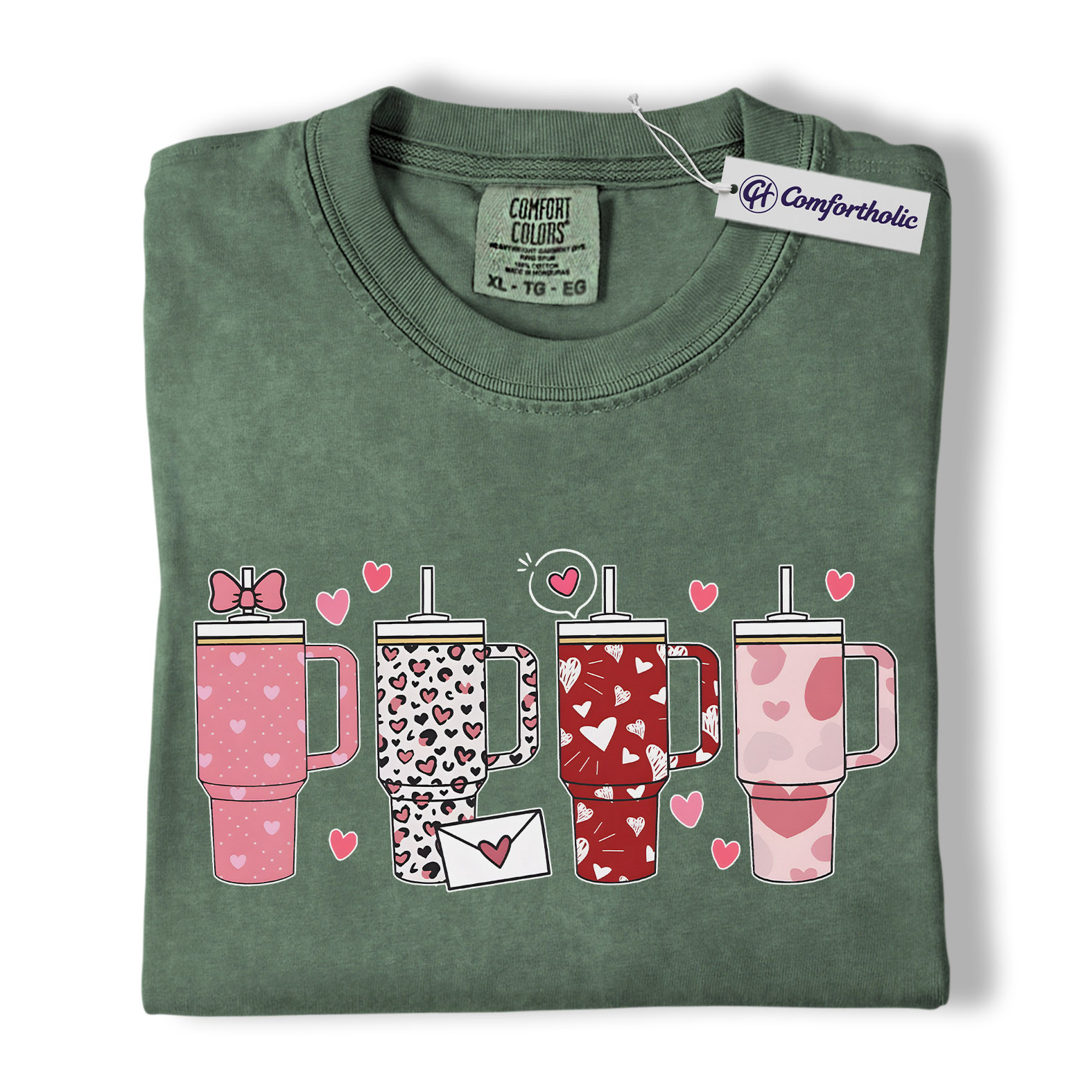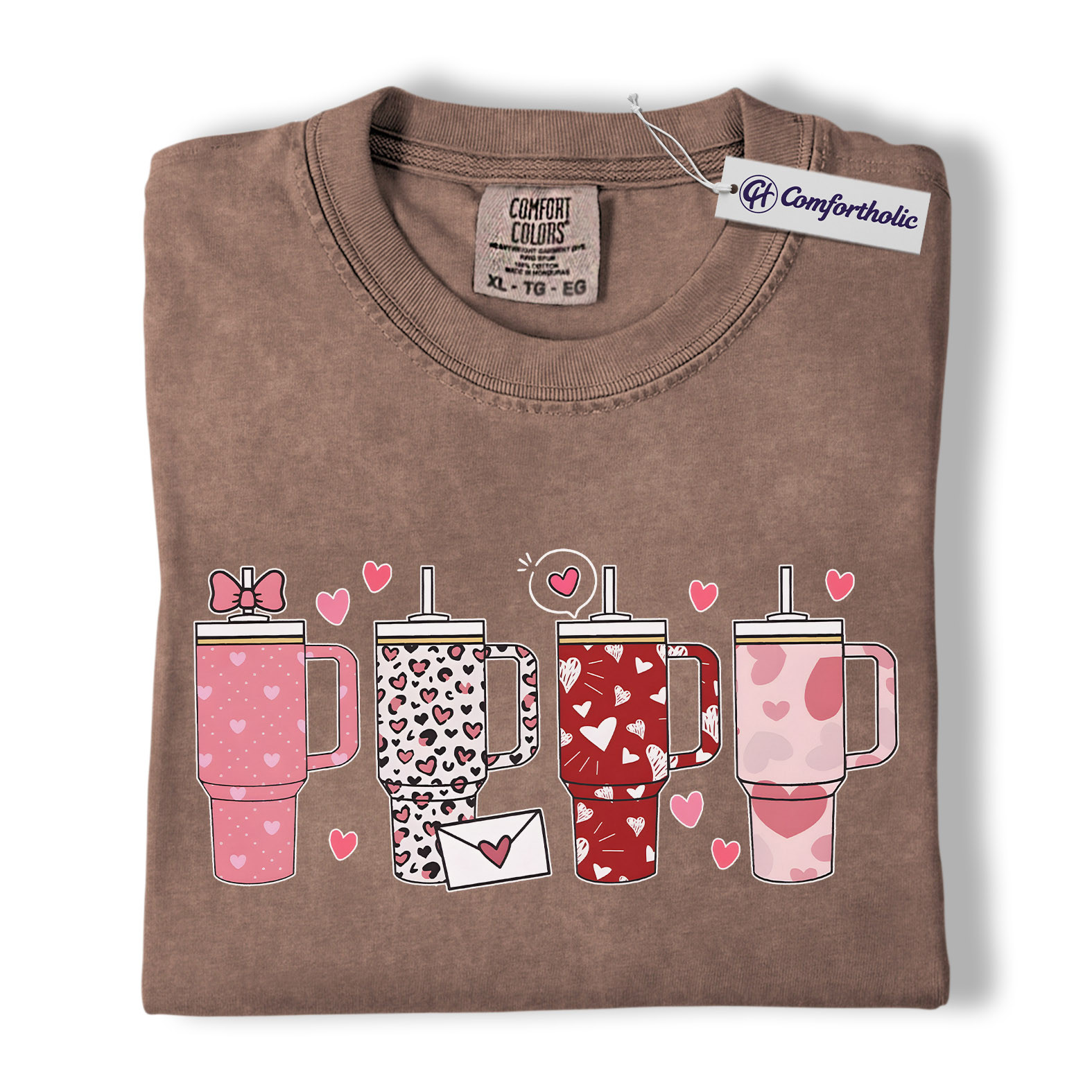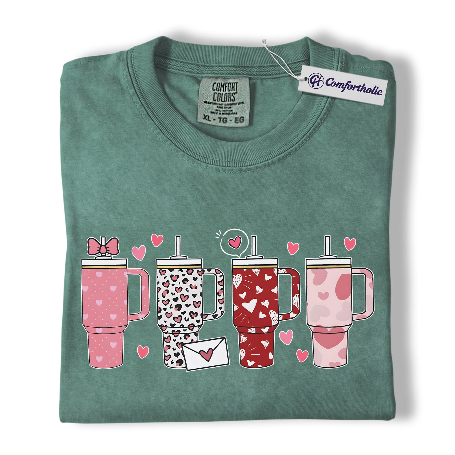 Valentine Tumbler Lover Shirt, Cute Pink Heart Stanley Cup Graphic Tee, Aesthetic Drink Print T-Shirt, Sweet Valentine Gift for Women, Comfort Colors Shirt