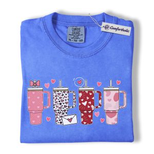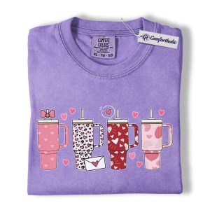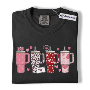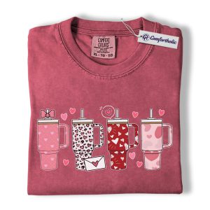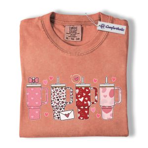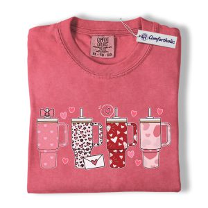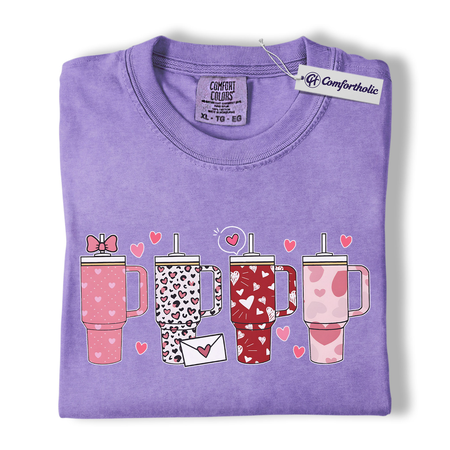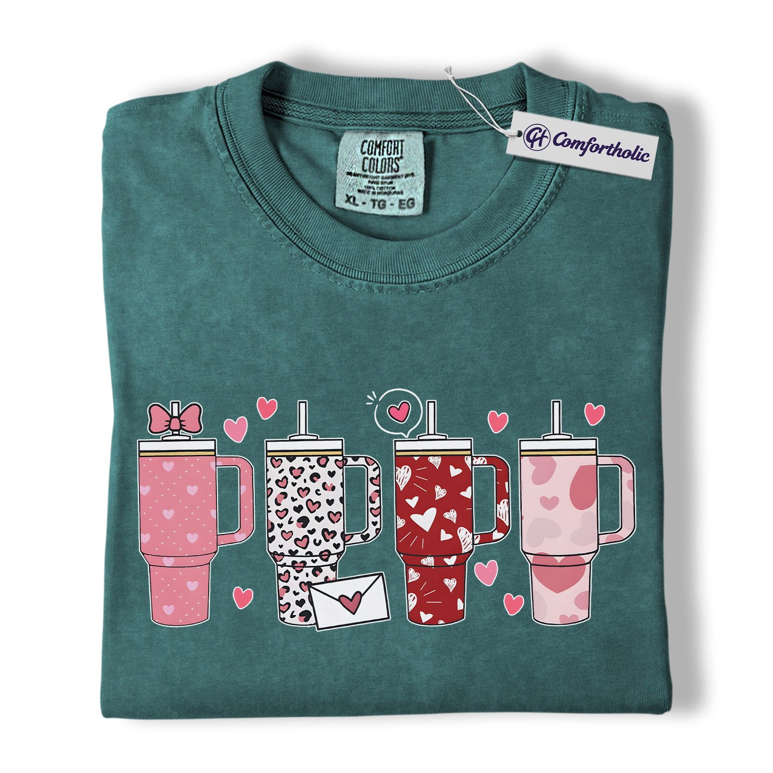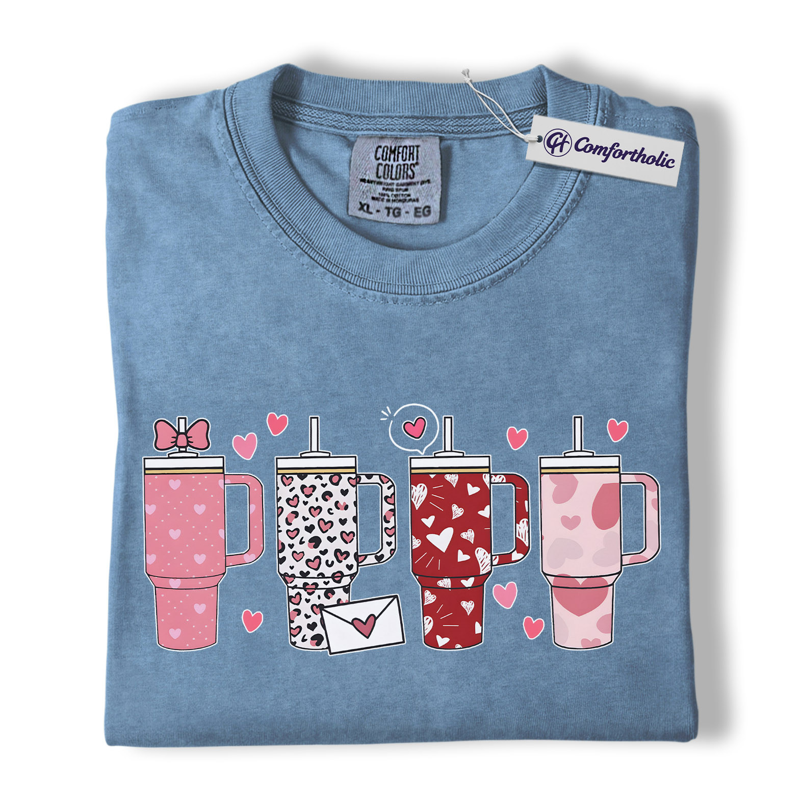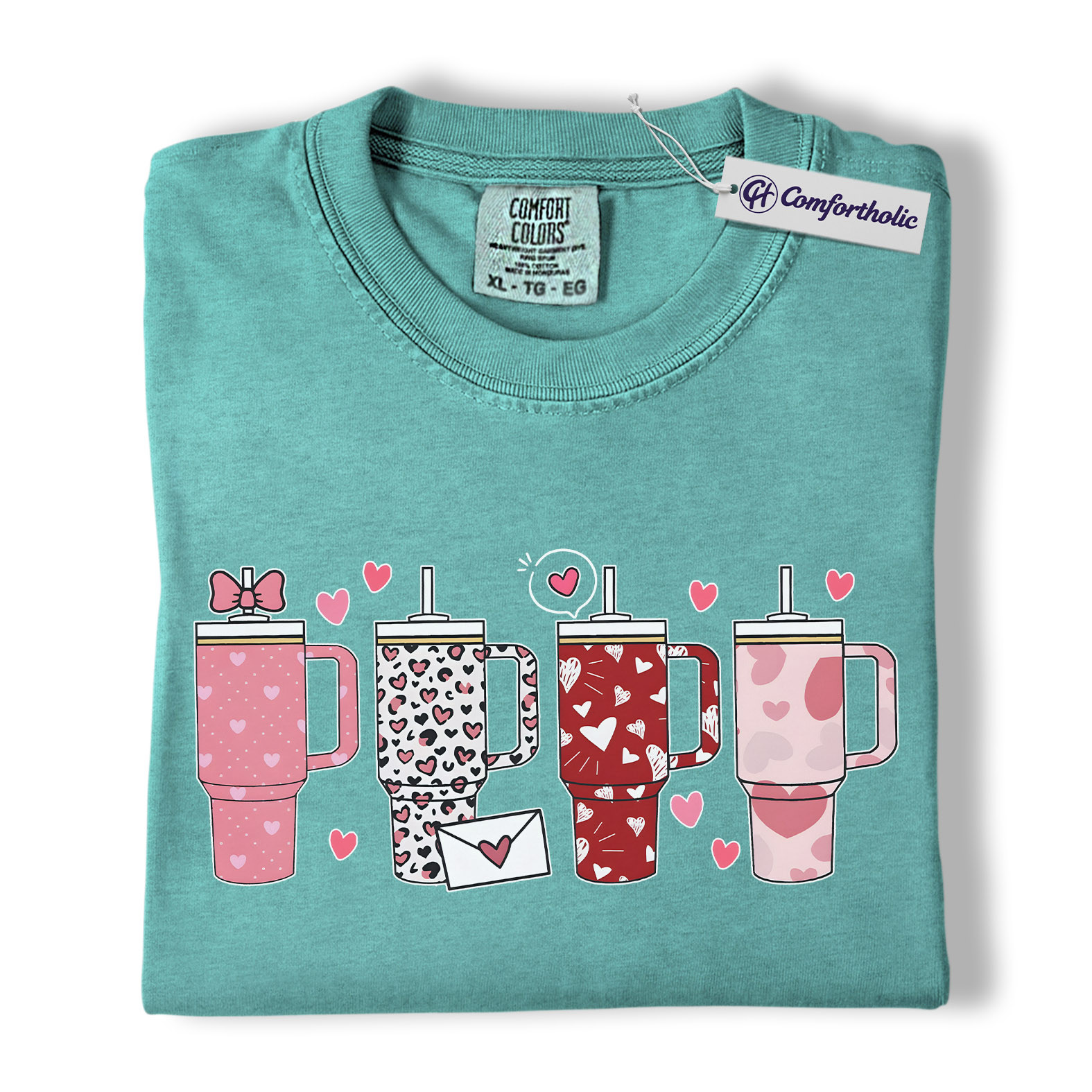 Valentine Tumbler Lover Shirt, Cute Pink Heart Stanley Cup Graphic Tee, Aesthetic Drink Print T-Shirt, Sweet Valentine Gift for Women, Comfort Colors Shirt
