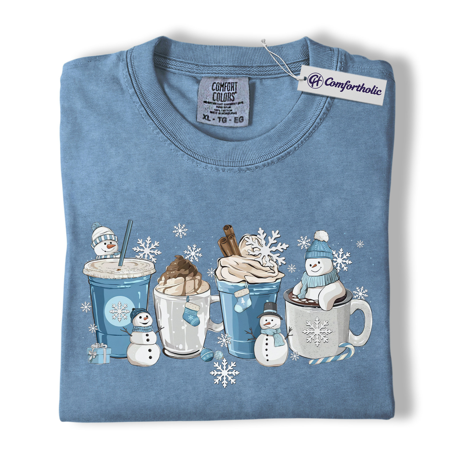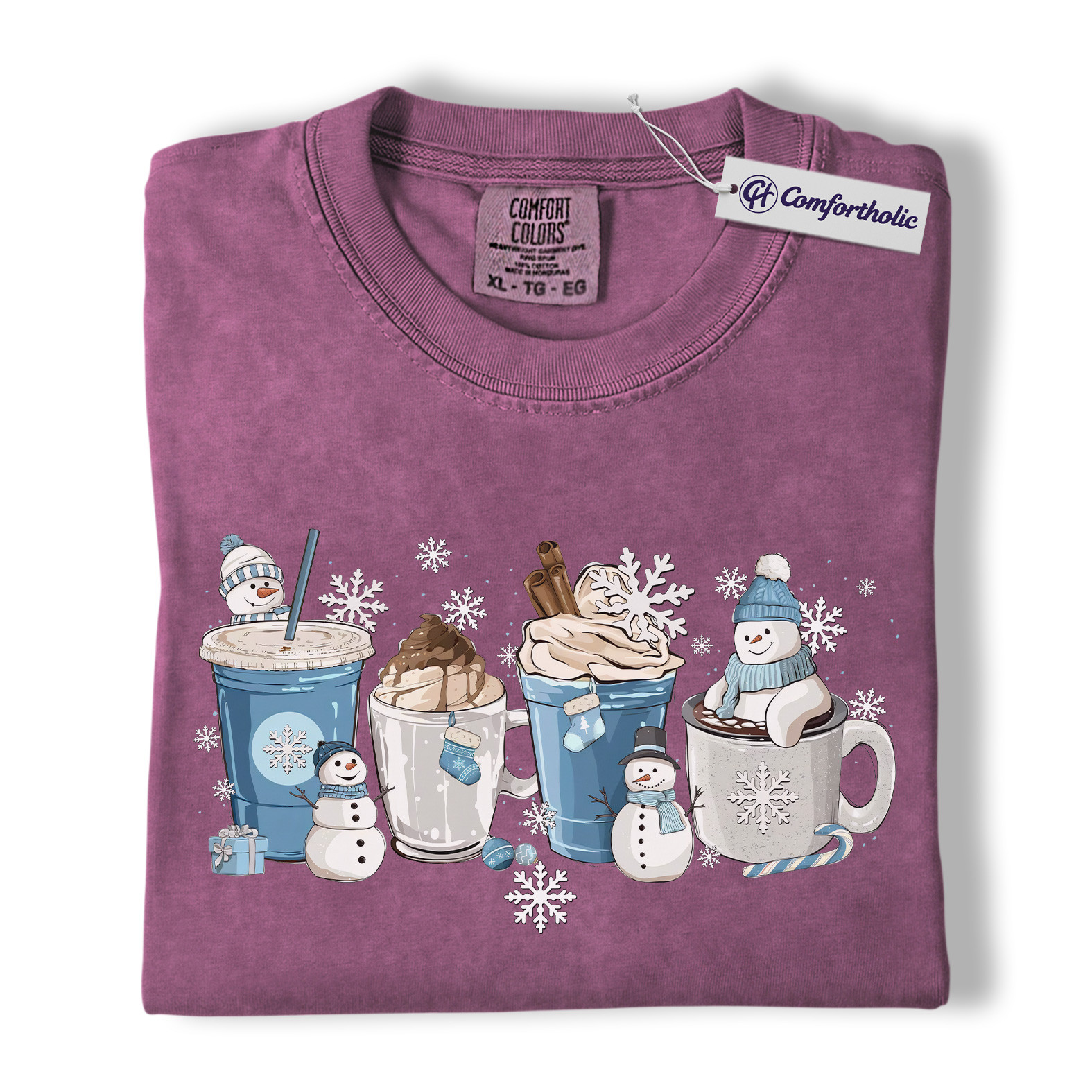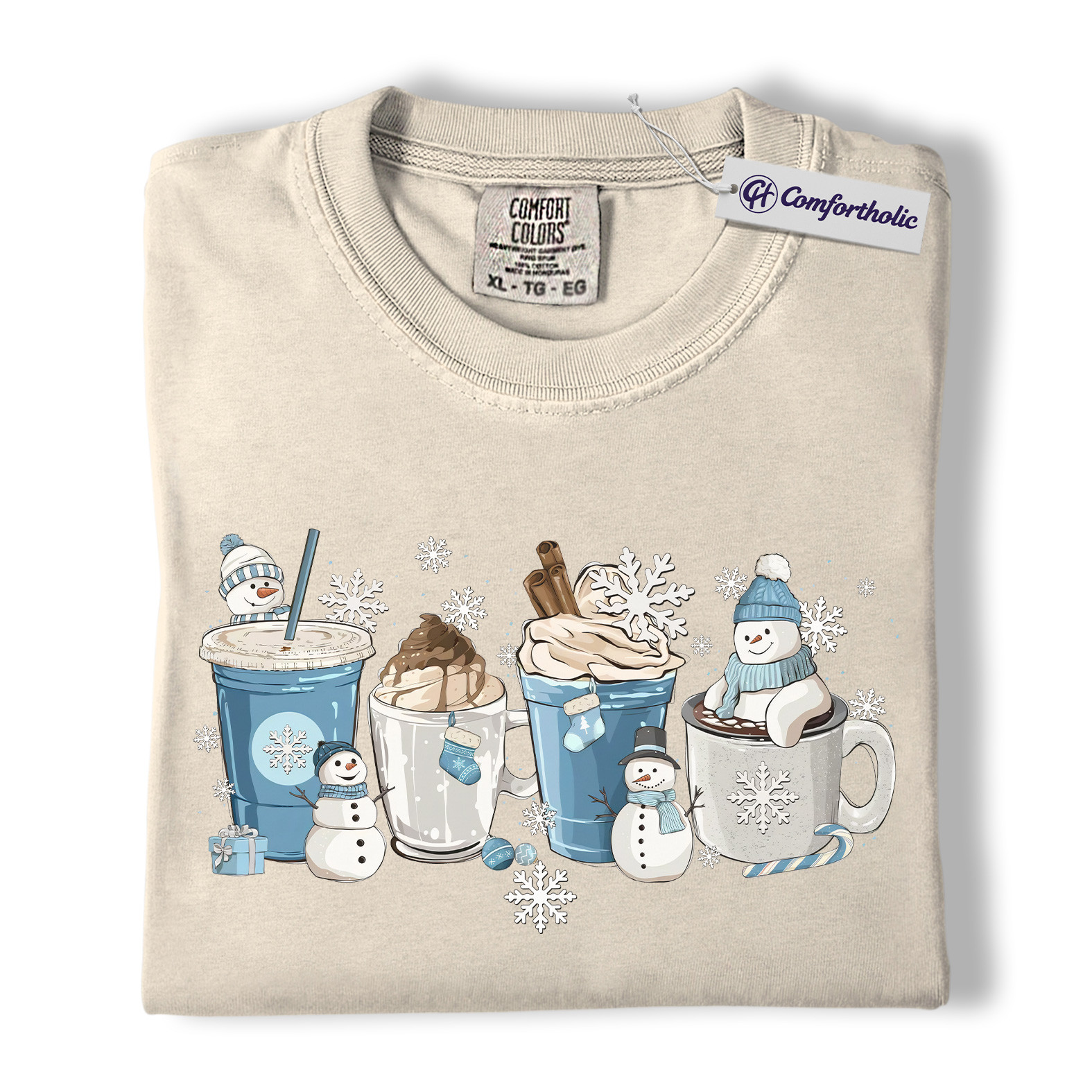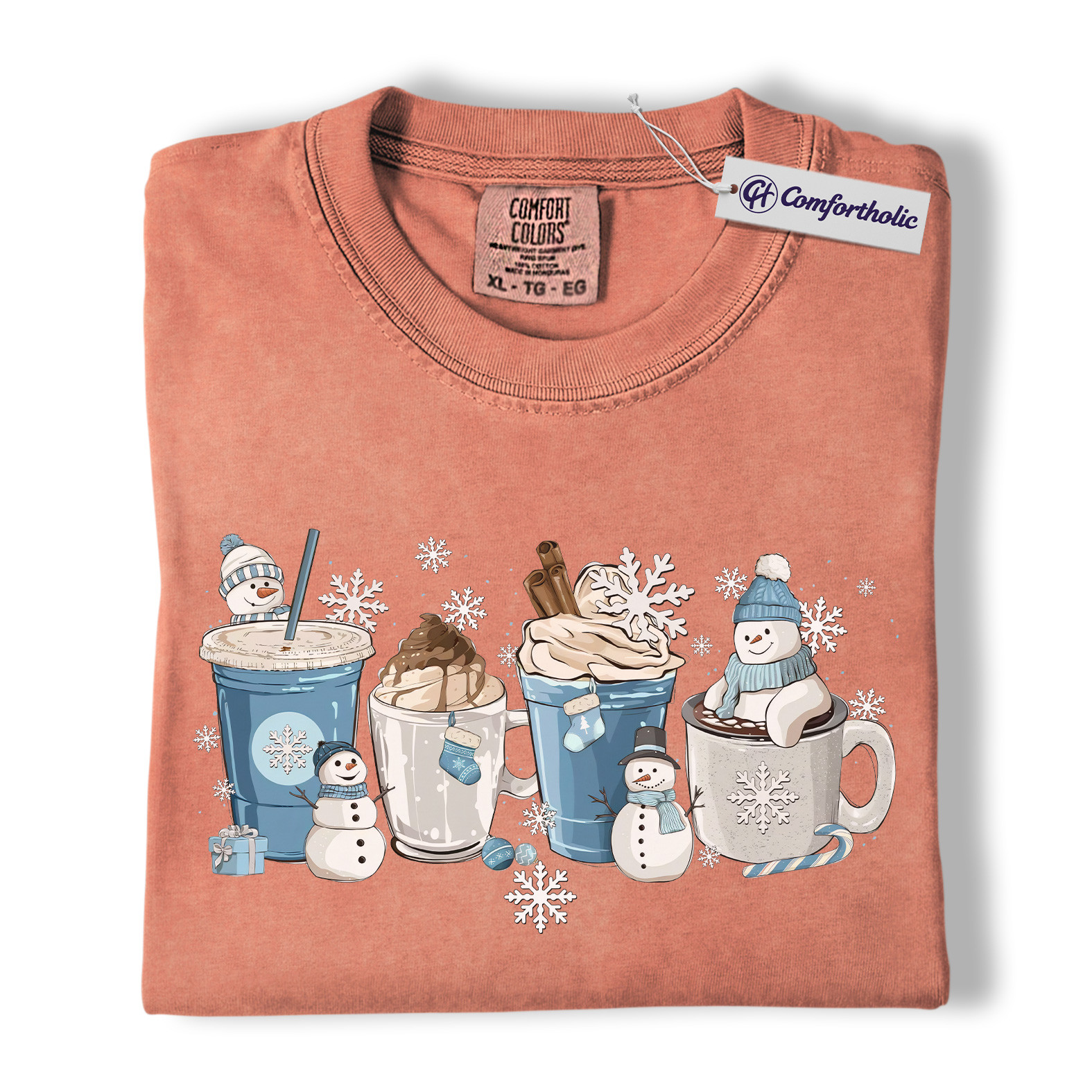 Winter Coffee Drinks Shirt, Snowman Coffee Lover T-Shirt, Cute Hot Cocoa Holiday Illustration Graphic Tee, Festive Winter Gift for Women, Christmas Comfort Colors Shirt