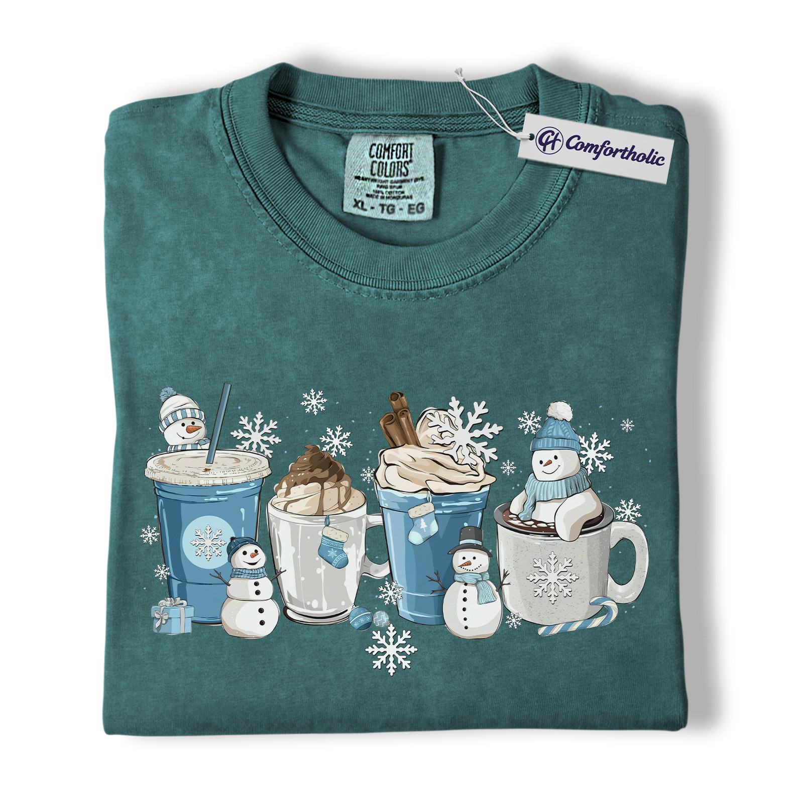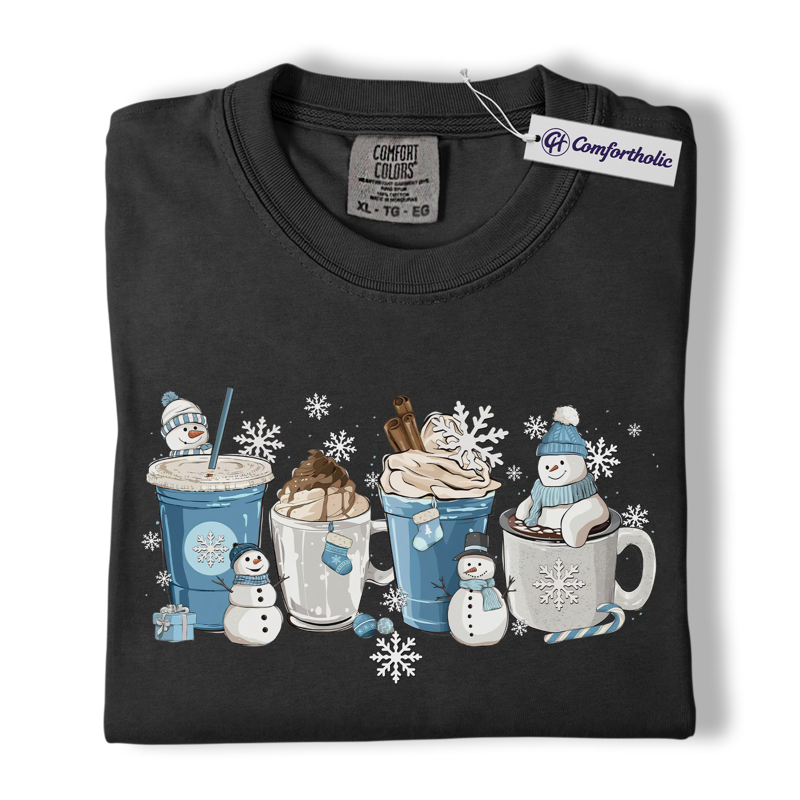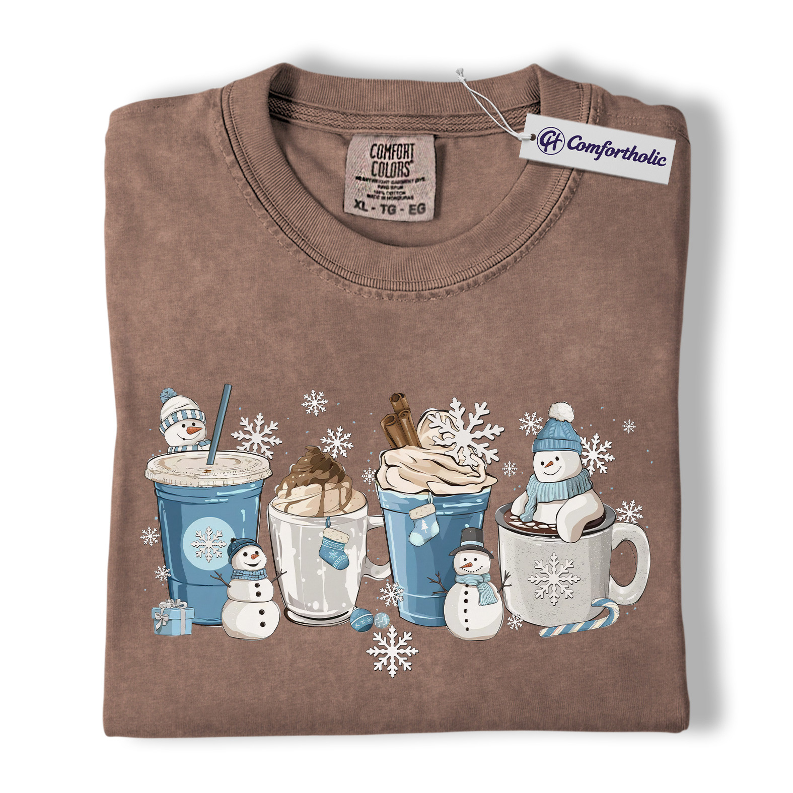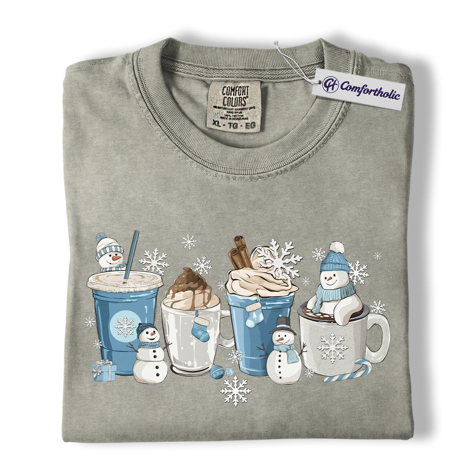 Winter Coffee Drinks Shirt, Snowman Coffee Lover T-Shirt, Cute Hot Cocoa Holiday Illustration Graphic Tee, Festive Winter Gift for Women, Christmas Comfort Colors Shirt