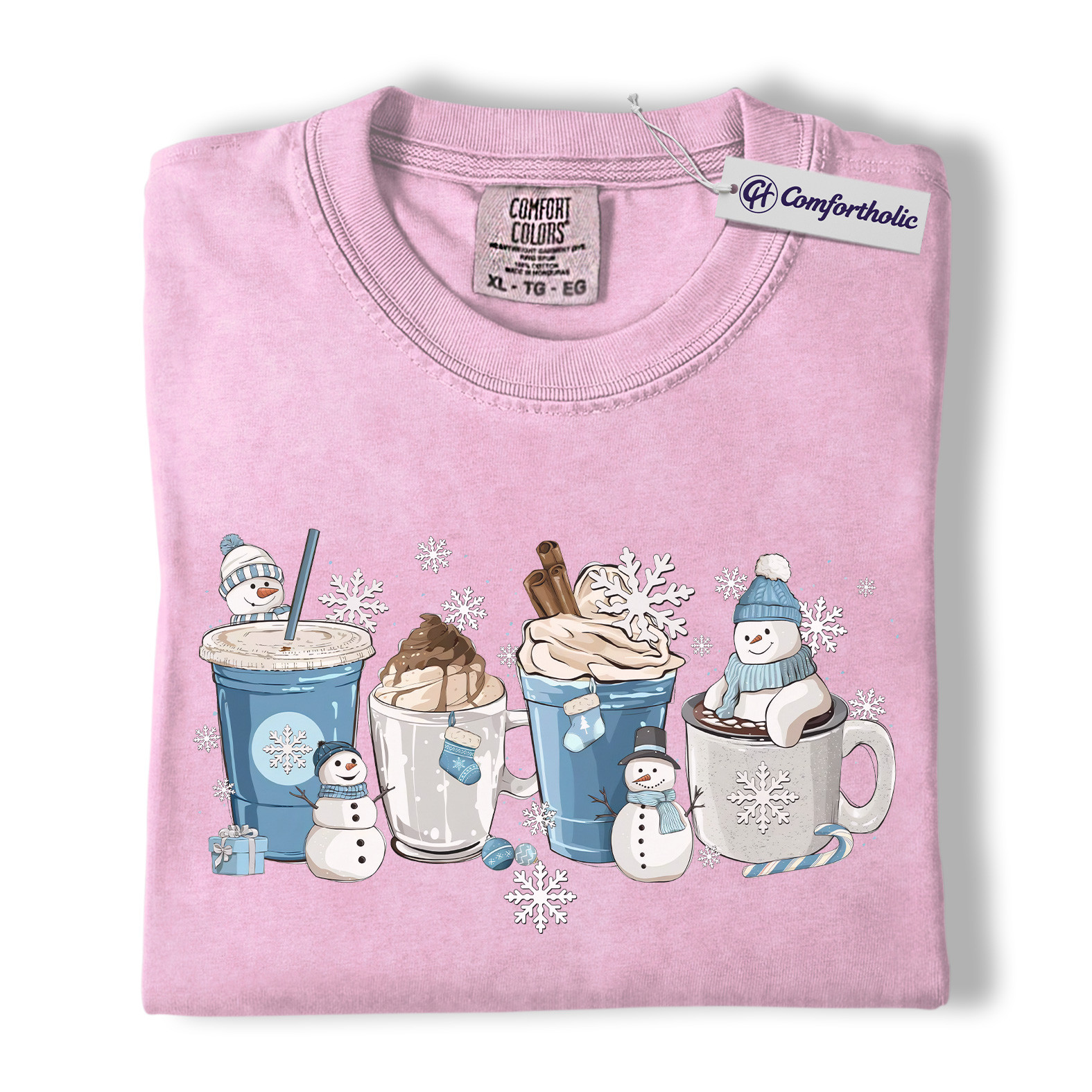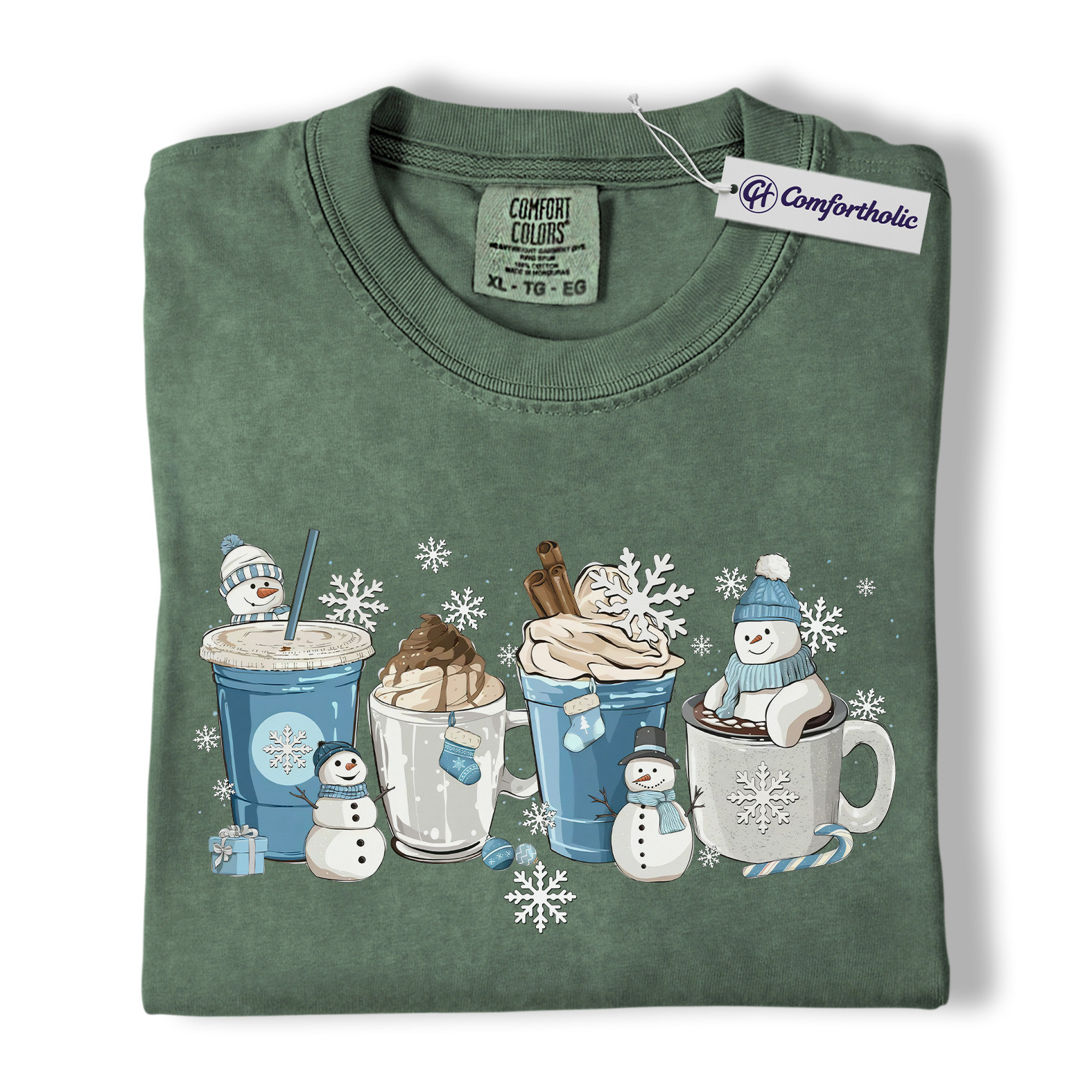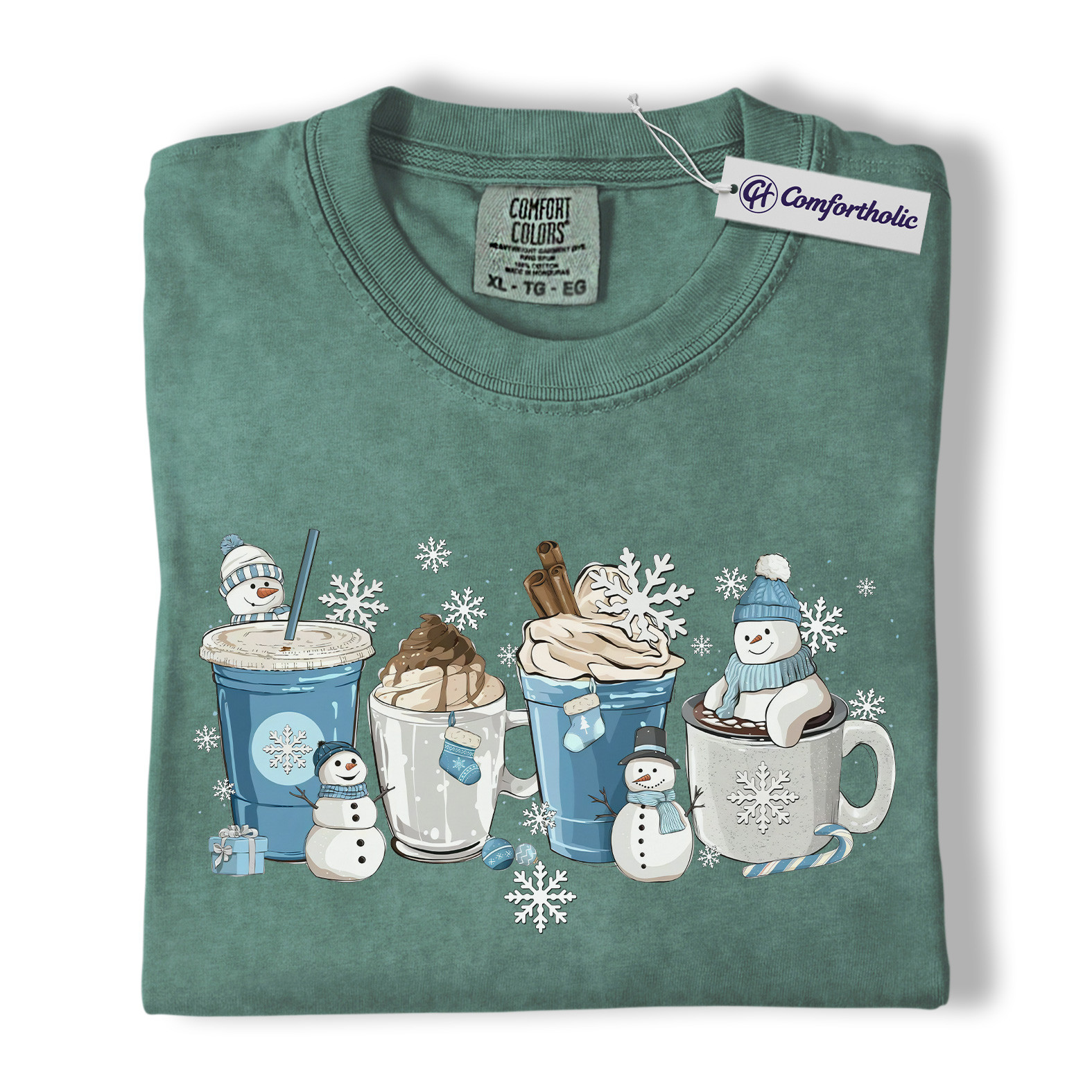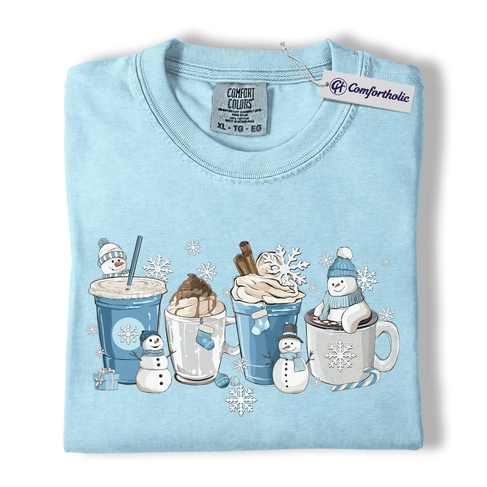 Winter Coffee Drinks Shirt, Snowman Coffee Lover T-Shirt, Cute Hot Cocoa Holiday Illustration Graphic Tee, Festive Winter Gift for Women, Christmas Comfort Colors Shirt