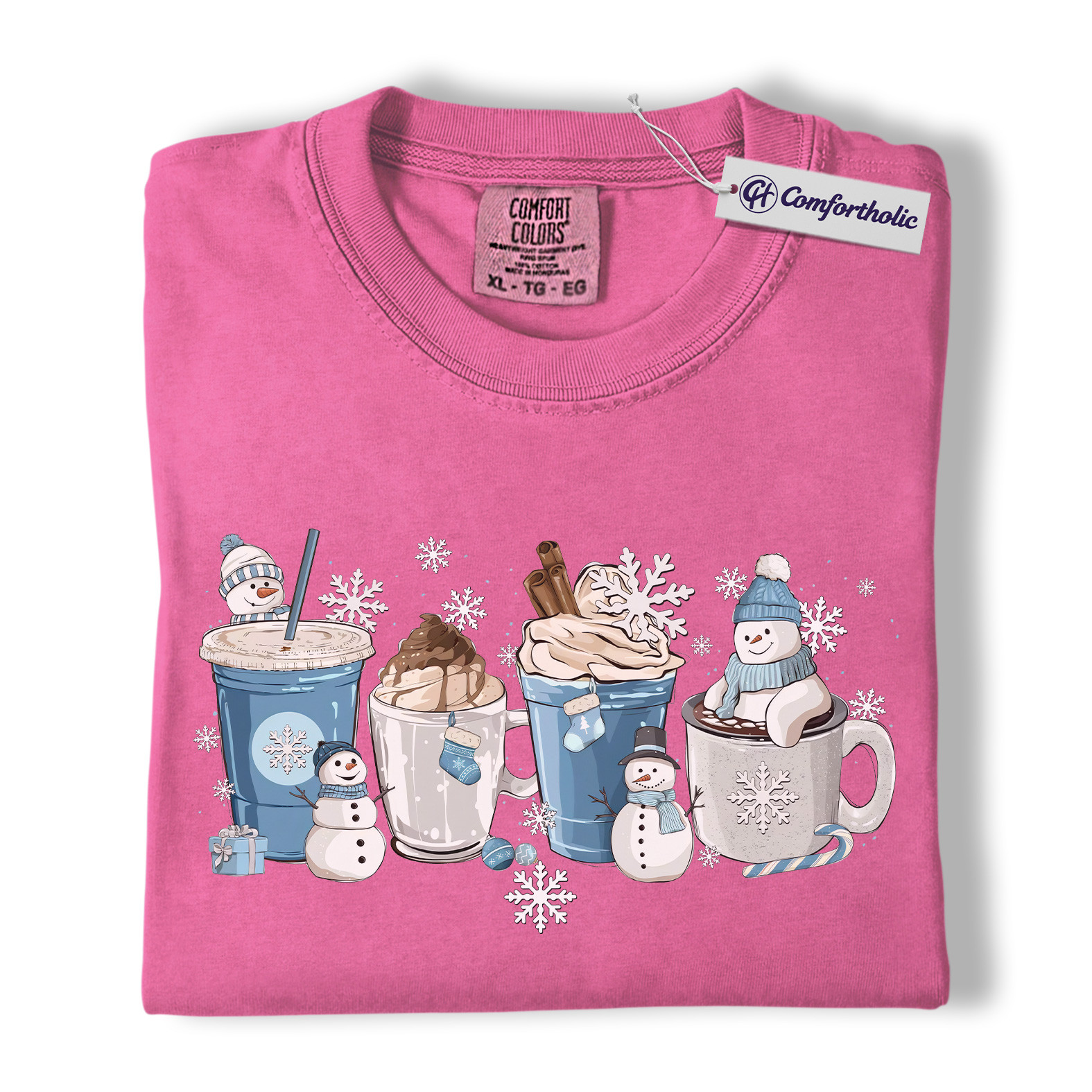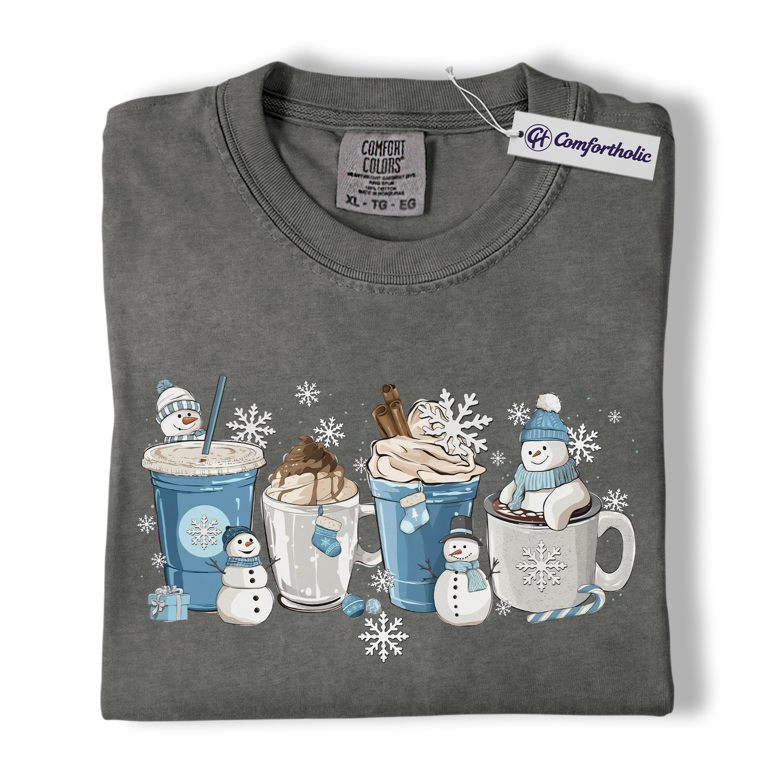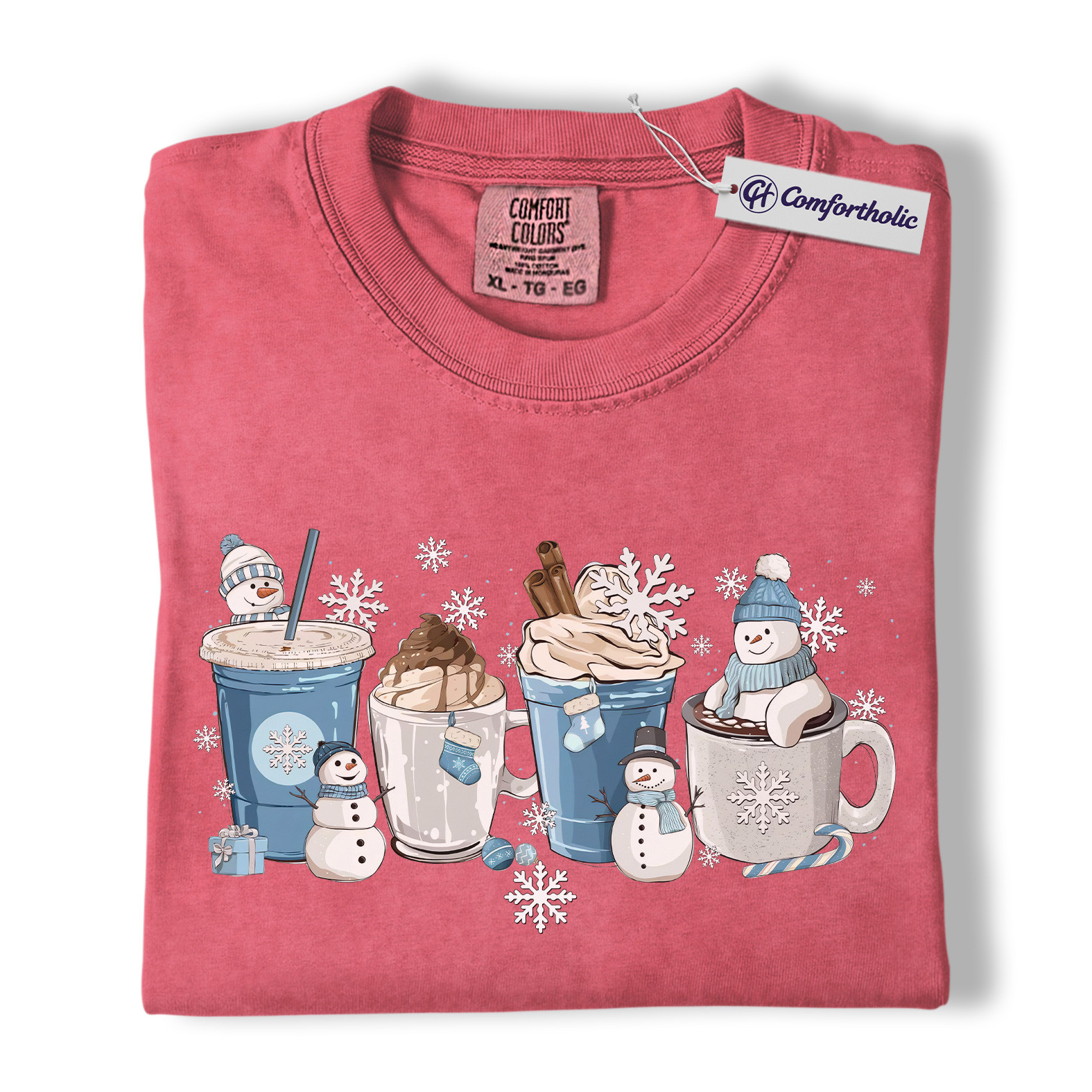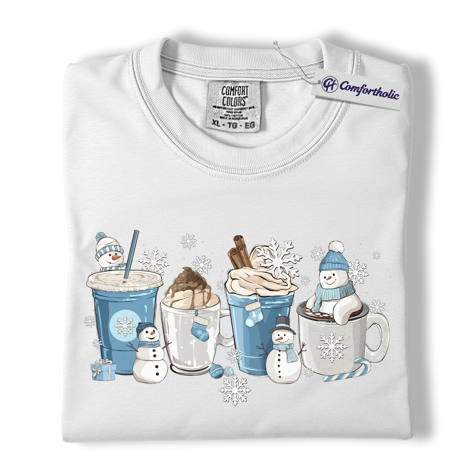 Winter Coffee Drinks Shirt, Snowman Coffee Lover T-Shirt, Cute Hot Cocoa Holiday Illustration Graphic Tee, Festive Winter Gift for Women, Christmas Comfort Colors Shirt