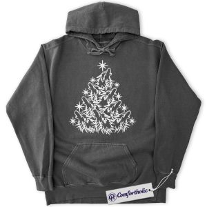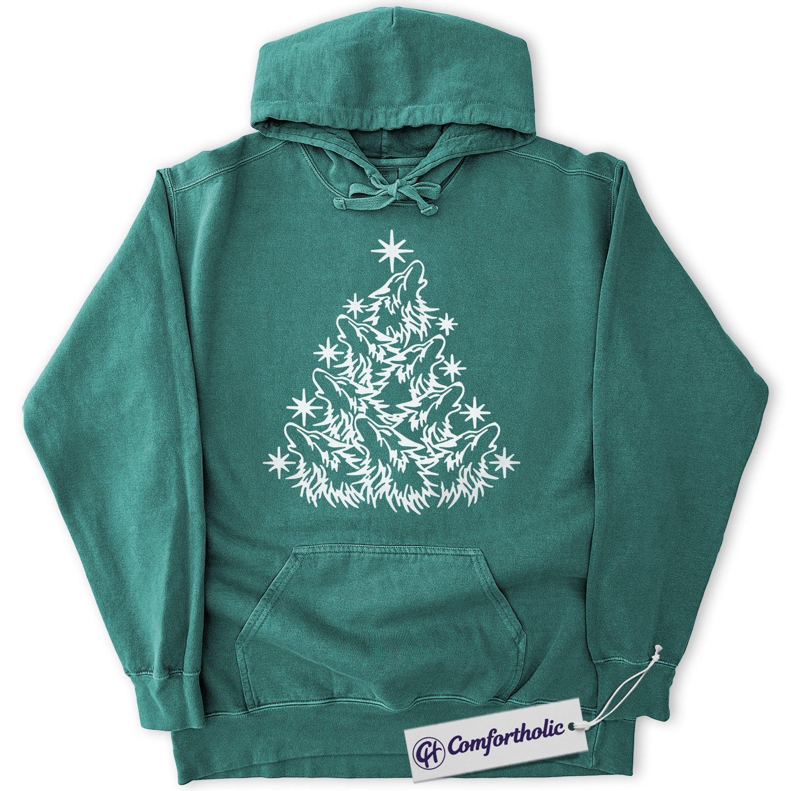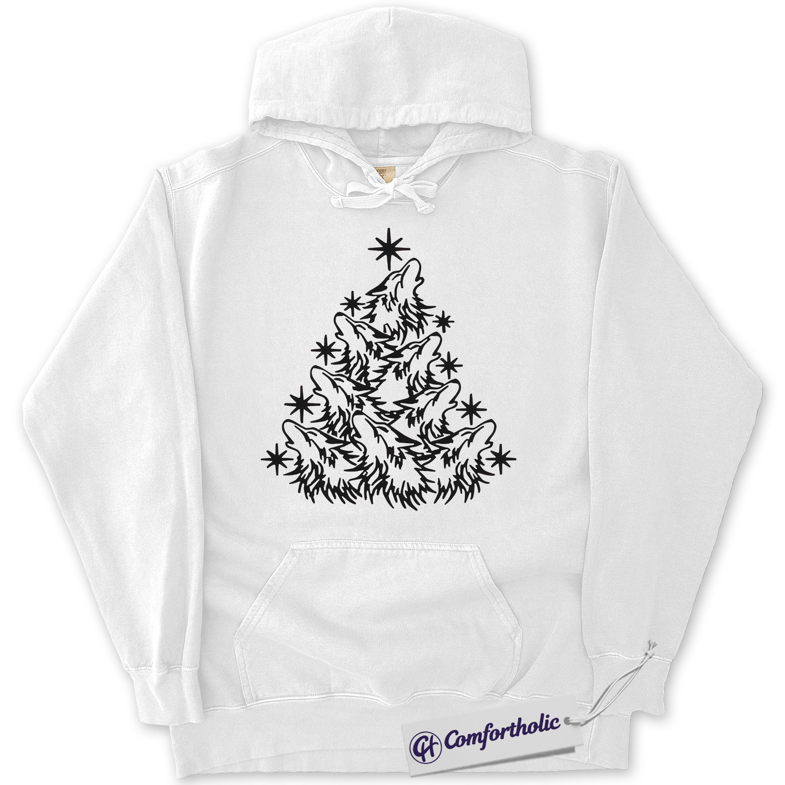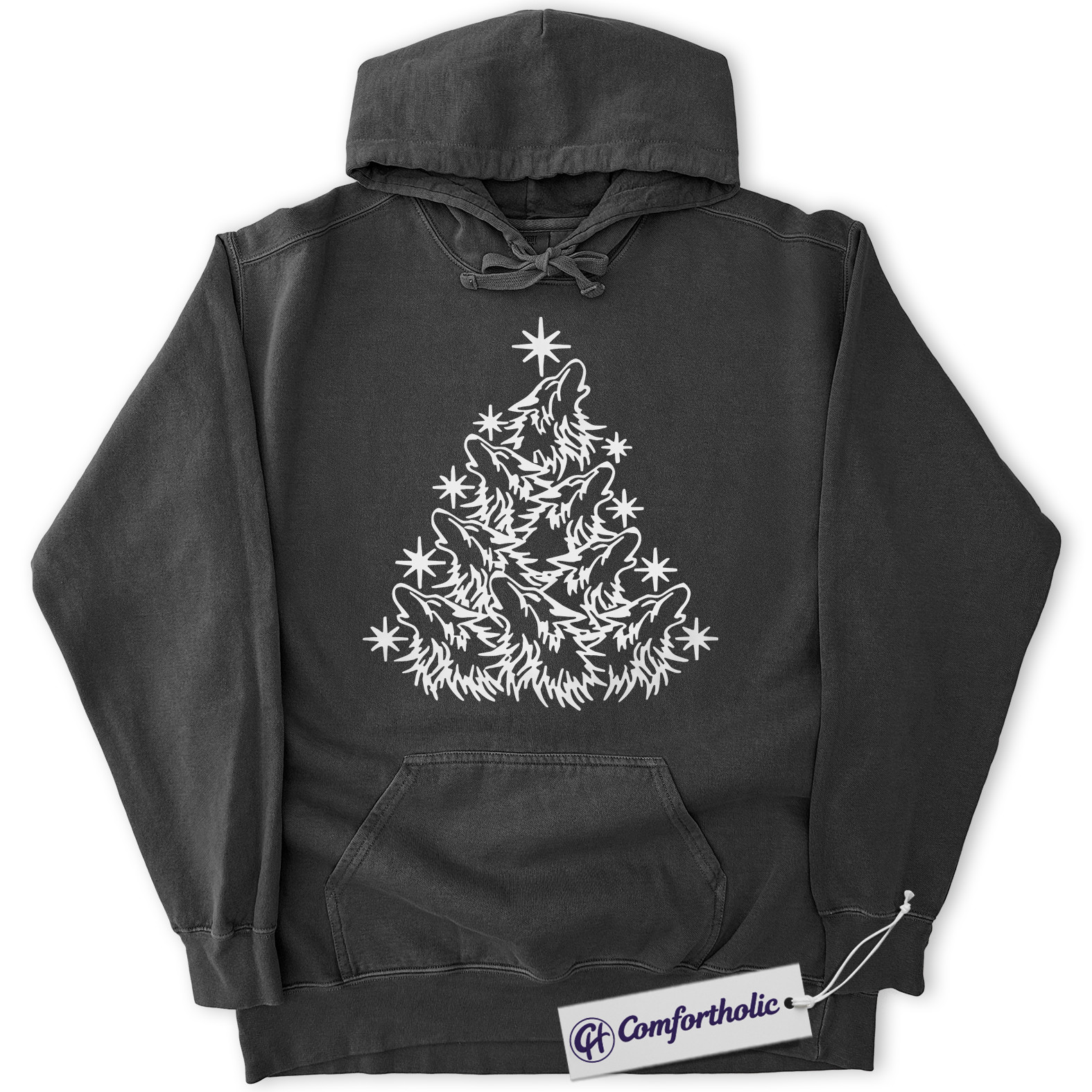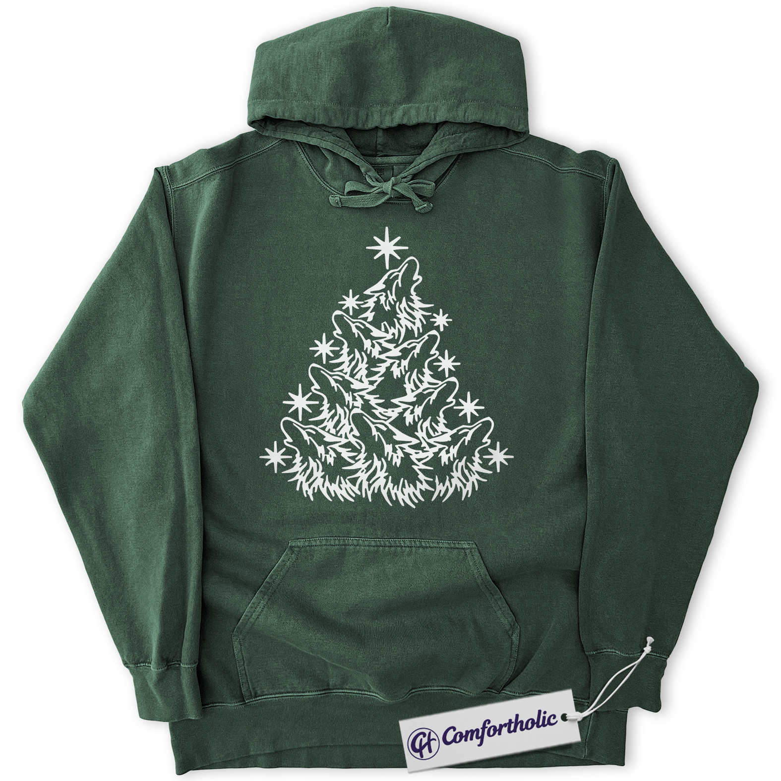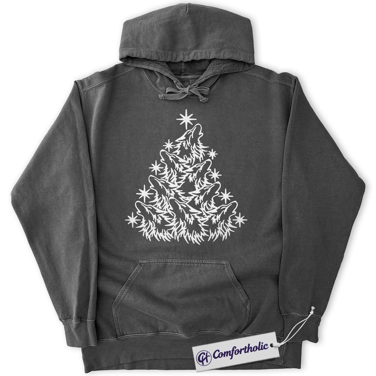 Wolf Christmas Tree Hoodie, Wild Animal Holiday Hoodie, Minimalist Nature Lover Graphic Pullover, Rustic Gift for Wolf Lovers, Christmas Comfort Colors Hoodie