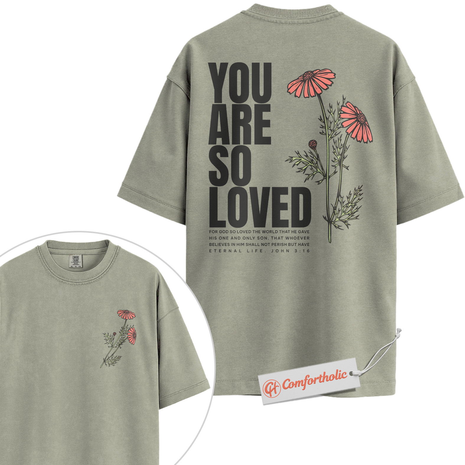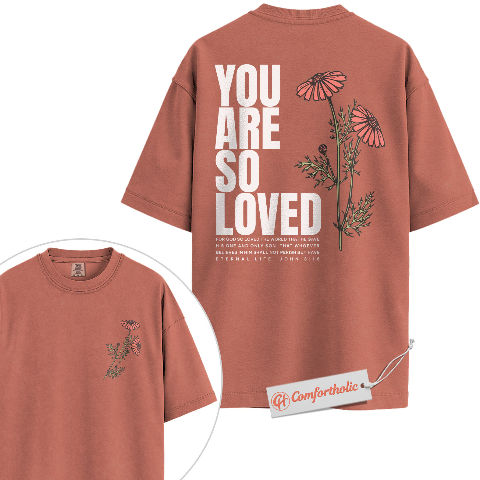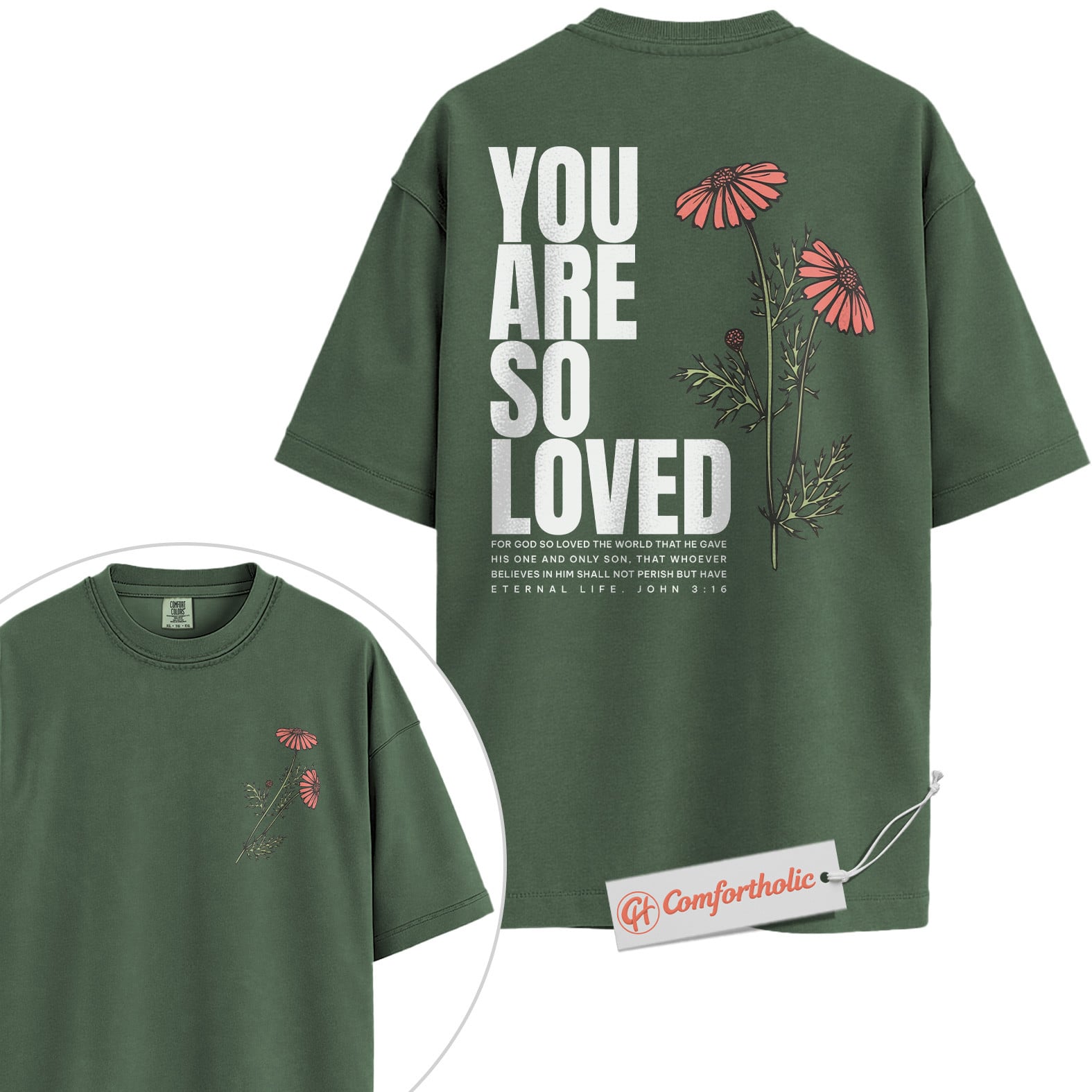 You Are So Loved Shirt, John 3:16 Bible Verse T-Shirt, Christian Floral Graphic Tee, Encouragement Gift, Faith-Based Comfort Colors Shirt 2-Sided